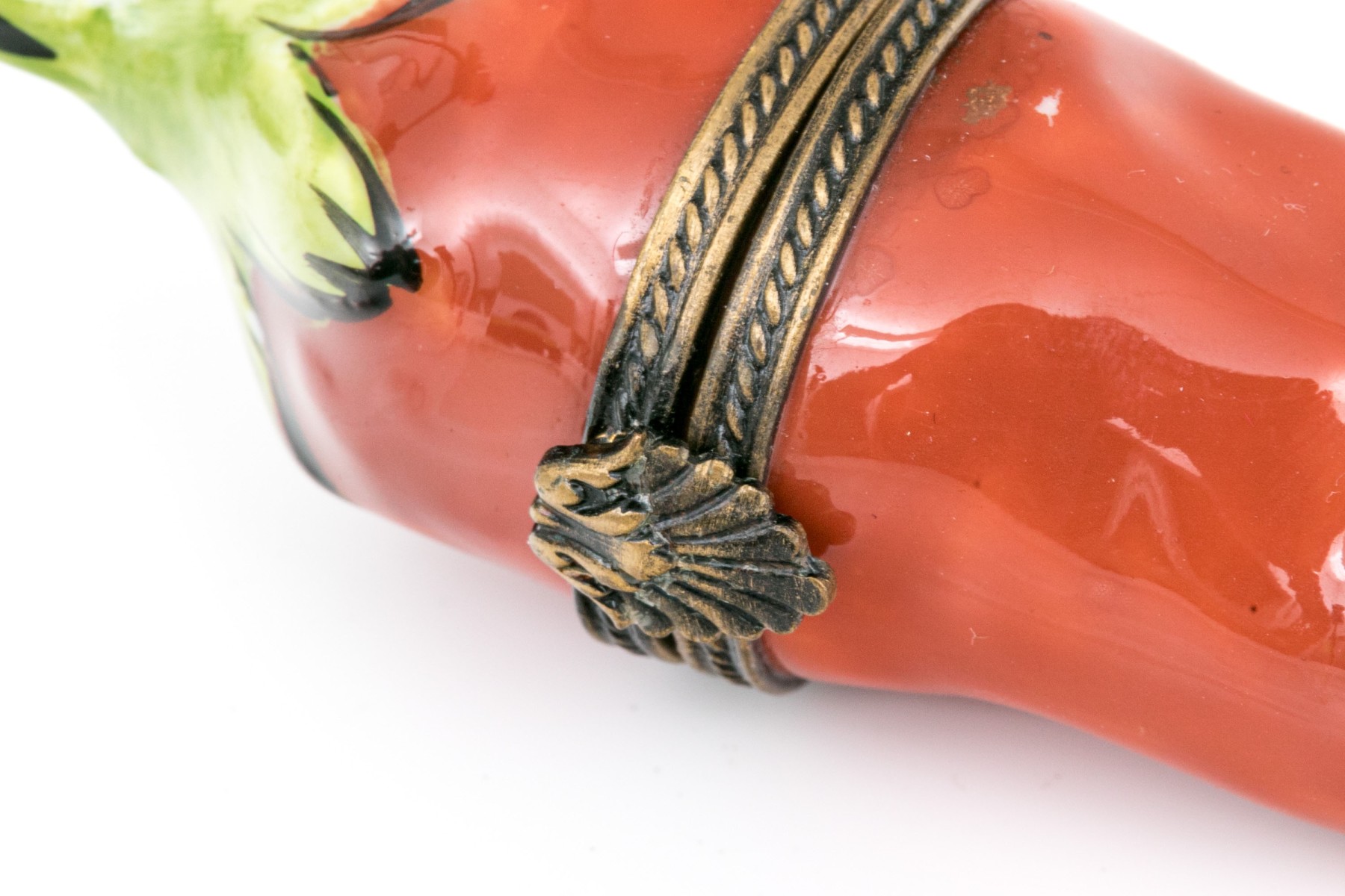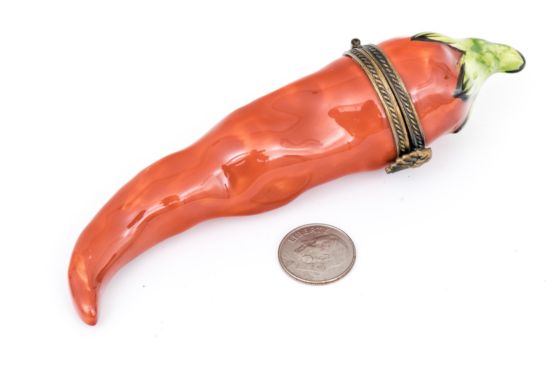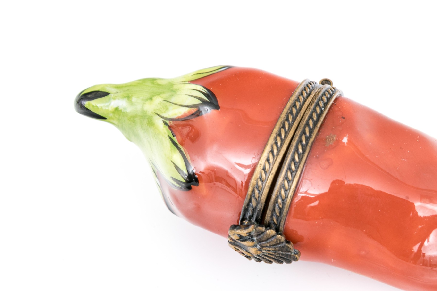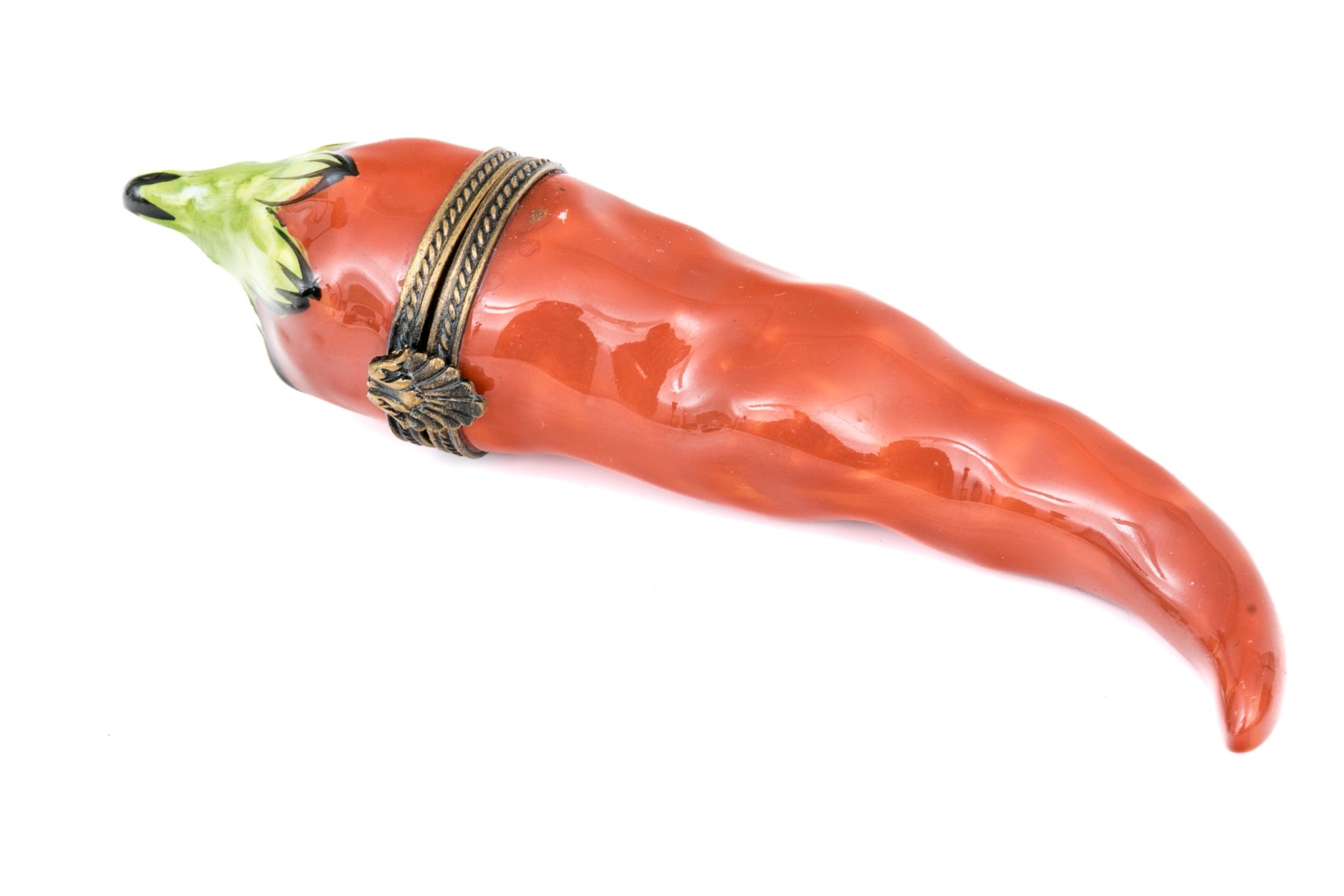 A cute red chili pepper form box with patinated mounts.