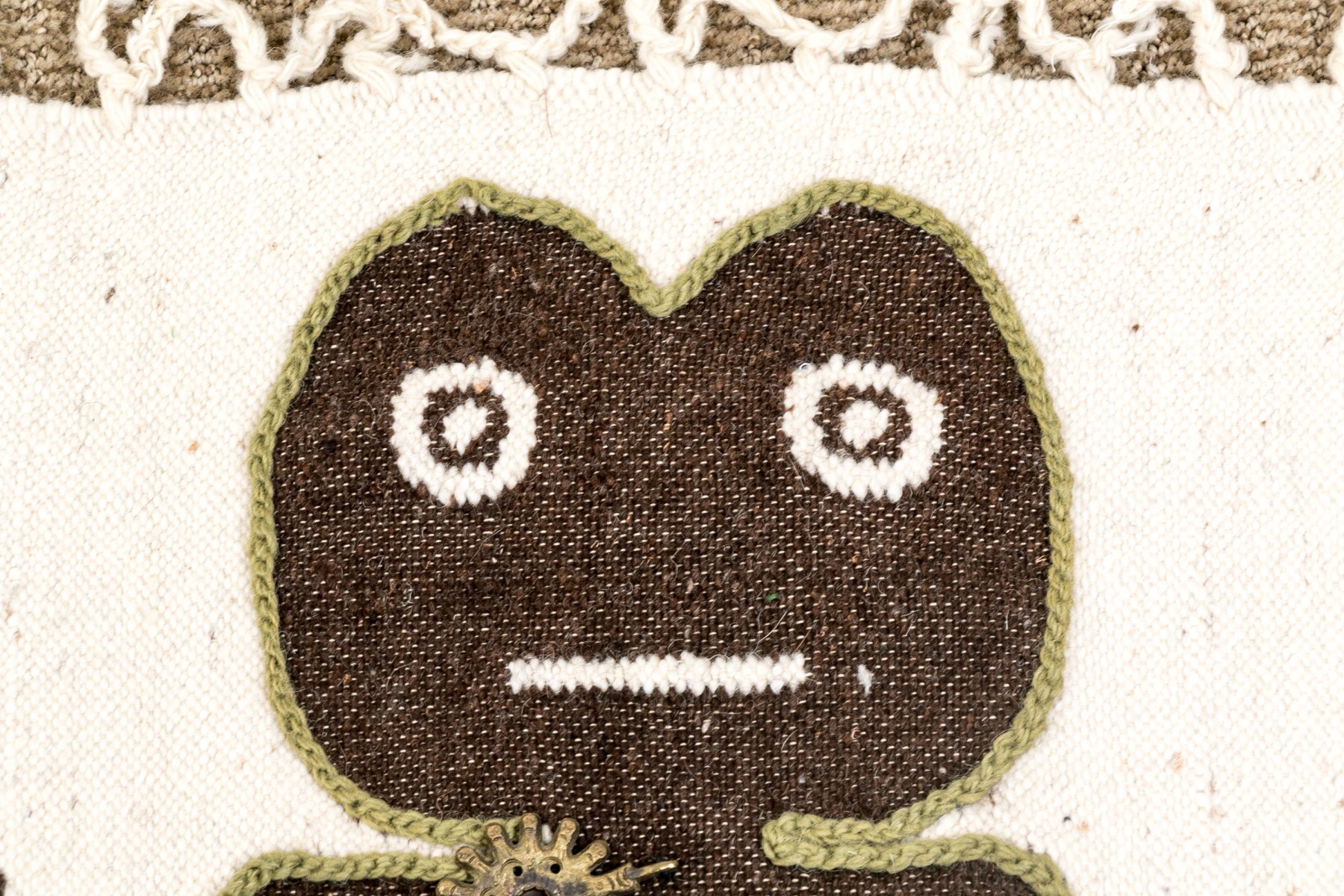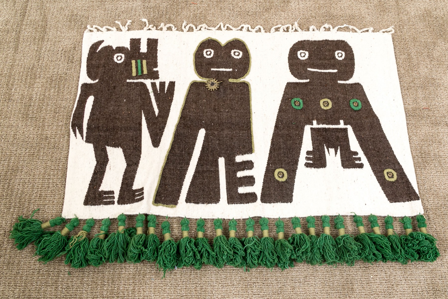 Center figure is wearing sewn brass jeweled ameuet Condition: Some of the top knotted rings are torn. Dimensions: 32 1/2” H x 44” W
