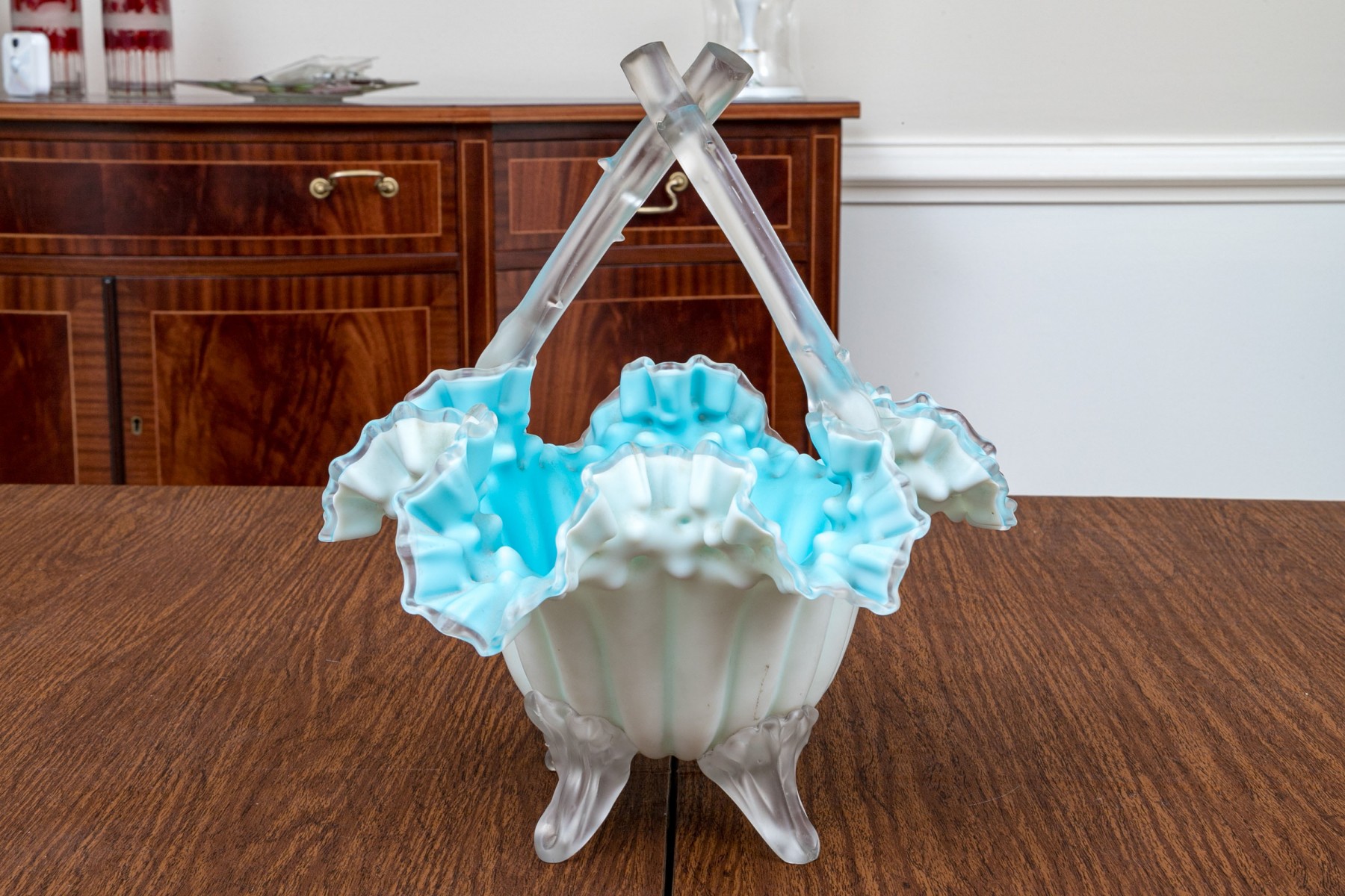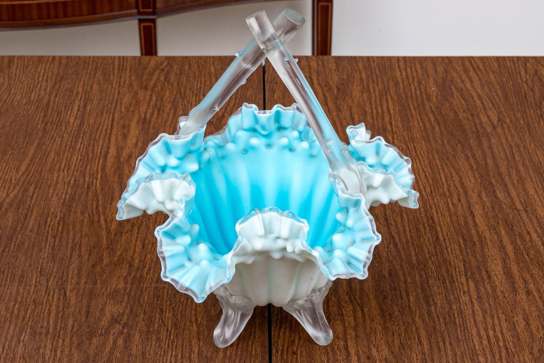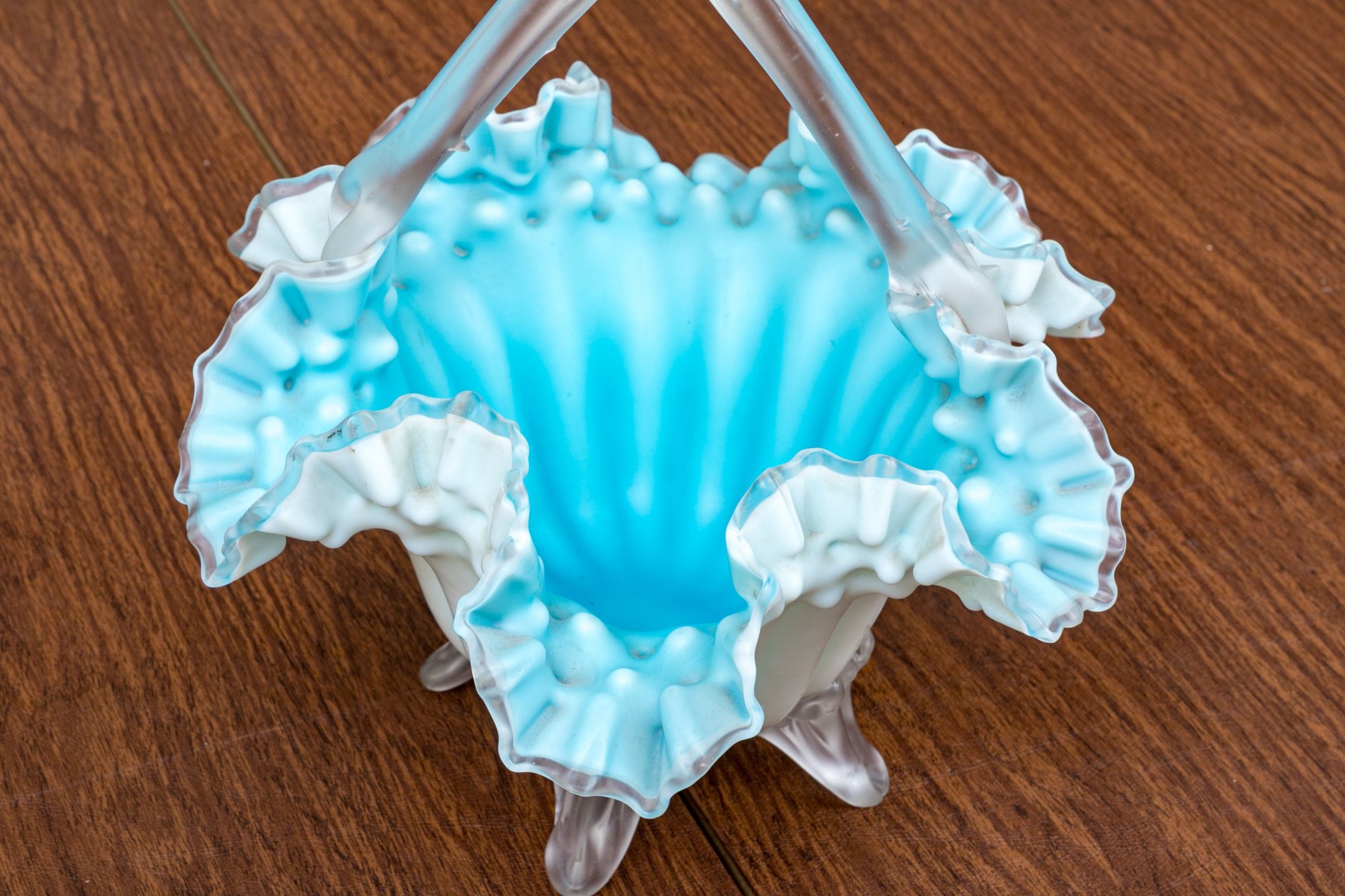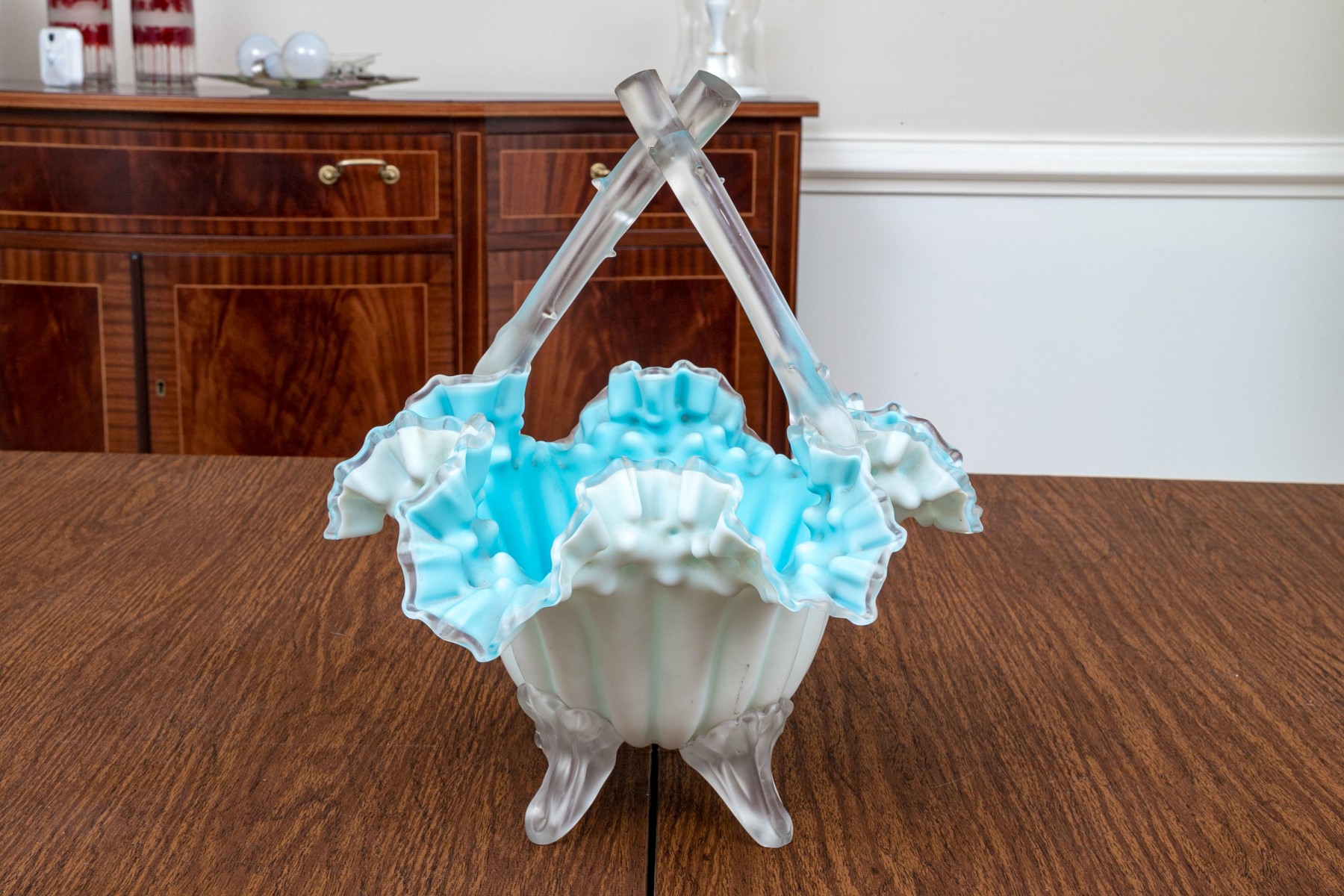 With blue tint and wonderful ruffled, fluted bowl raised on four feet with a handle overtop.