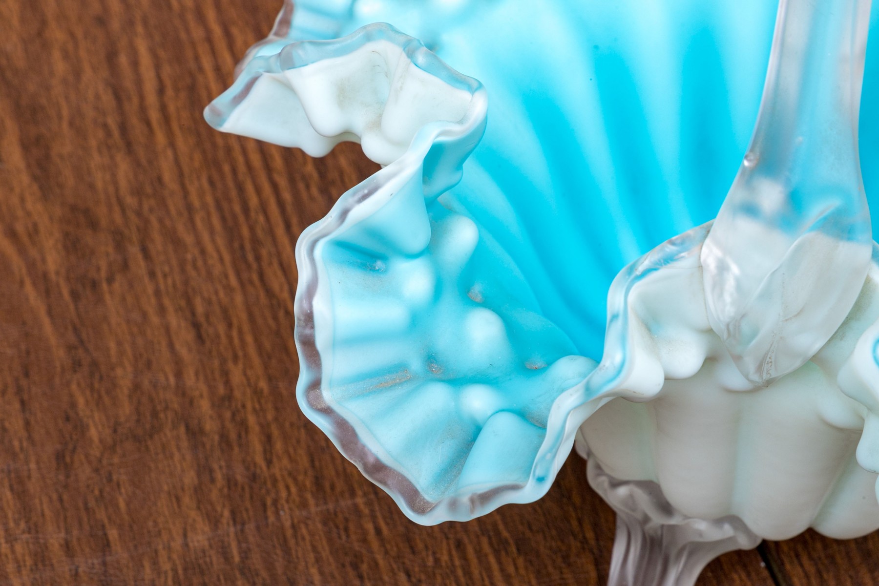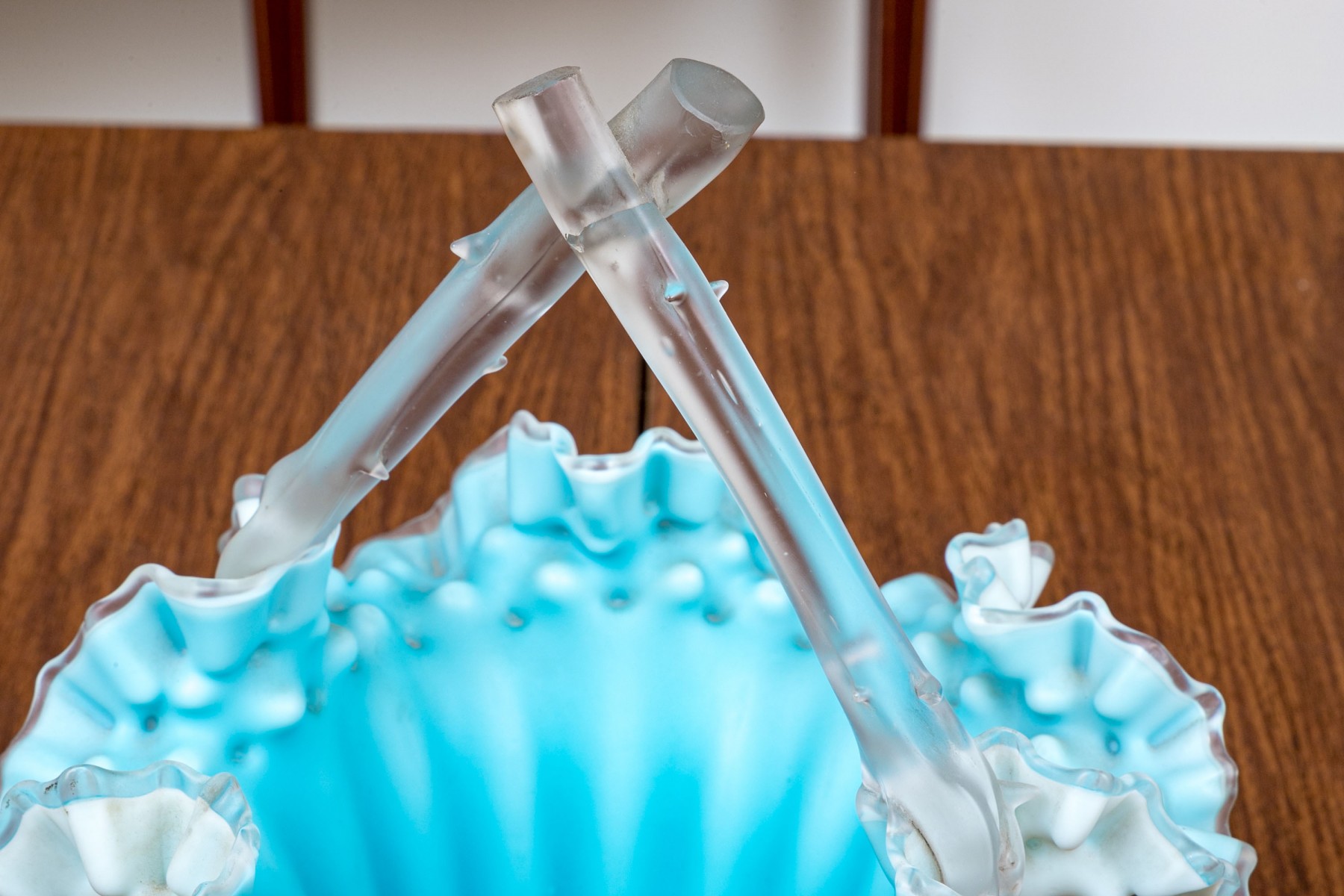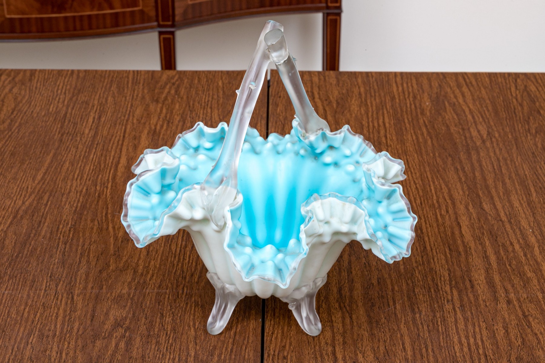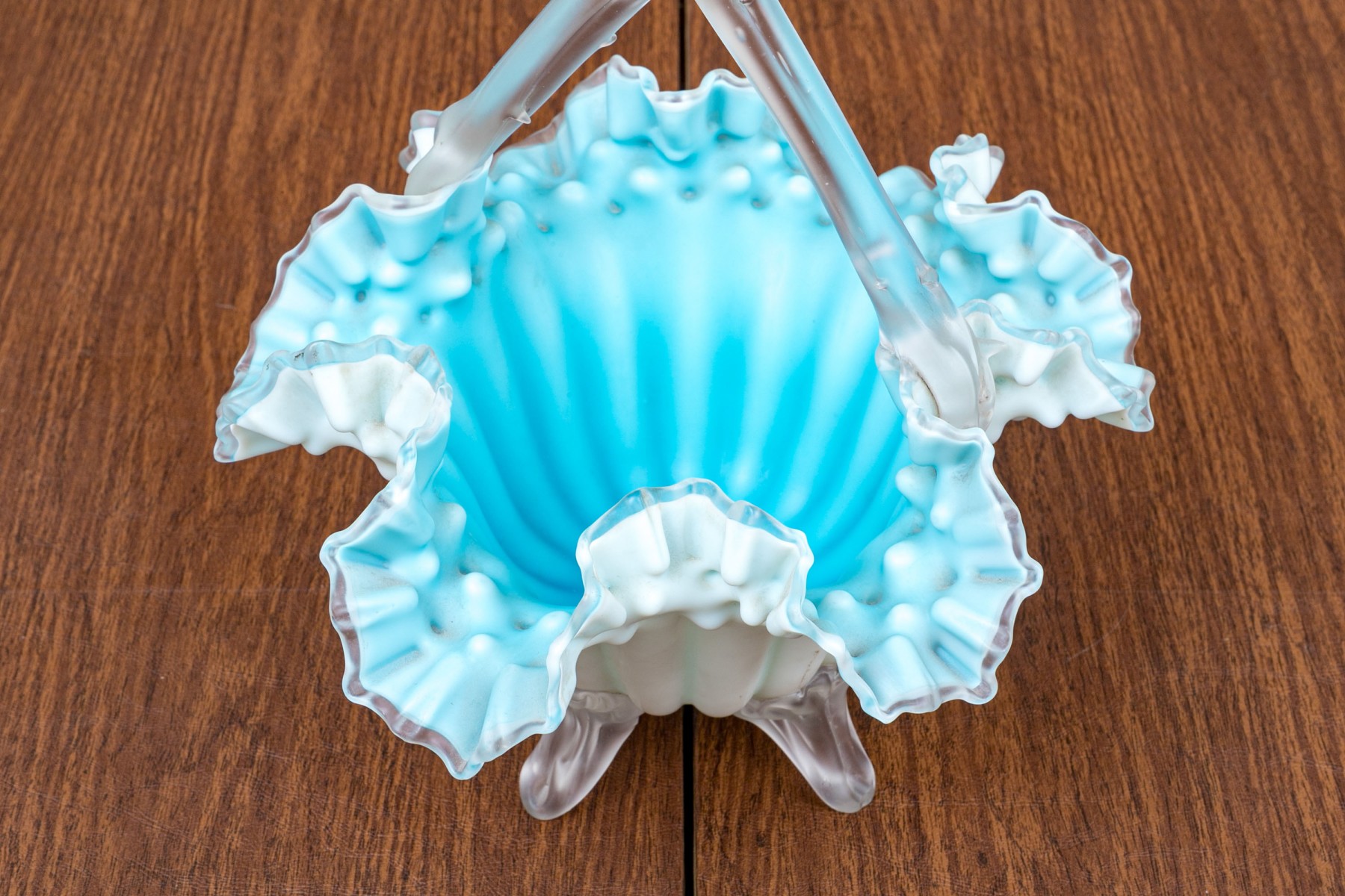 With blue tint and wonderful ruffled, fluted bowl raised on four feet with a handle overtop.