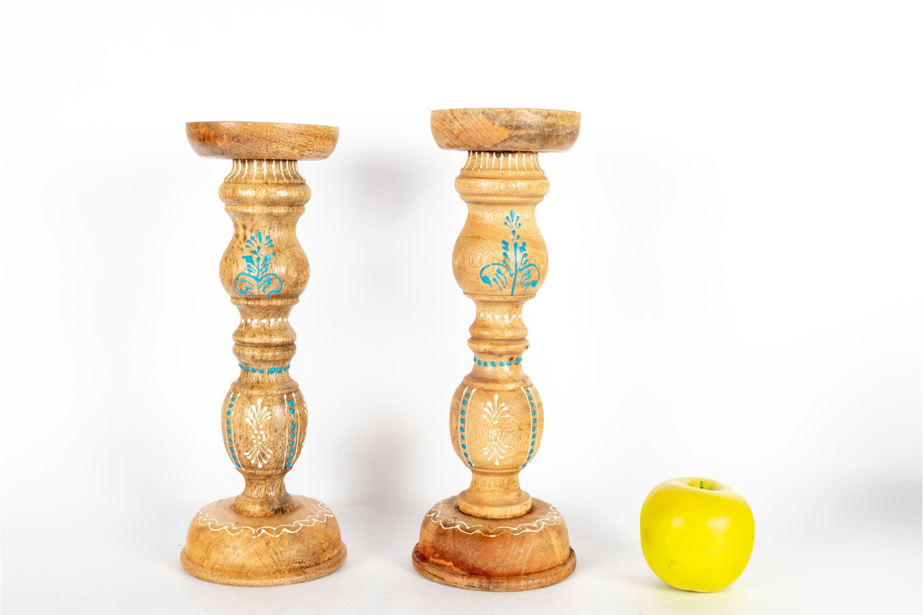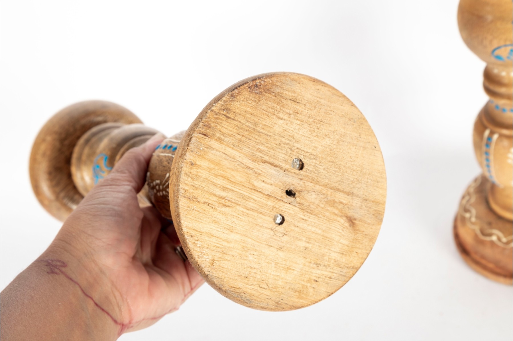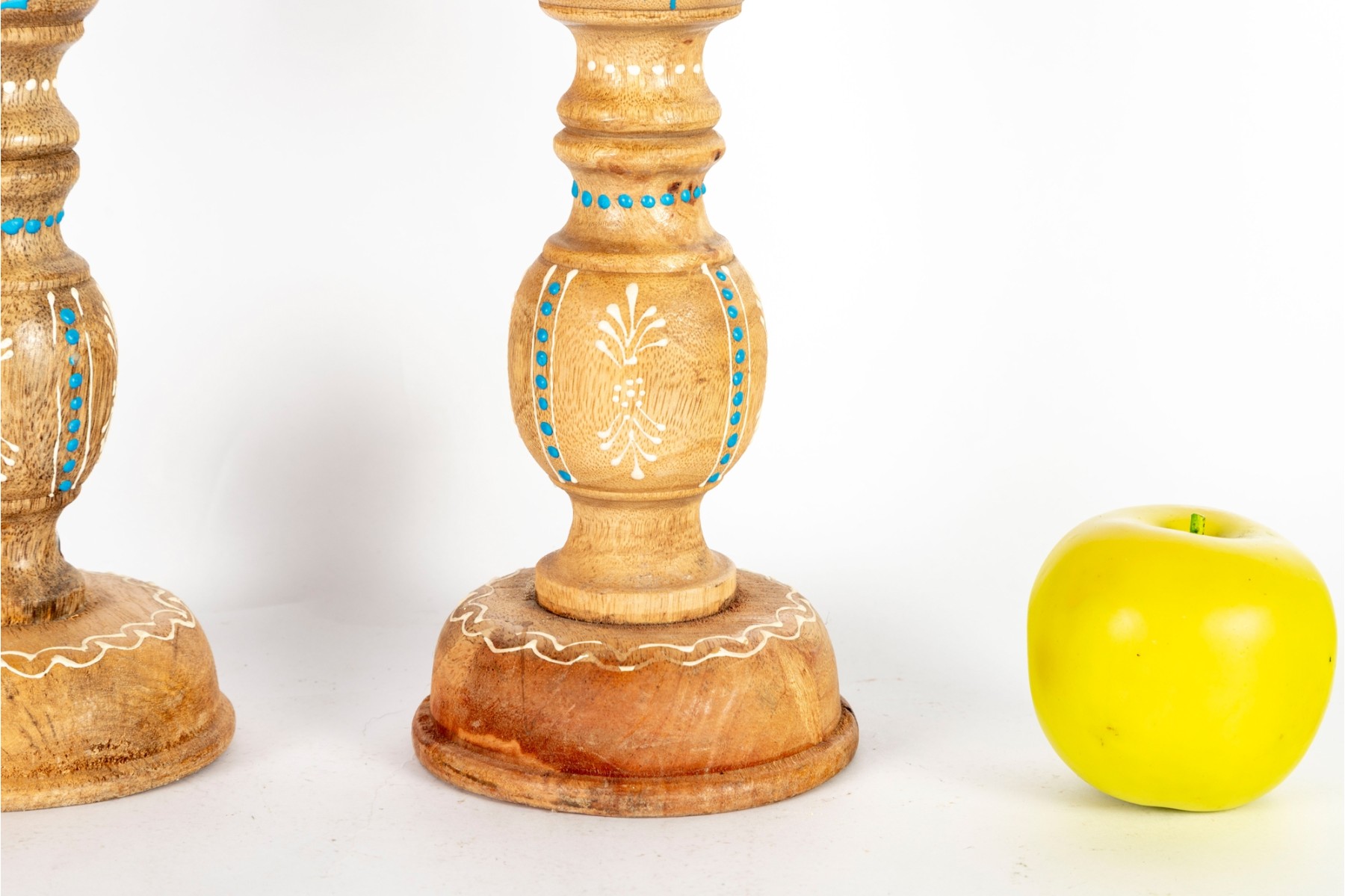 A pair of artisanal hand-painted, lathe-turned wood candlestick holders.