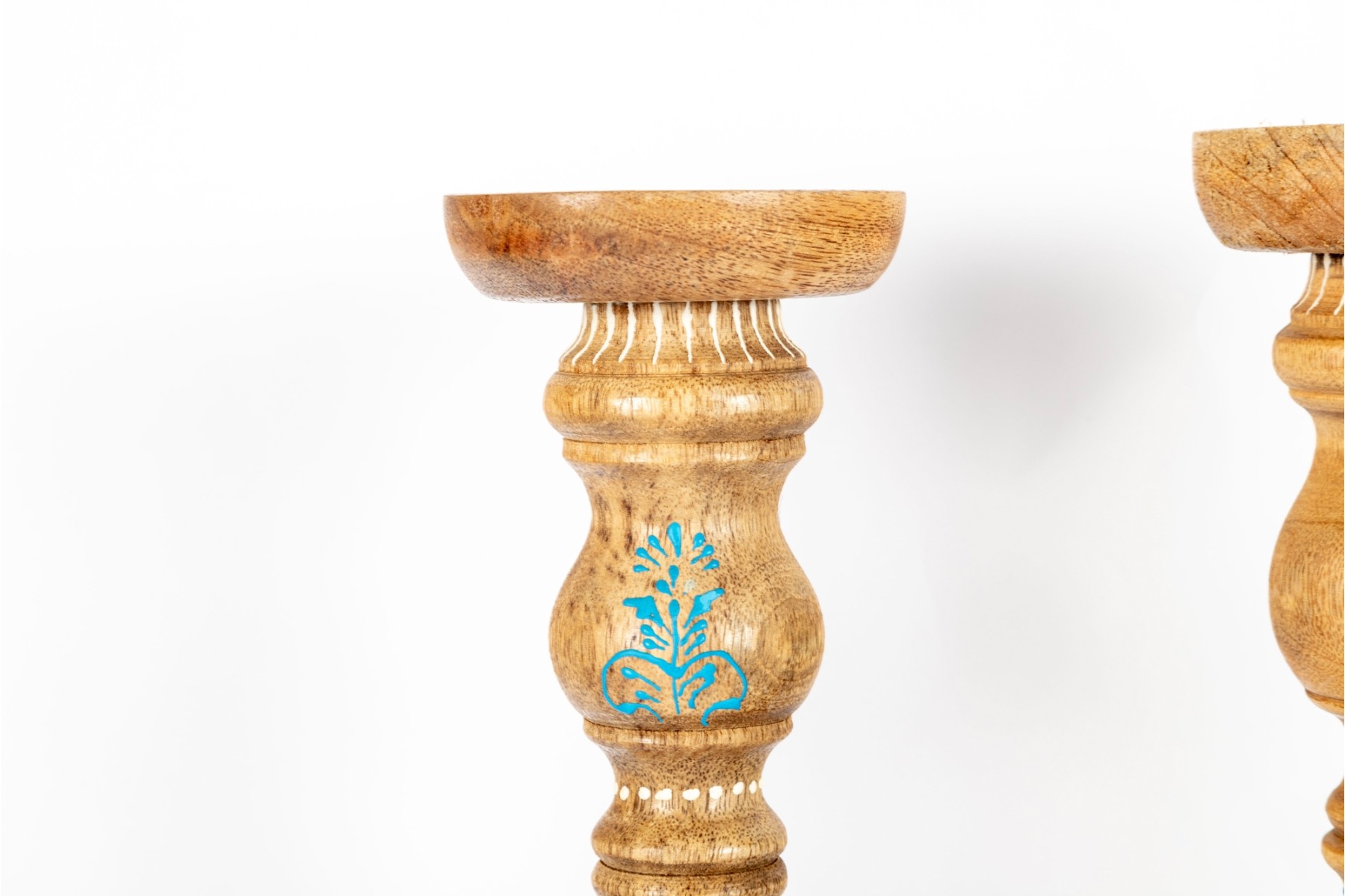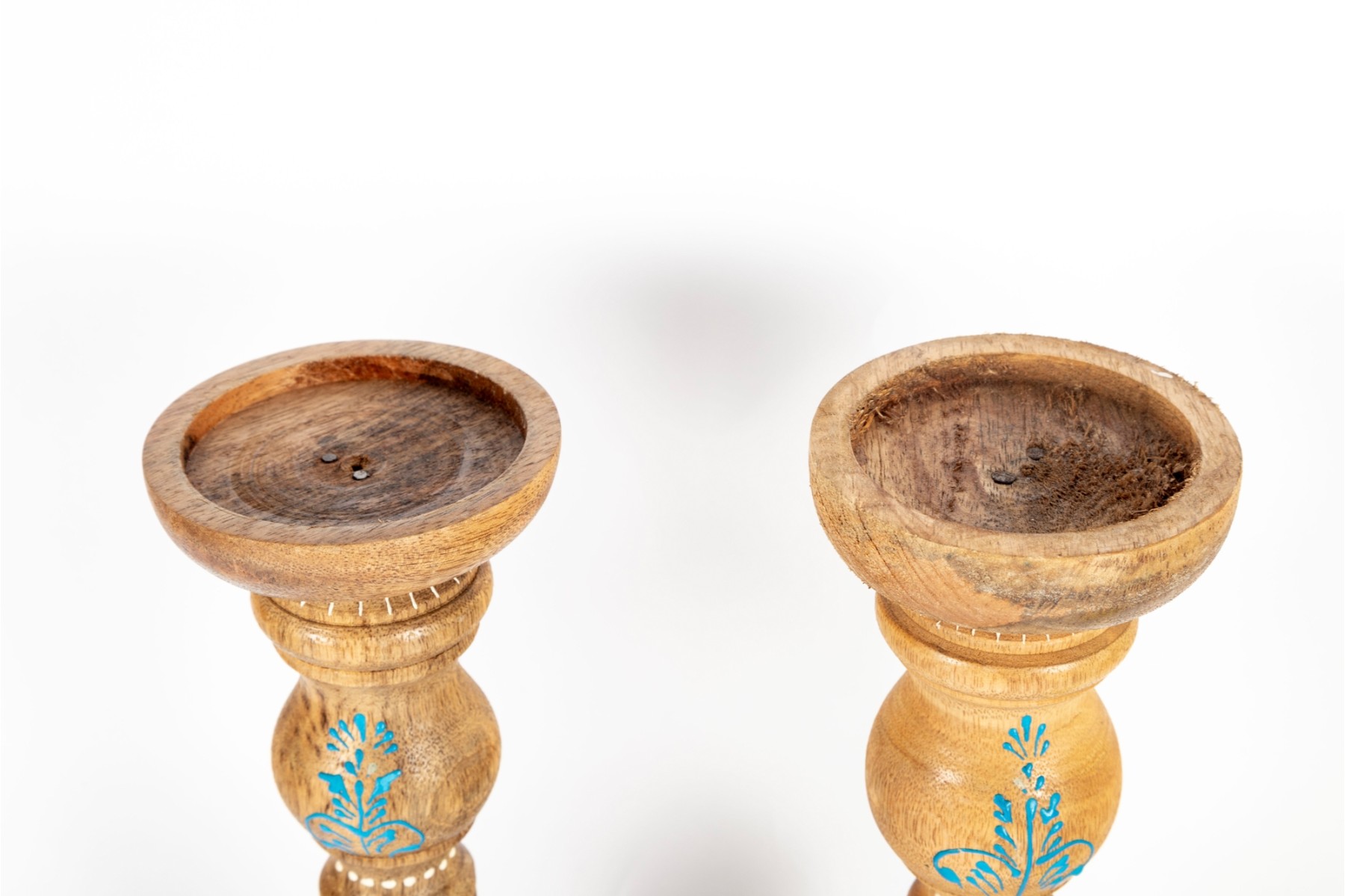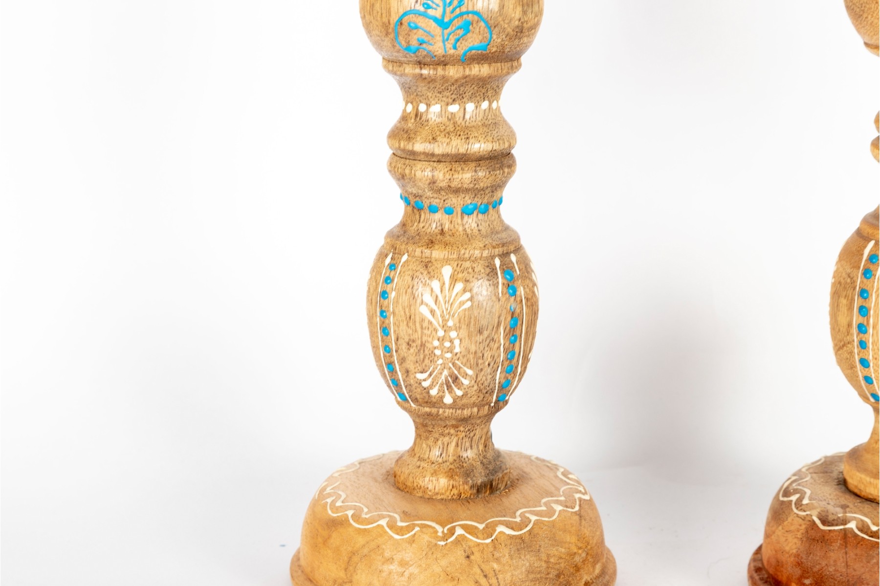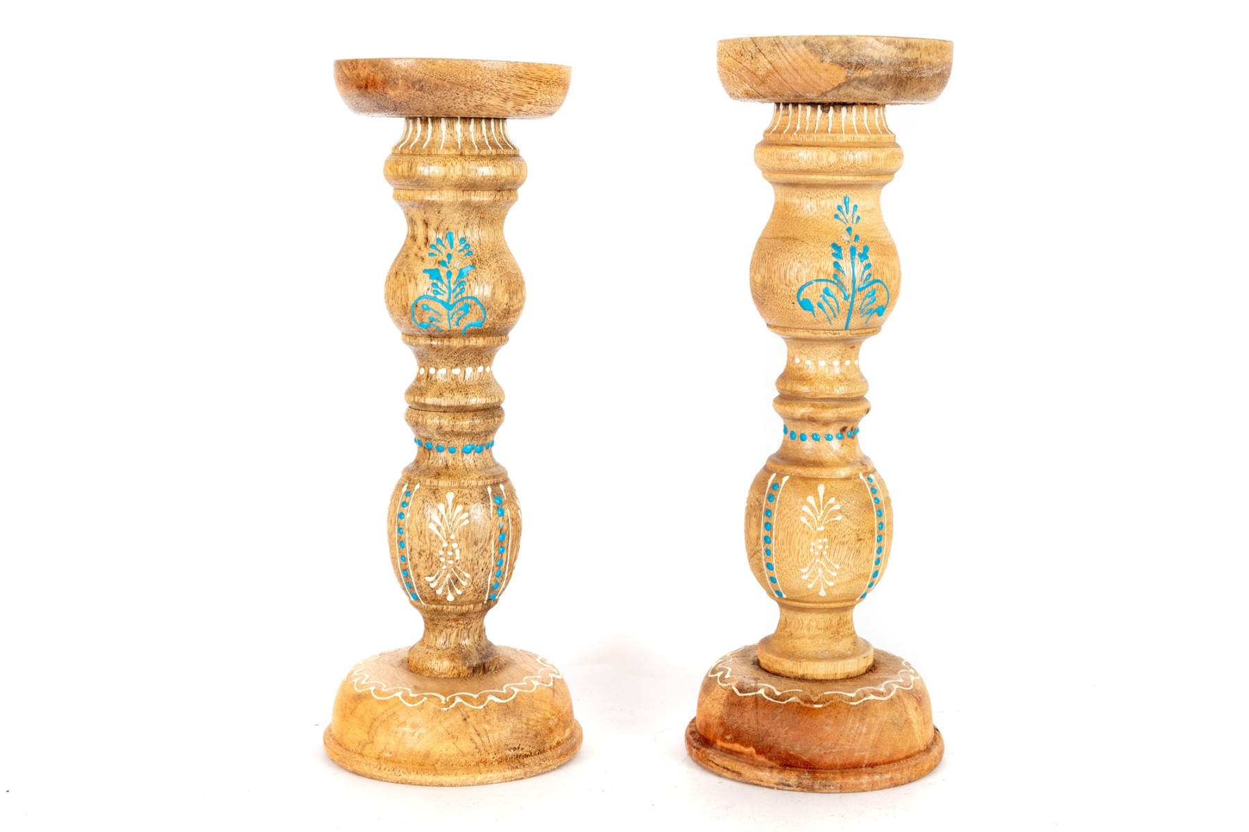A pair of artisanal hand-painted, lathe-turned wood candlestick holders.