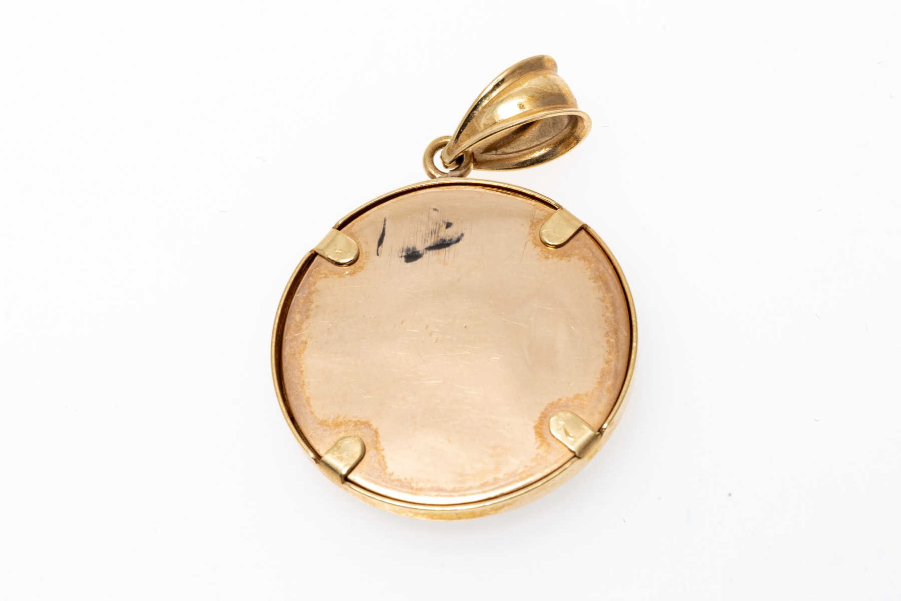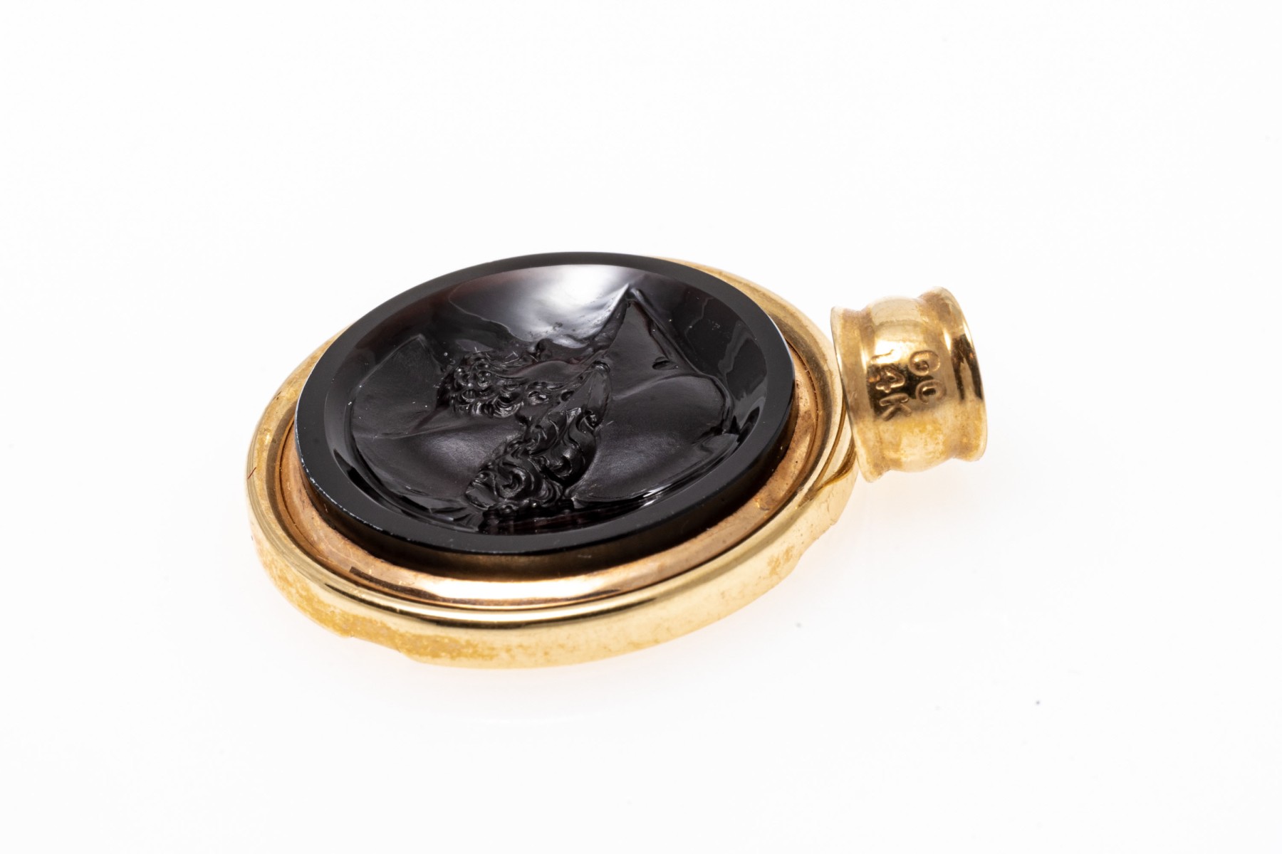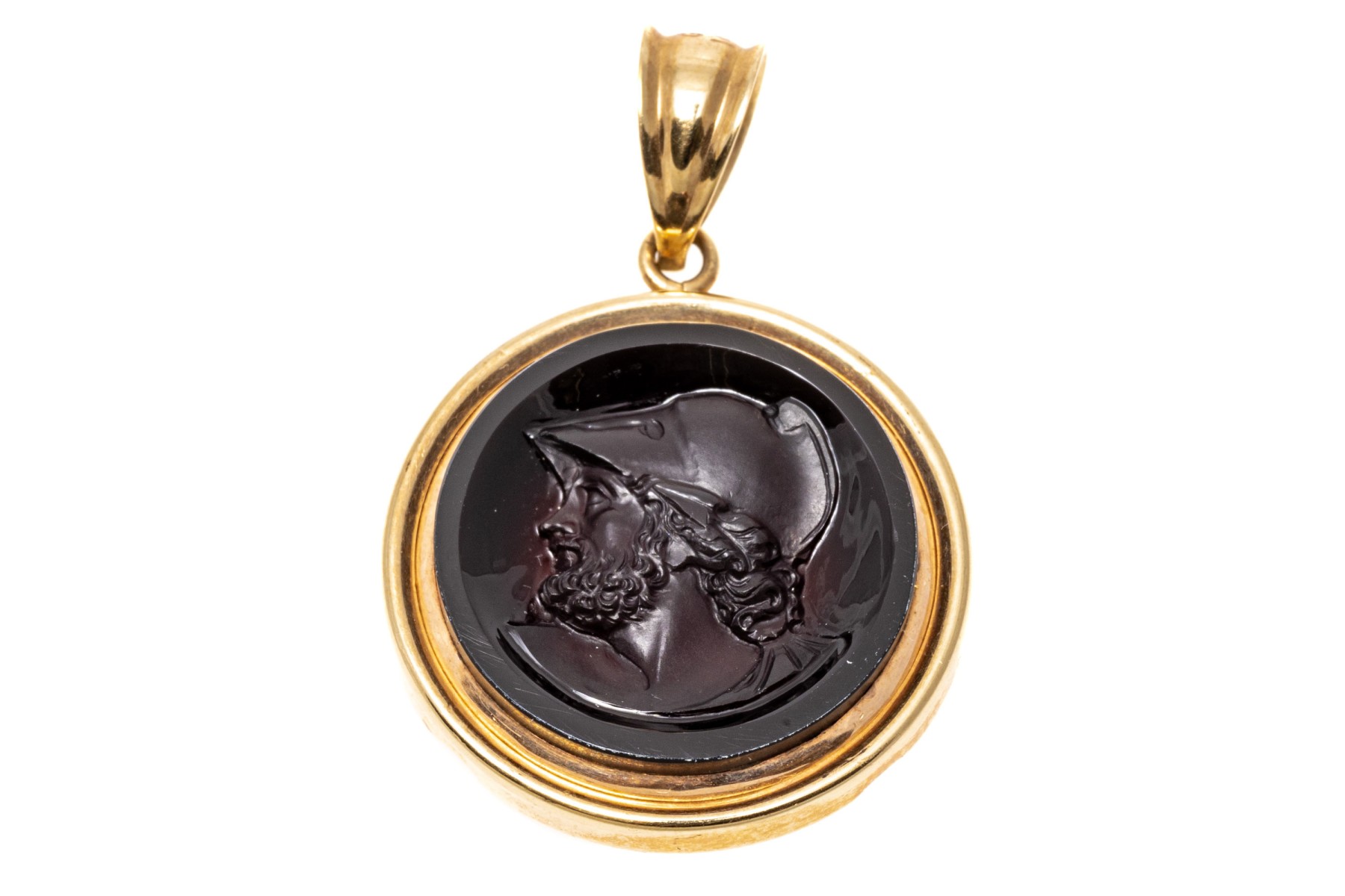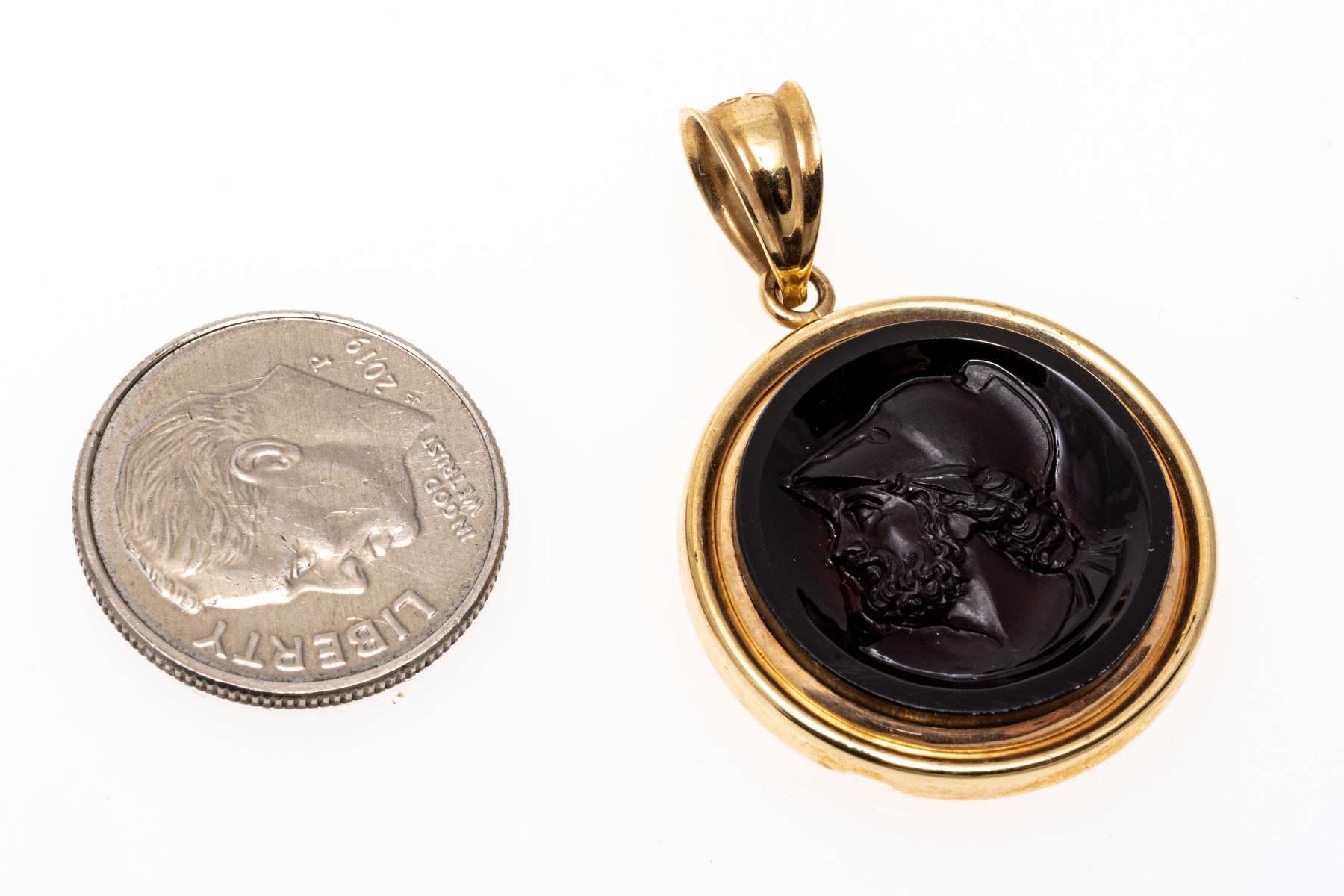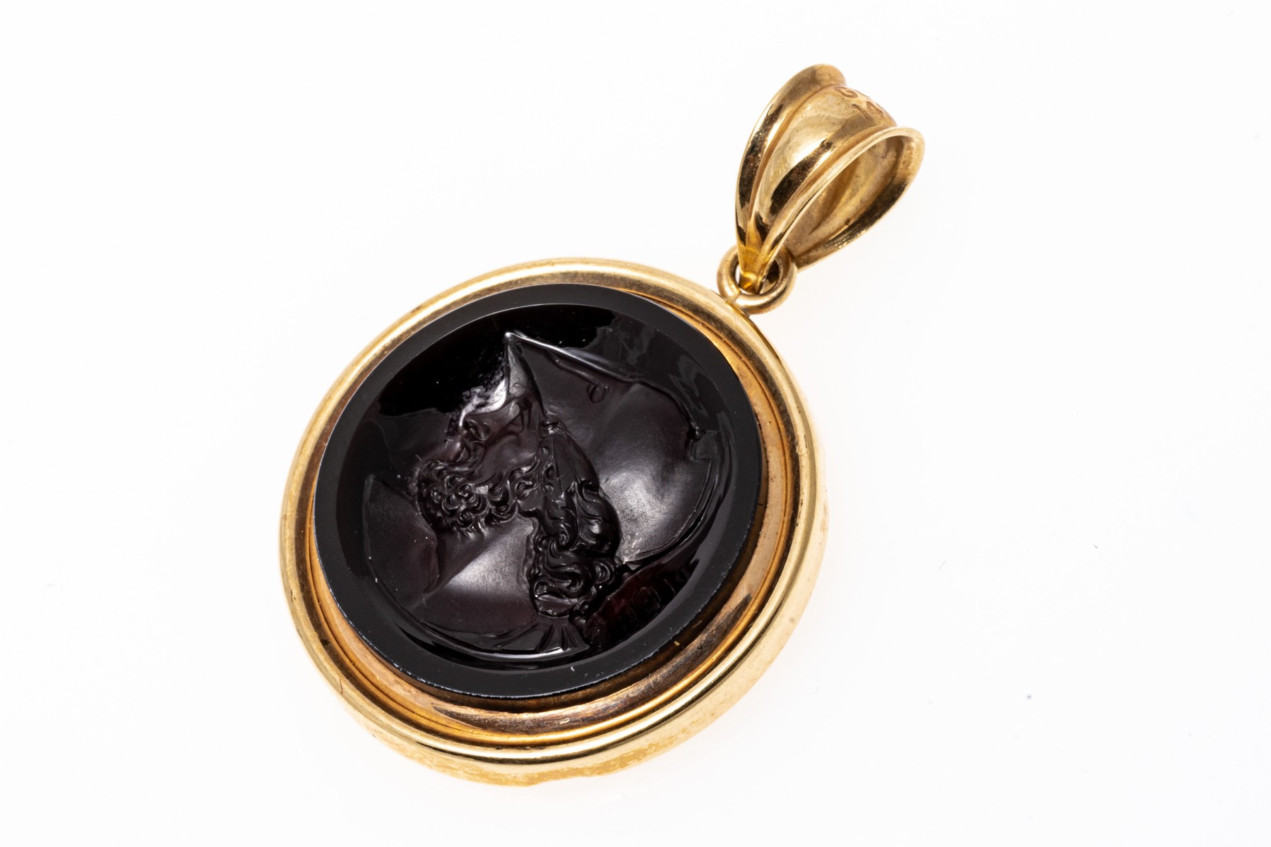 14K yellow gold disk style pendant. The pendant showcases a dark carved cameo of a male face.