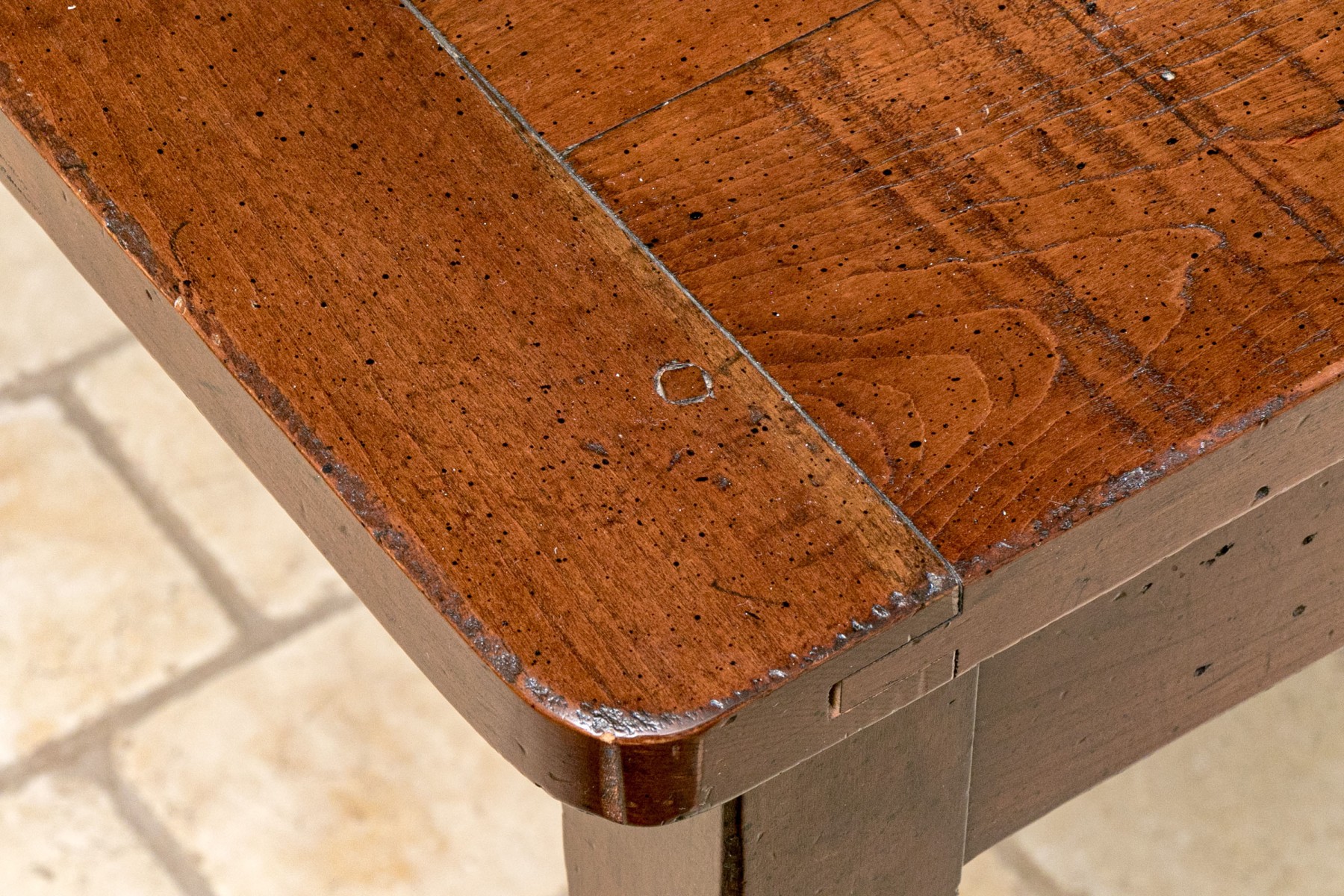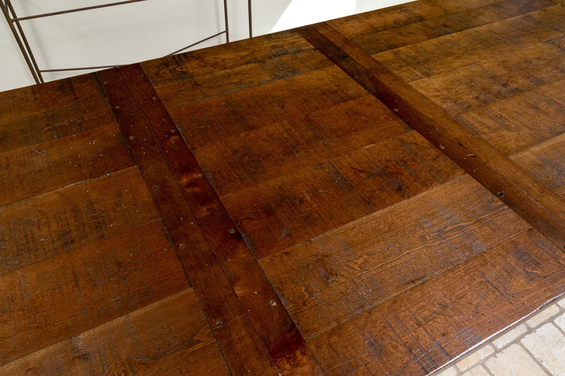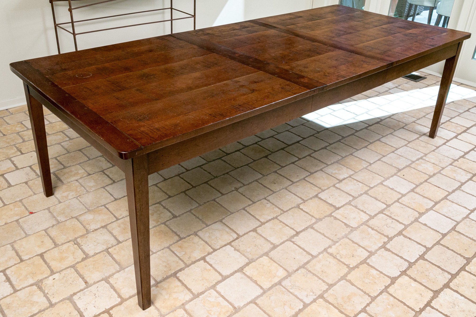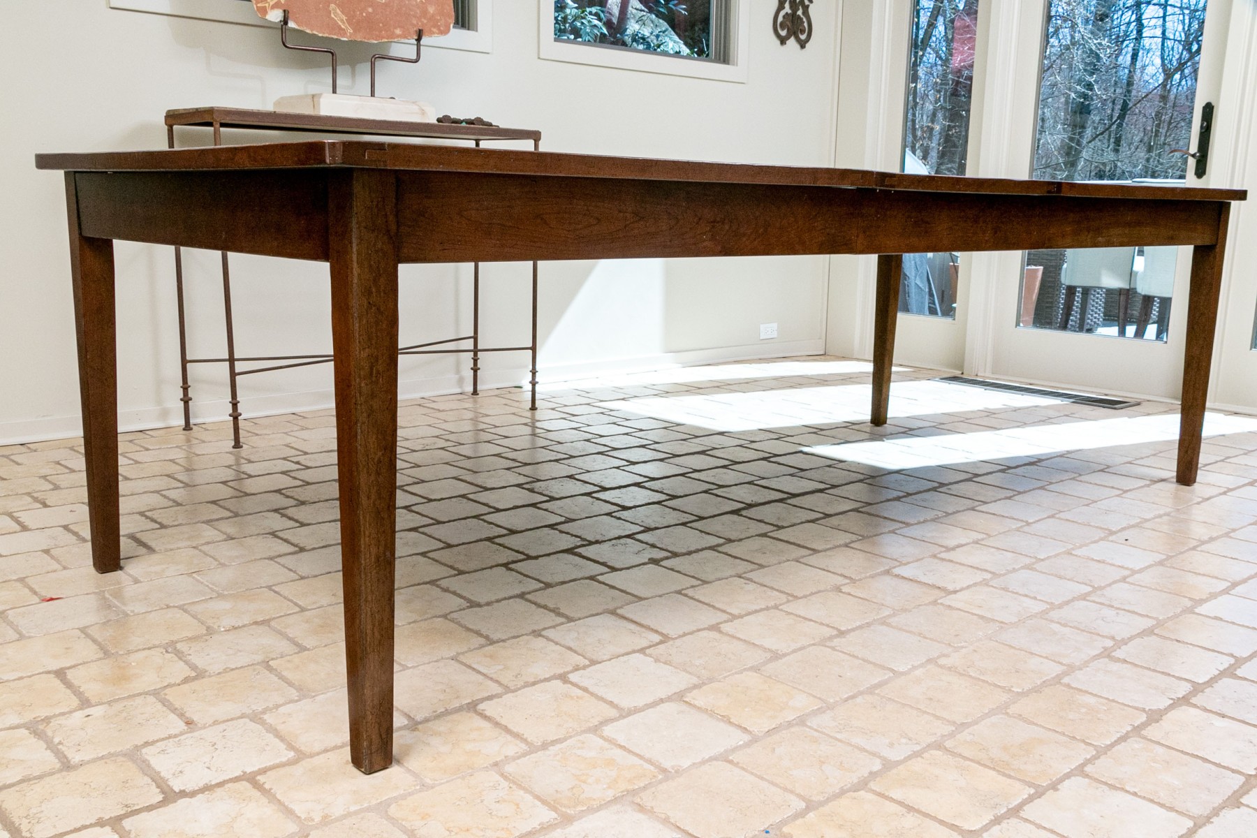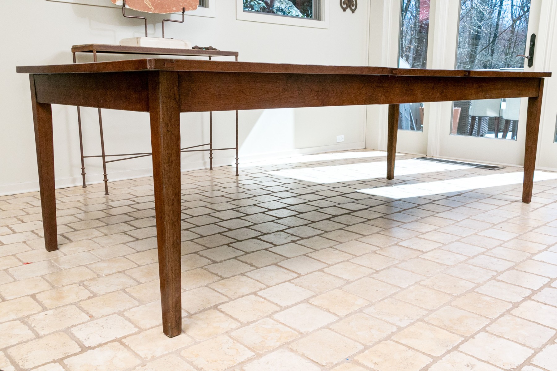 A handsome and nicely stained dining table perfect for large gatherings. The overall length is 100" with the leaf inserted.