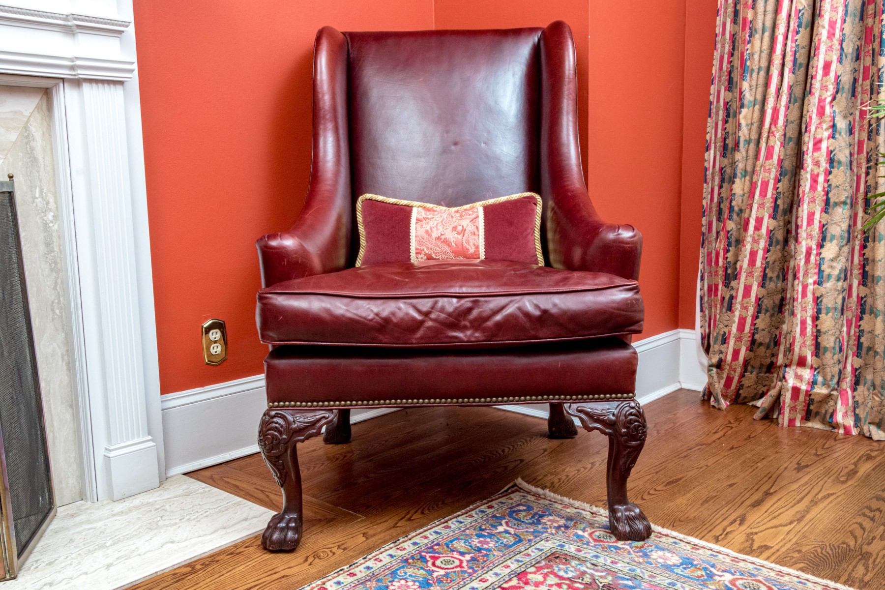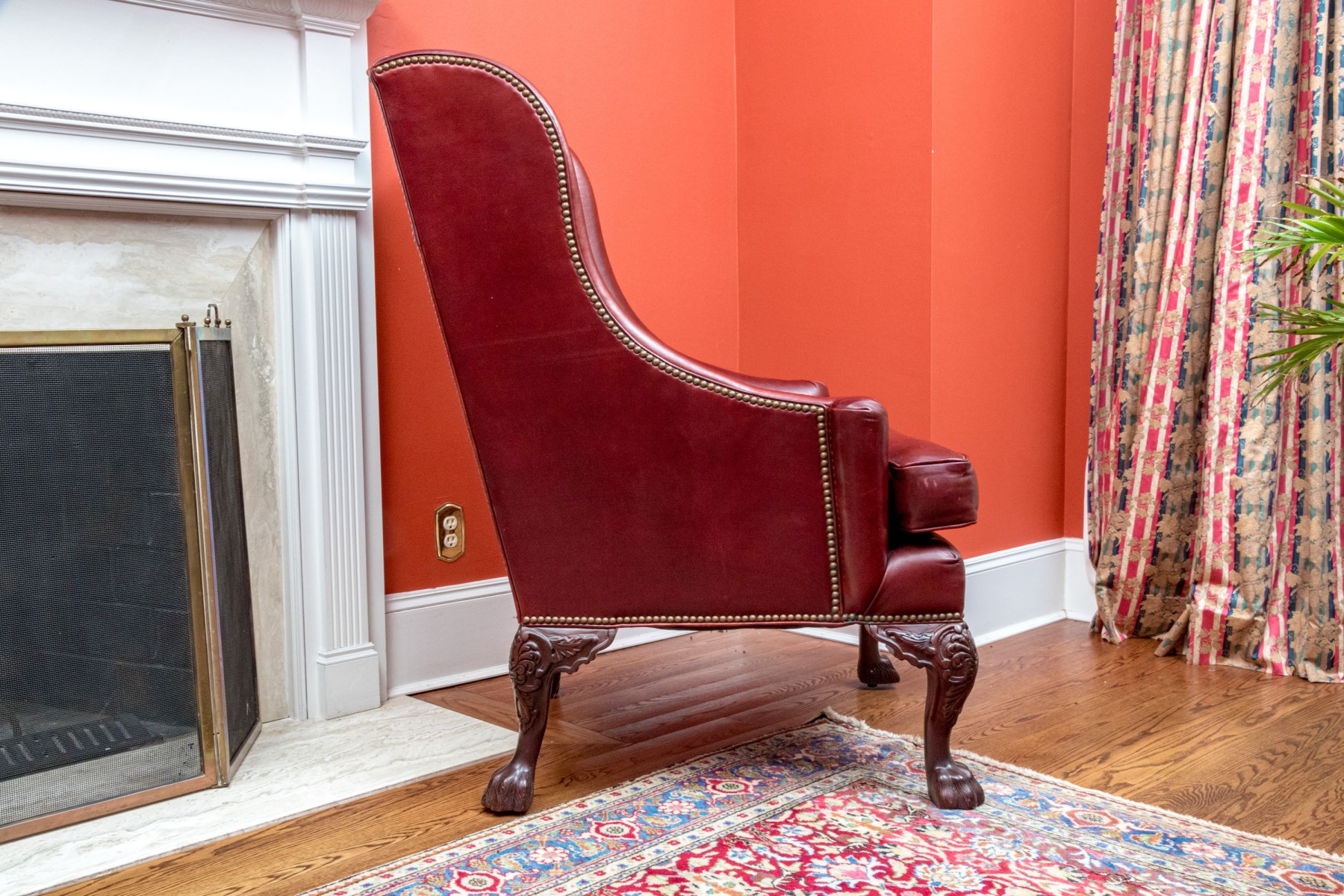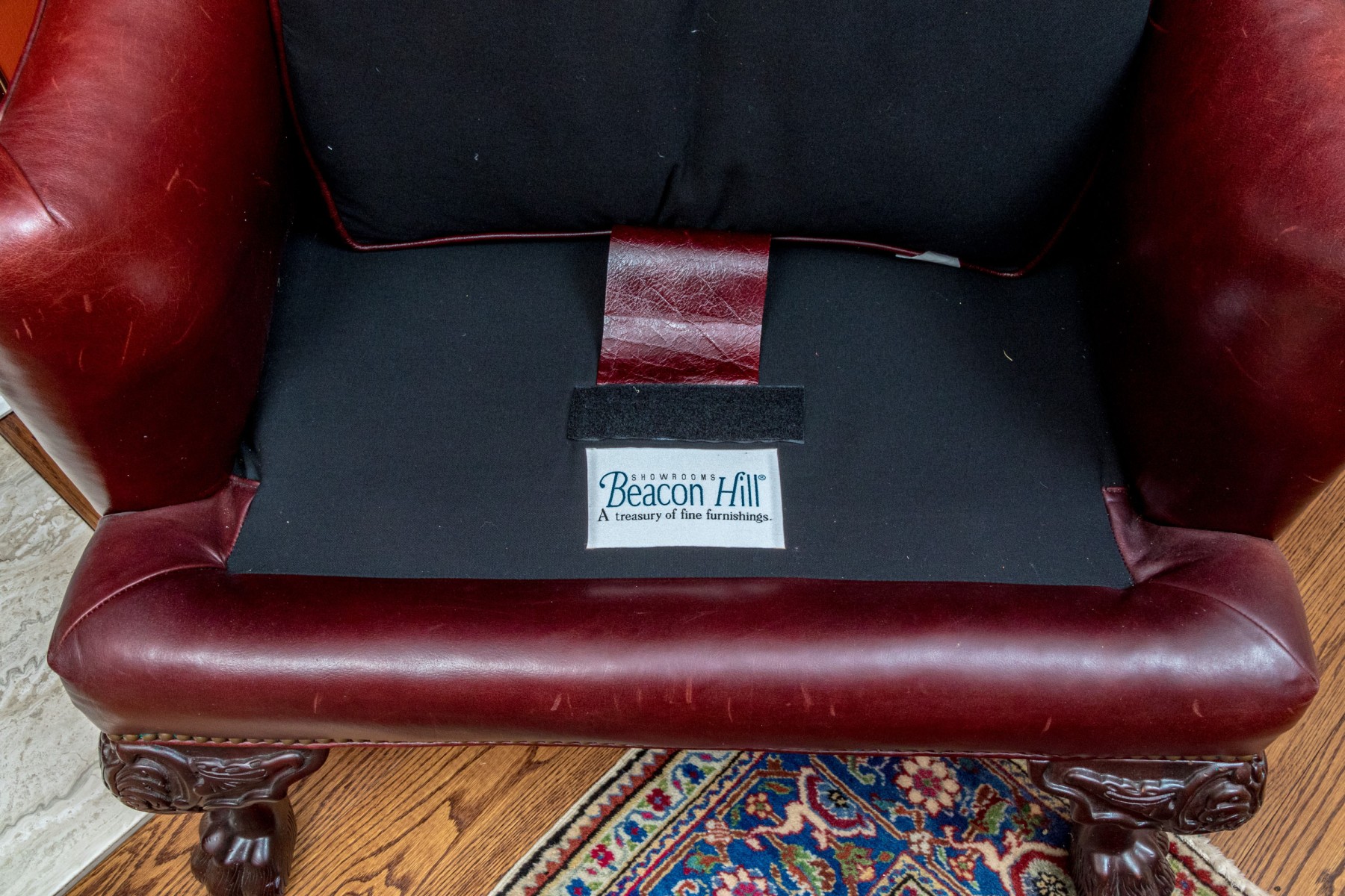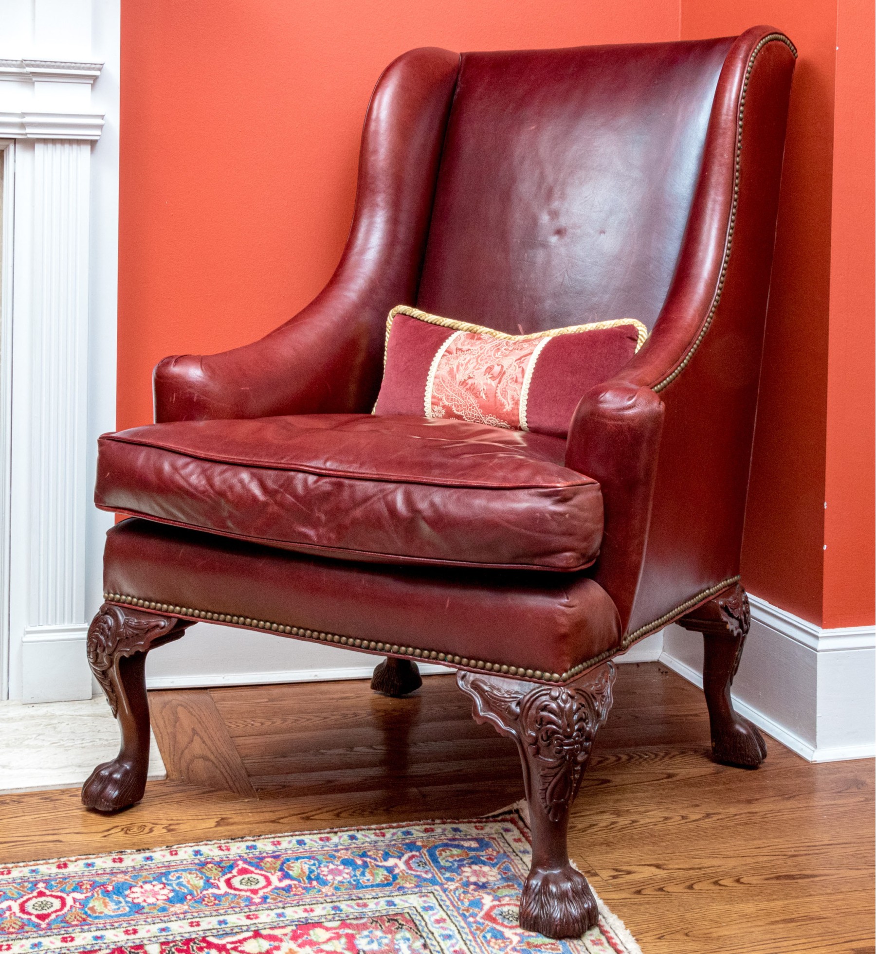 This elegant Beacon Hill wing chair features full, supple cordovan leather with a low arm design. The chair includes a loose seat cushion and is adorned with brass nailhead detailing. It stands on carved legs with claw feet, adding a touch of classic sophistication.
