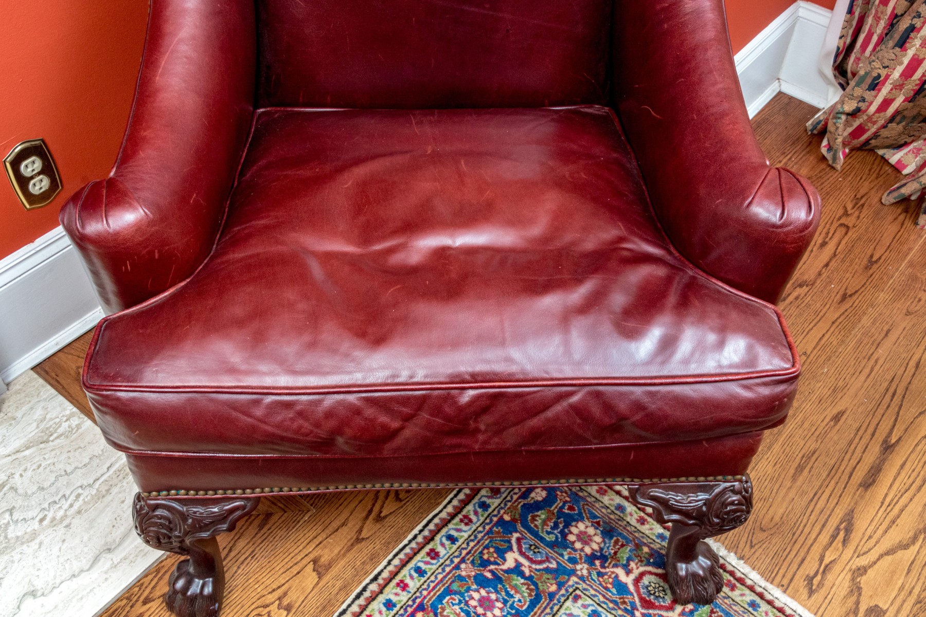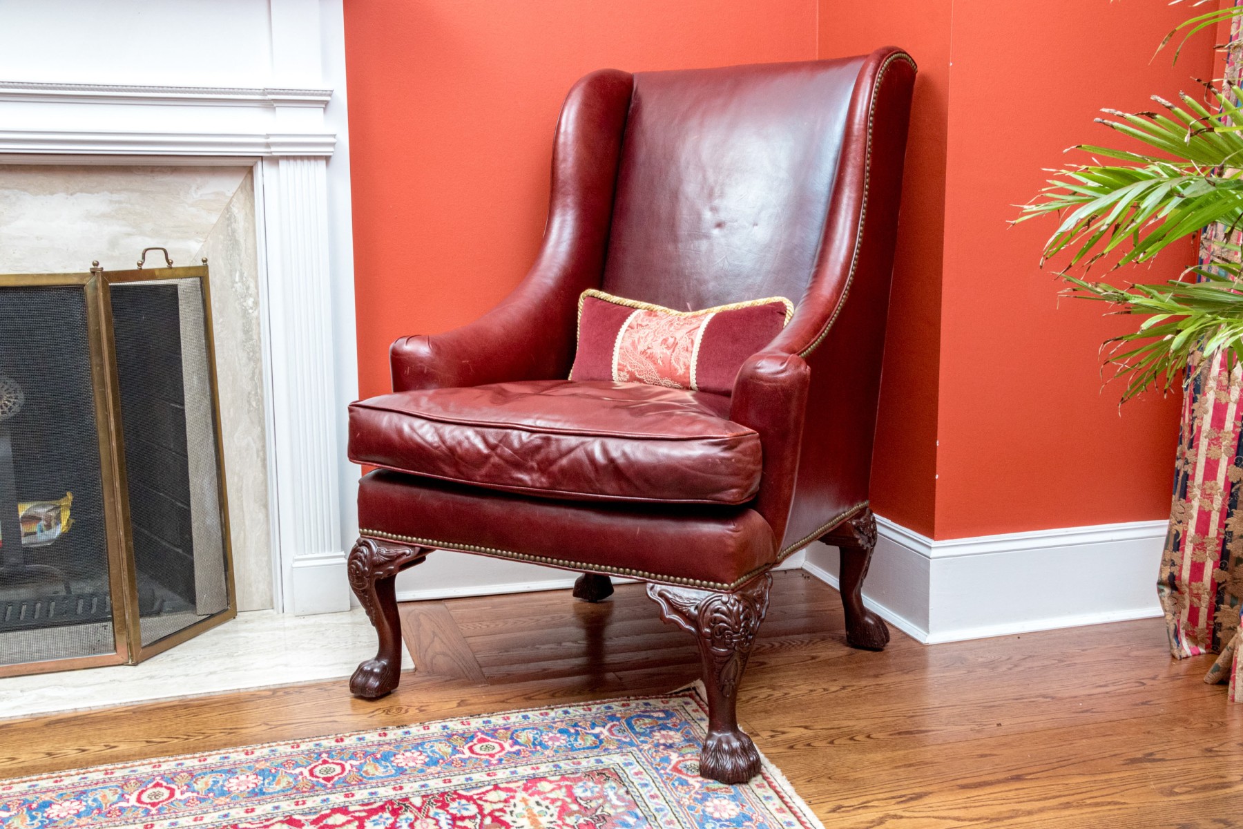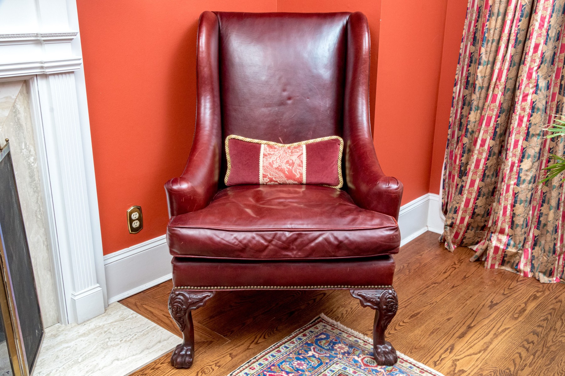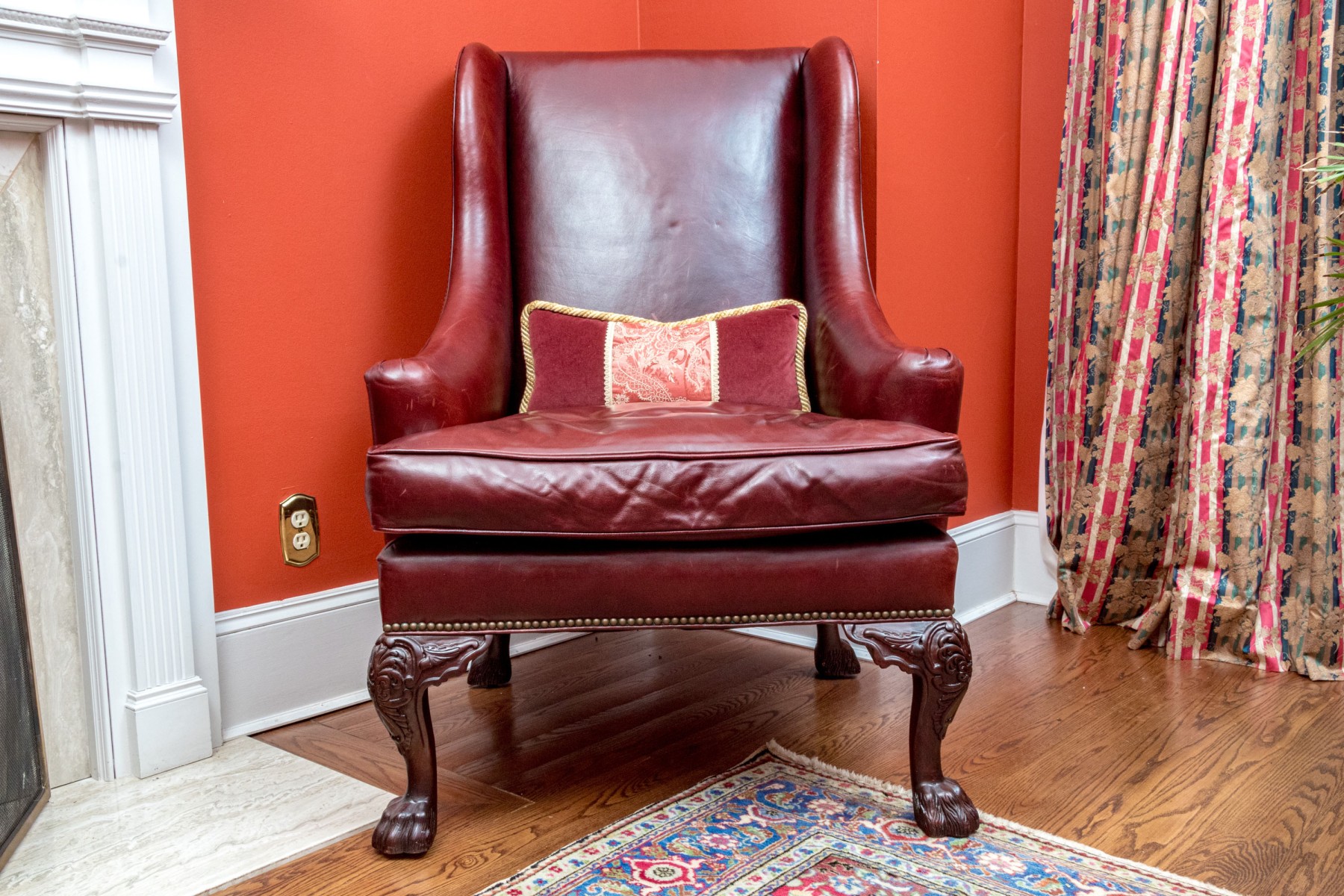 This elegant Beacon Hill wing chair features full, supple cordovan leather with a low arm design. The chair includes a loose seat cushion and is adorned with brass nailhead detailing. It stands on carved legs with claw feet, adding a touch of classic sophistication.