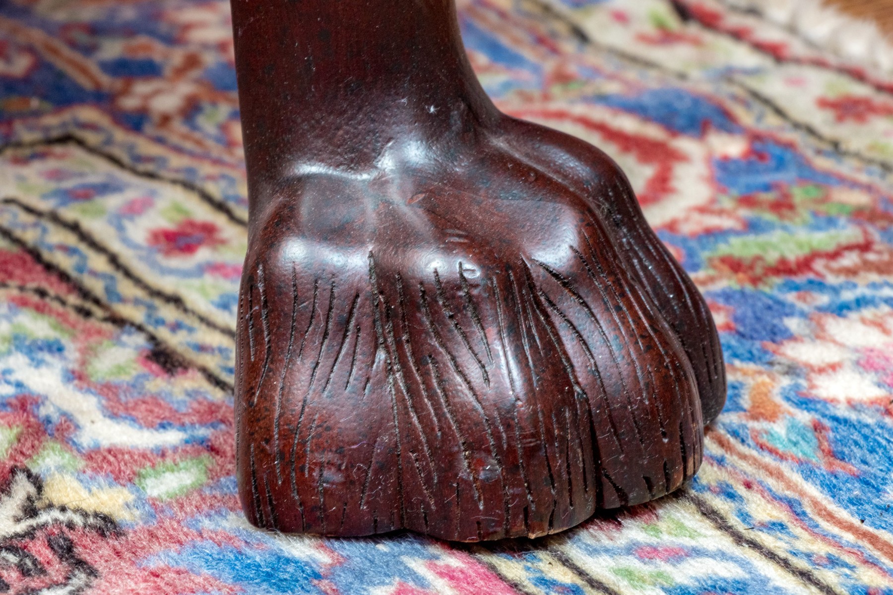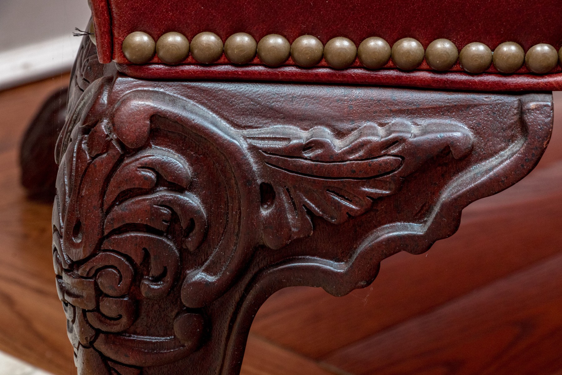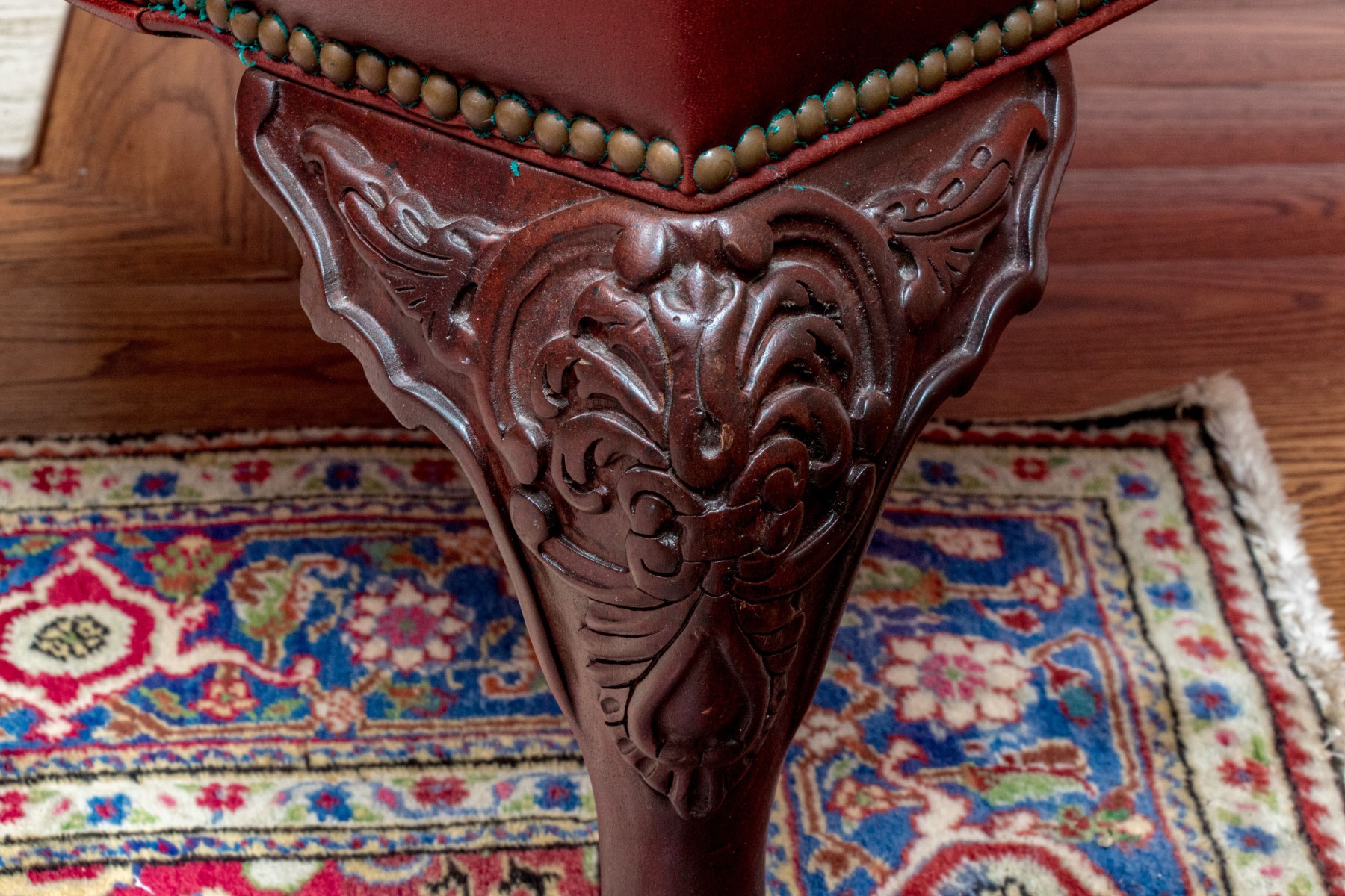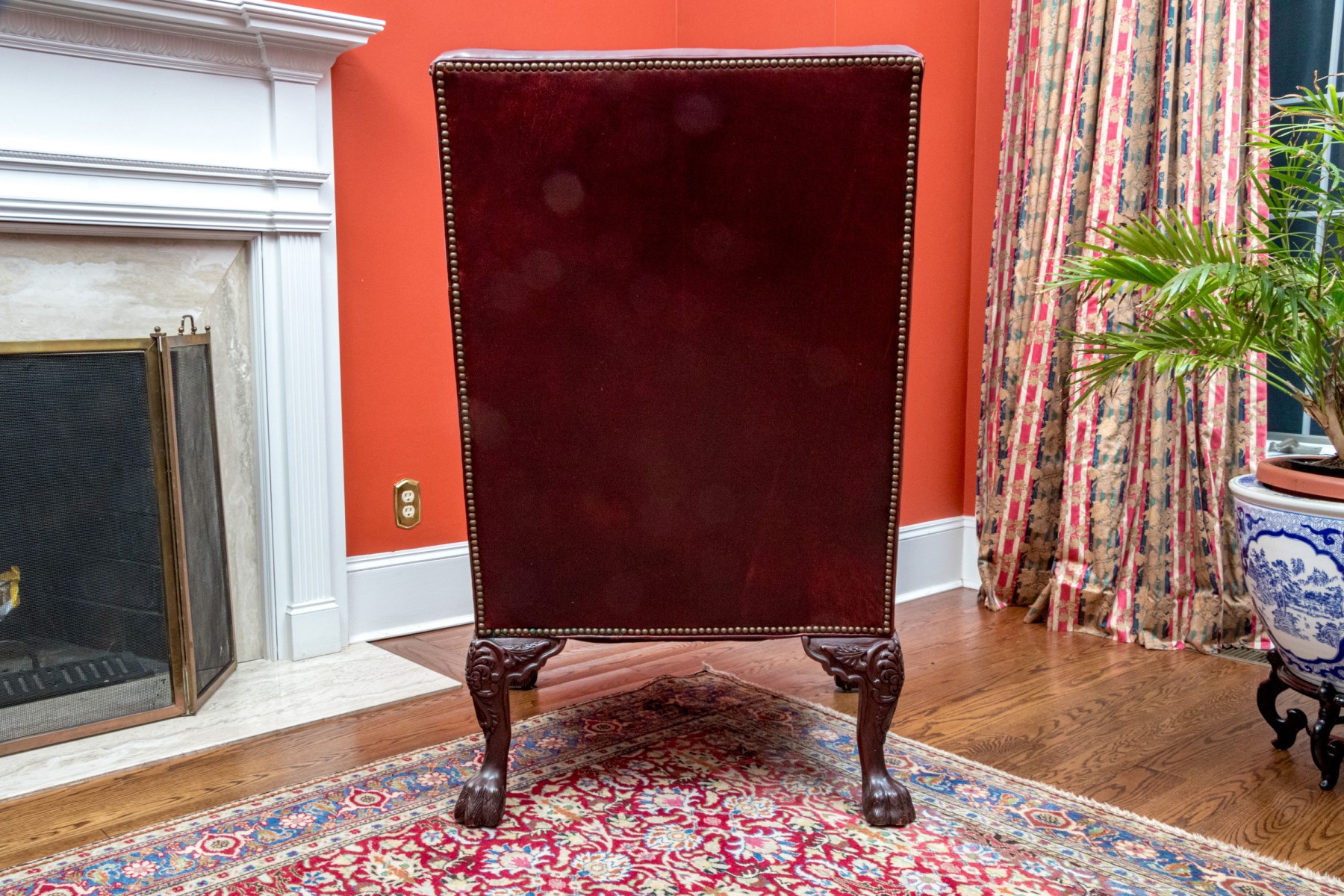 This elegant Beacon Hill wing chair features full, supple cordovan leather with a low arm design. The chair includes a loose seat cushion and is adorned with brass nailhead detailing. It stands on carved legs with claw feet, adding a touch of classic sophistication.