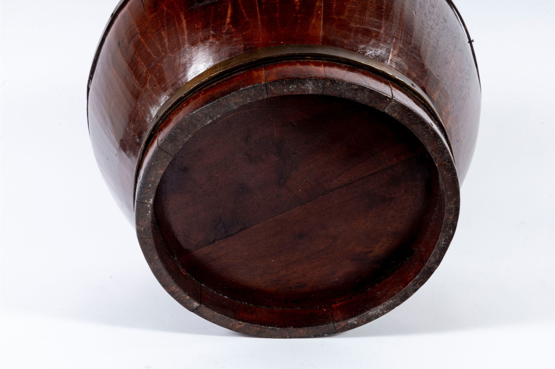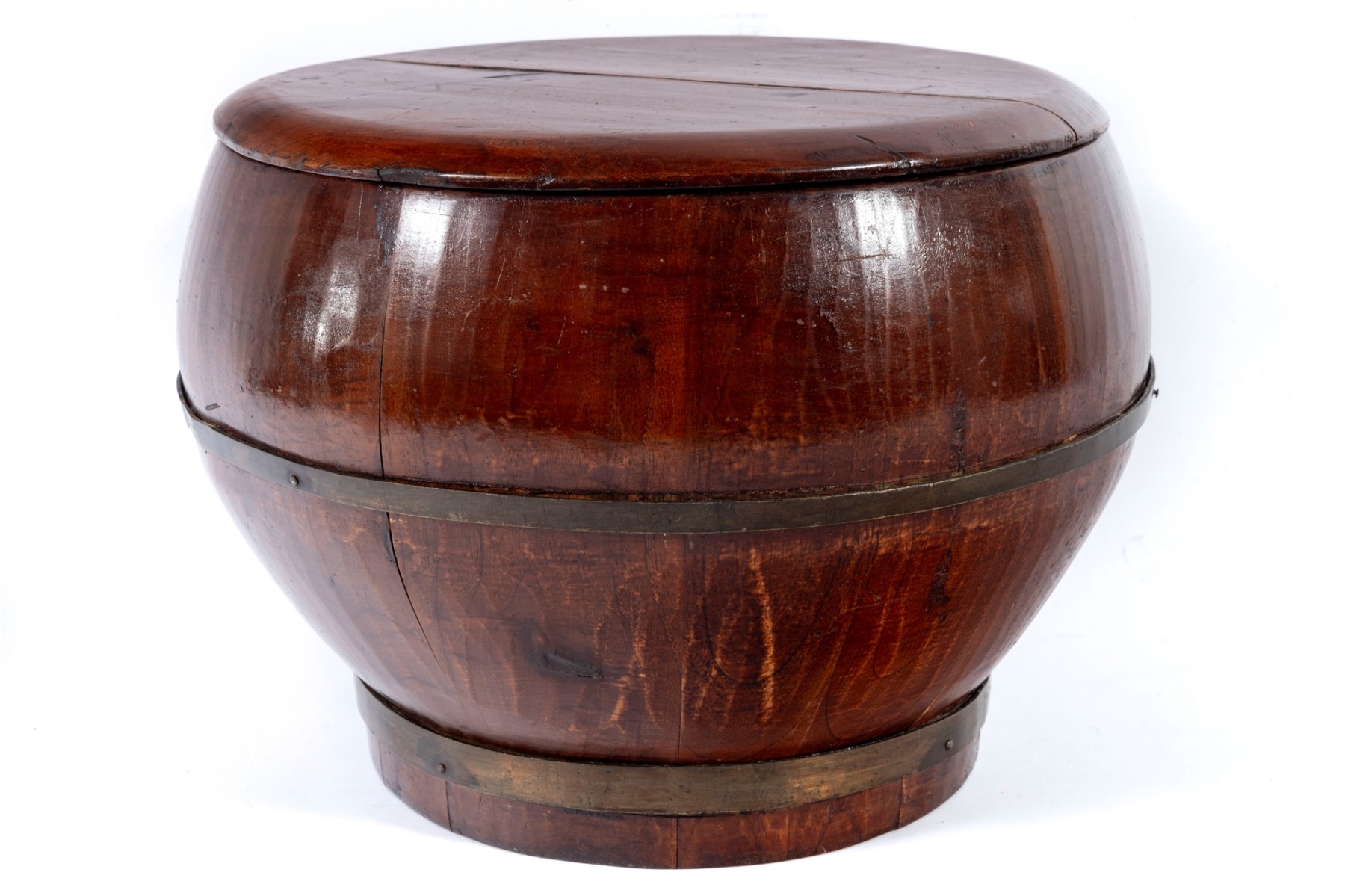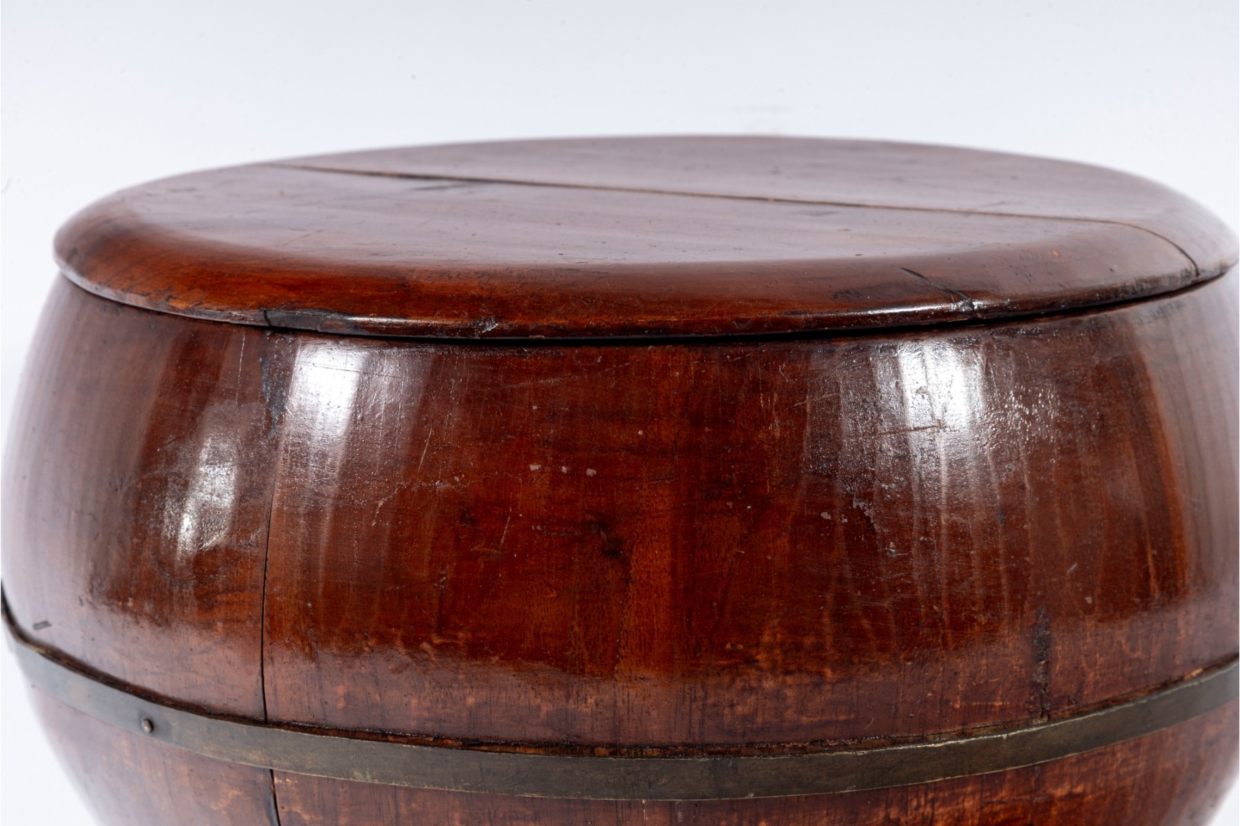 A handsome and nicely aged wood Chinese box, perfect for use as a wedding basket or for grain storage. The bun-shaped barrel body is beautifully formed with a glossy red-brown finish, topped with a simple lid and detailed with metal bands reaching a raised cylindrical foot.