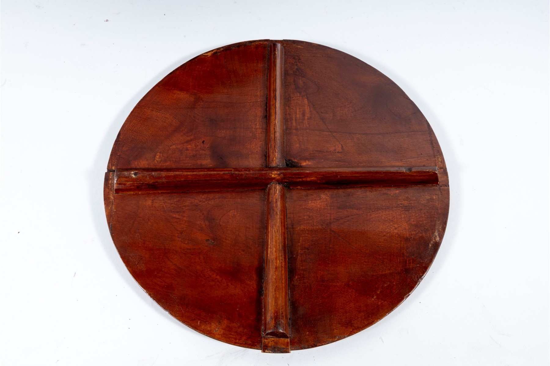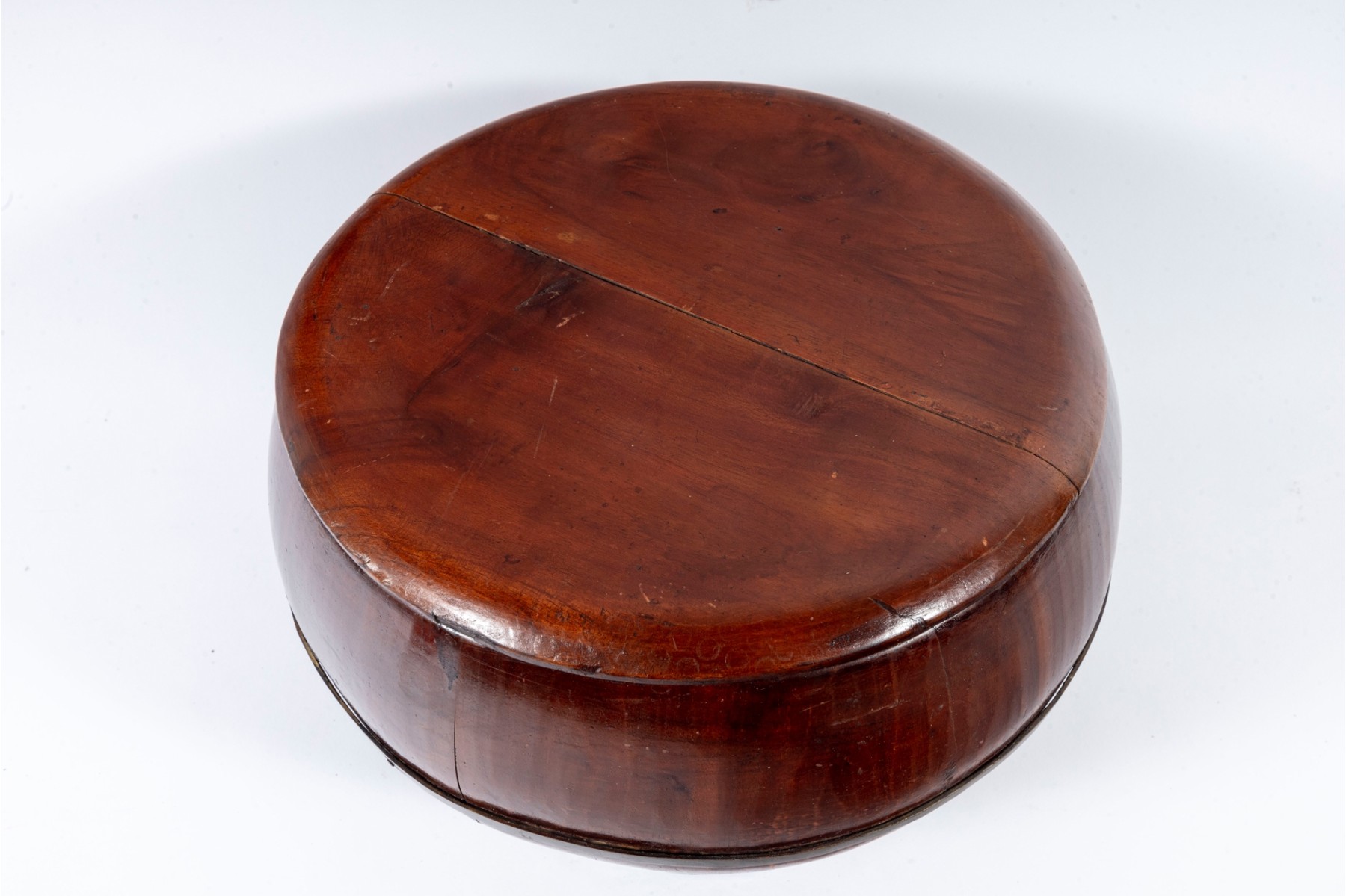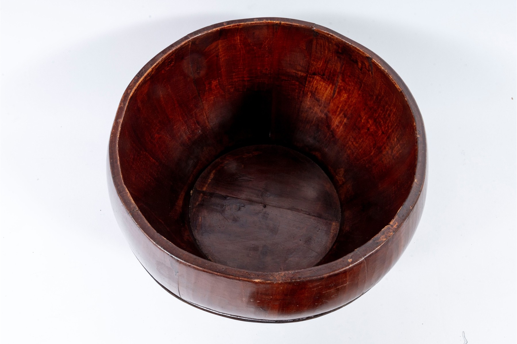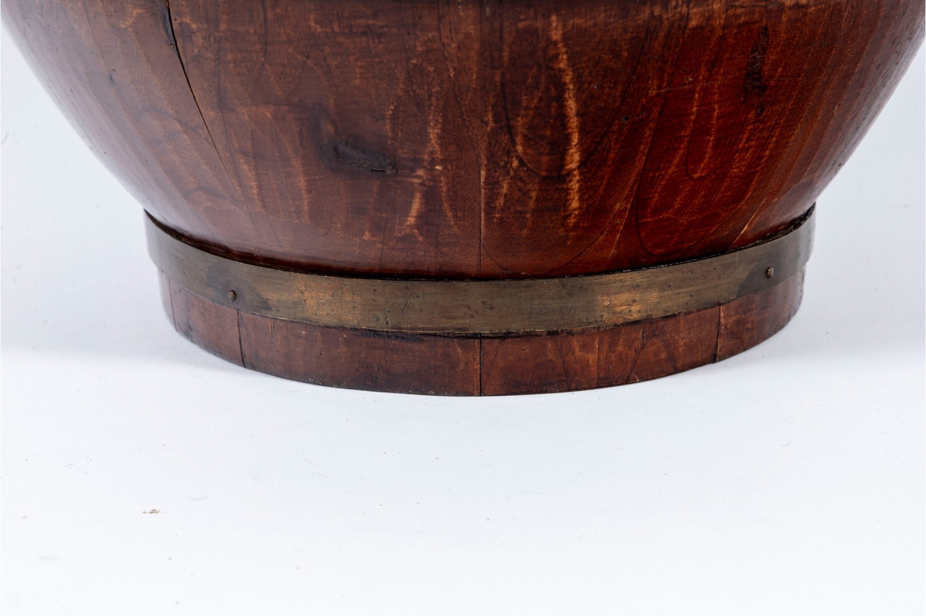 A handsome and nicely aged wood Chinese box, perfect for use as a wedding basket or for grain storage. The bun-shaped barrel body is beautifully formed with a glossy red-brown finish, topped with a simple lid and detailed with metal bands reaching a raised cylindrical foot.