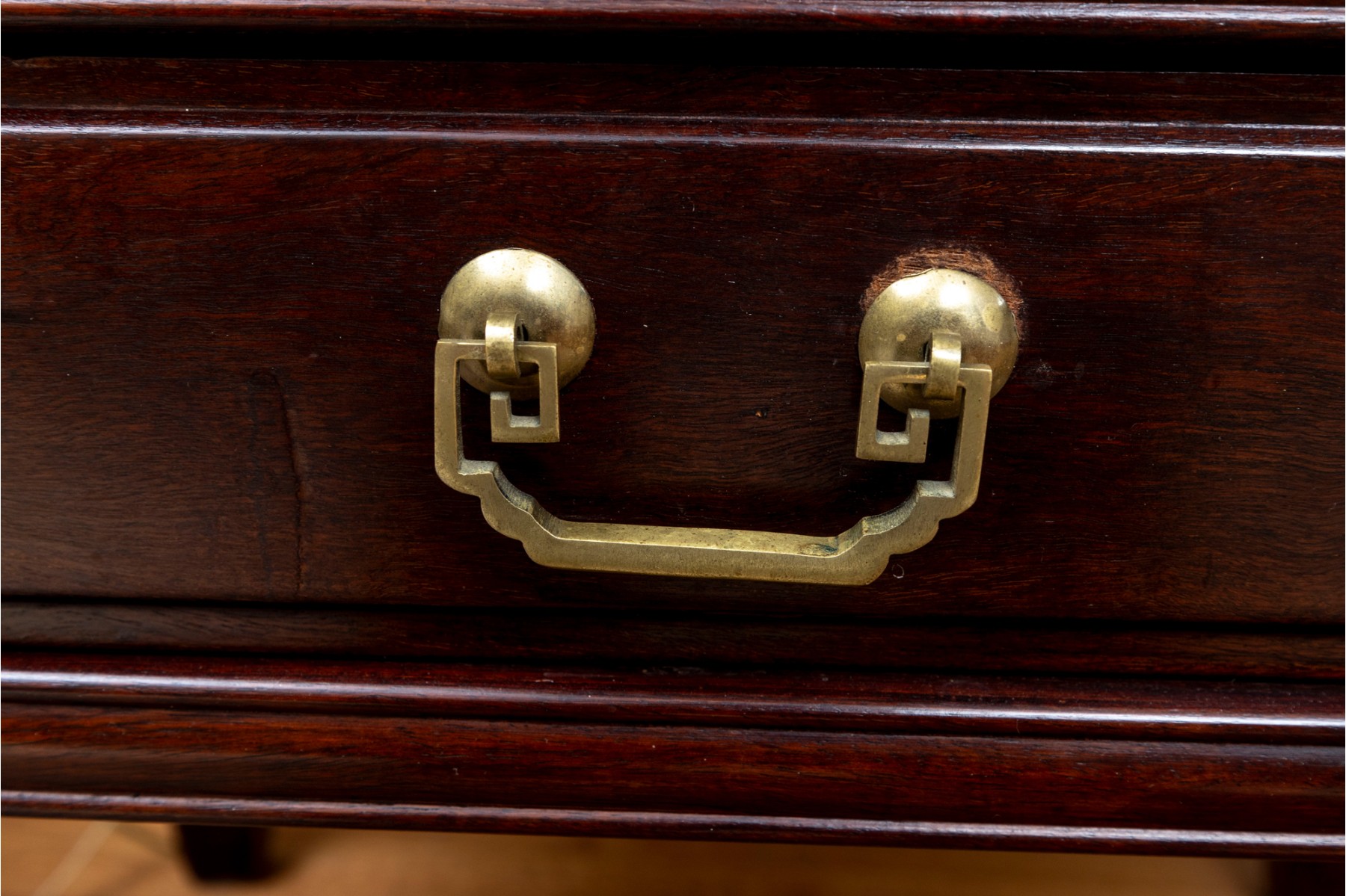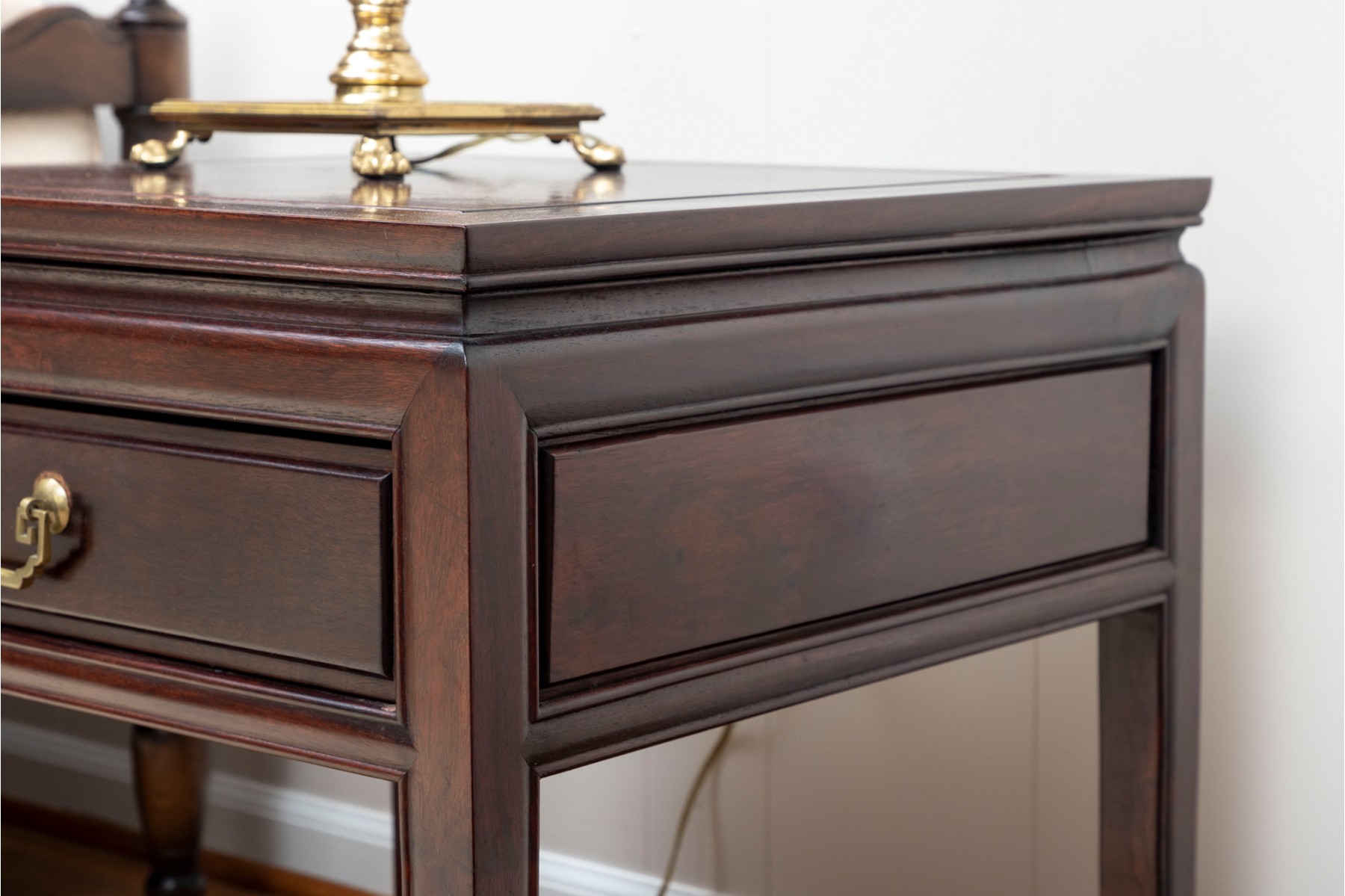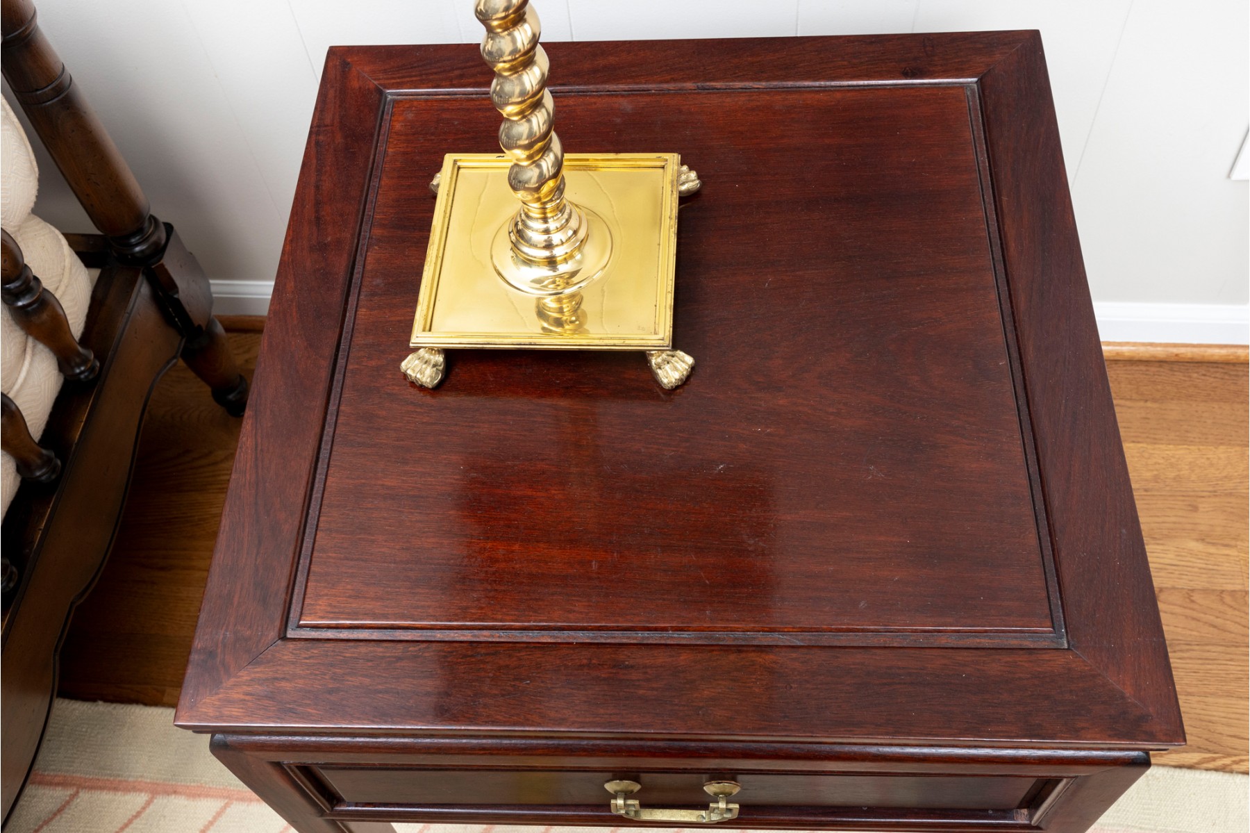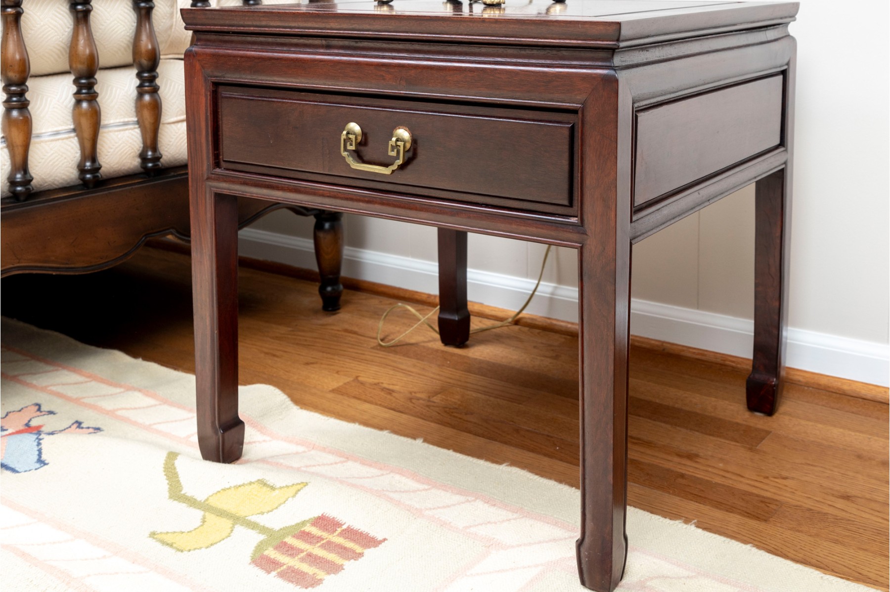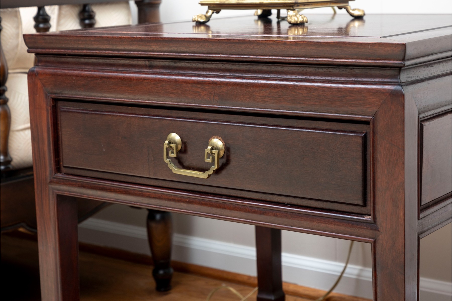 A handsome Chinese end table in traditional form with a gorgeous rosewood finish, displaying a rectangular top with a recessed center border over a single drawer with a brass handle, supported by simple rectangular legs on inwardly flared feet.