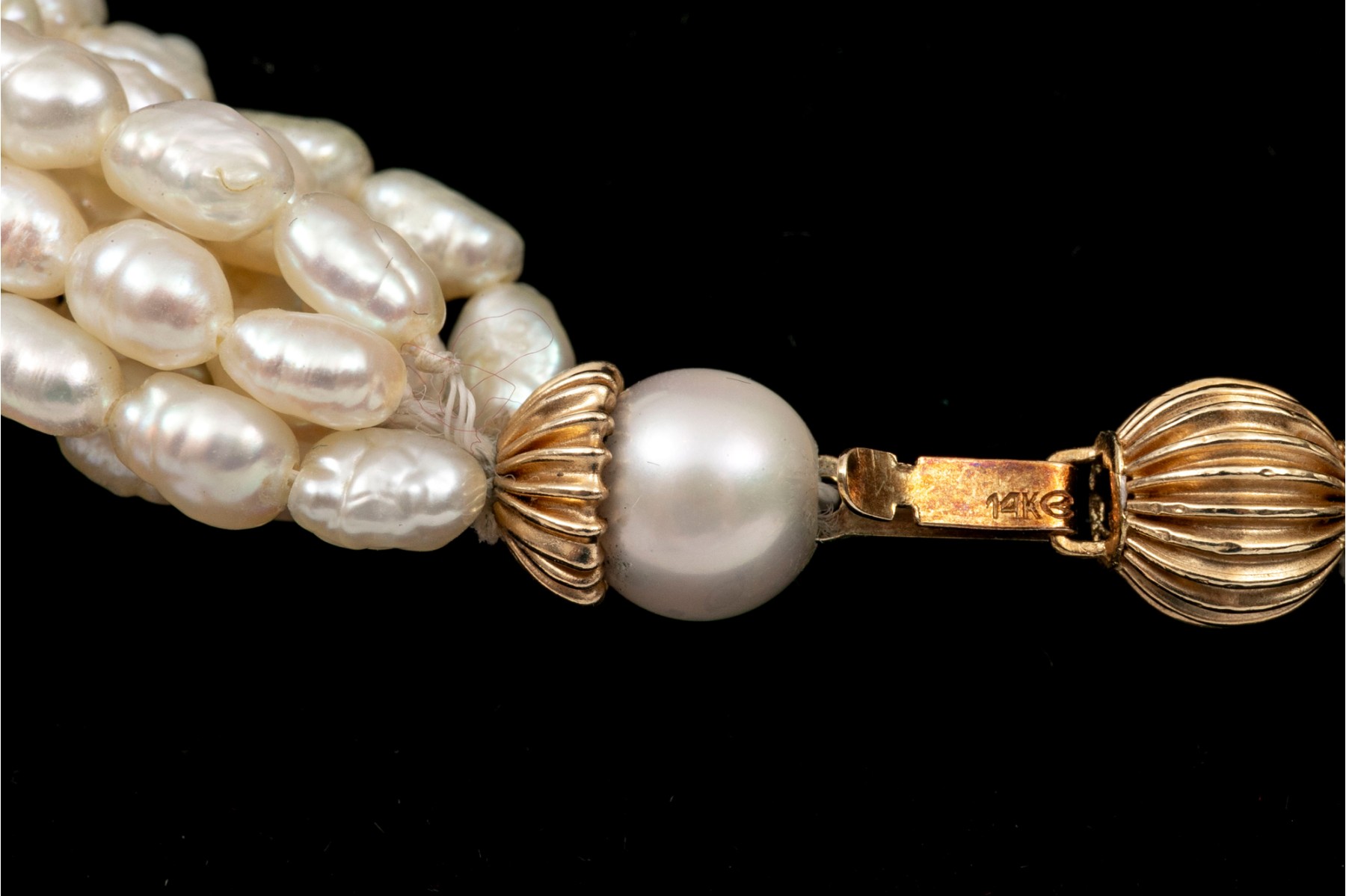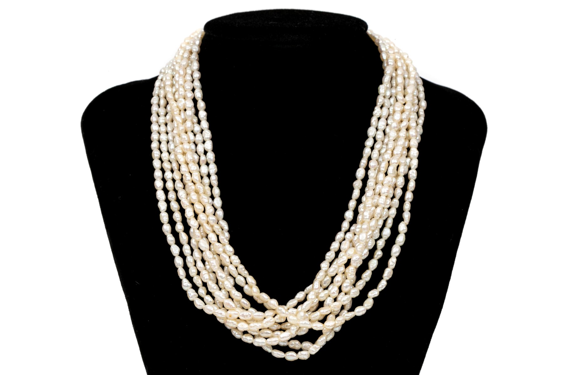 Cultured freshwater pearl necklace. This handsome torsade necklace contains nine strands of off-white cultured freshwater pearls, finished with a ribbed, 14k ball style clasp.
