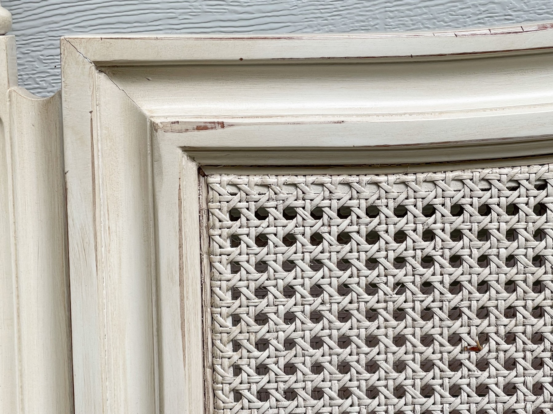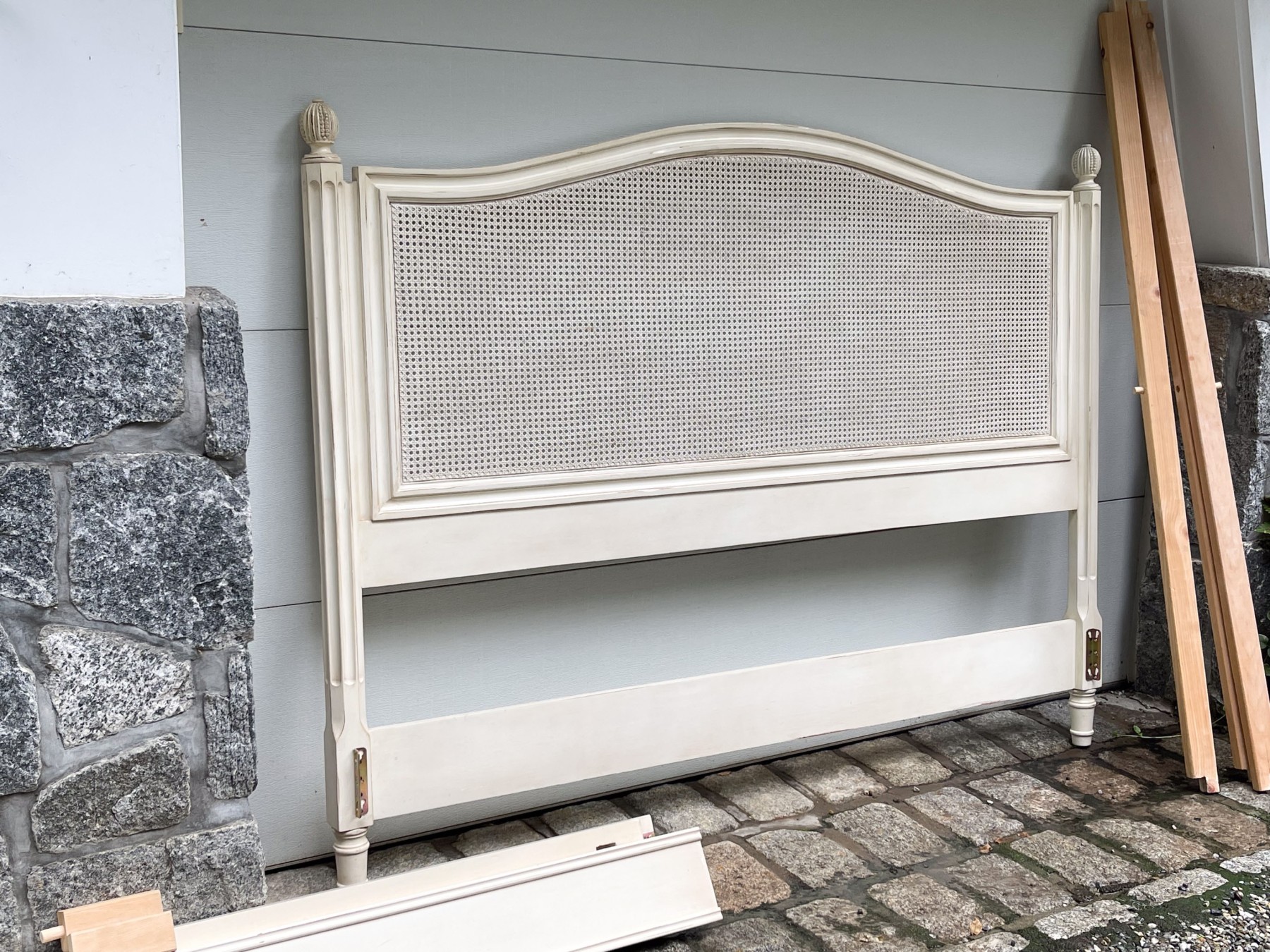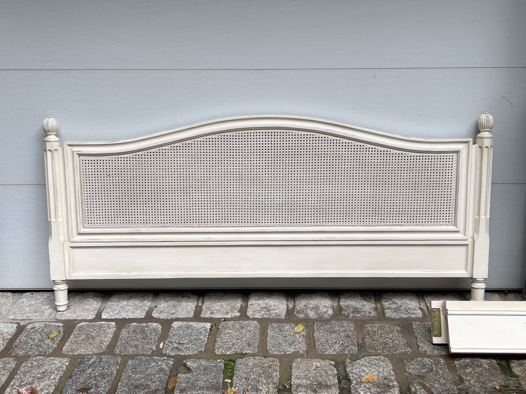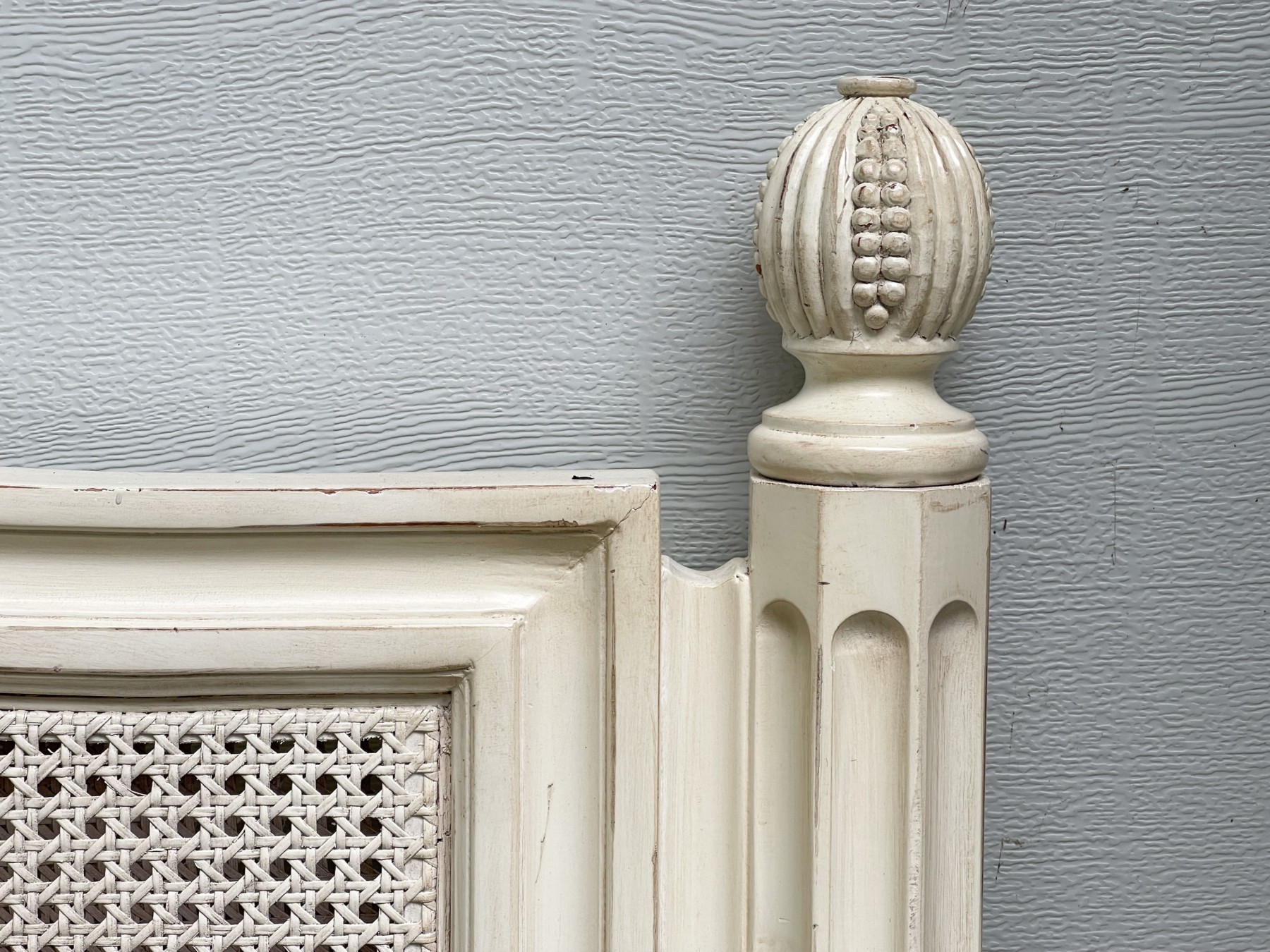 A handsome king size bedframe with delightful French country appeal, painted cream white over a serpentine headboard and footboard with caned panels. The posts are beautifully faceted, fluted, and topped with gadrooned finial for a wonderful touch of elegance.
