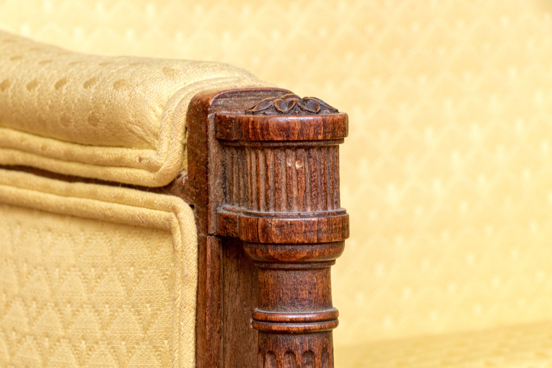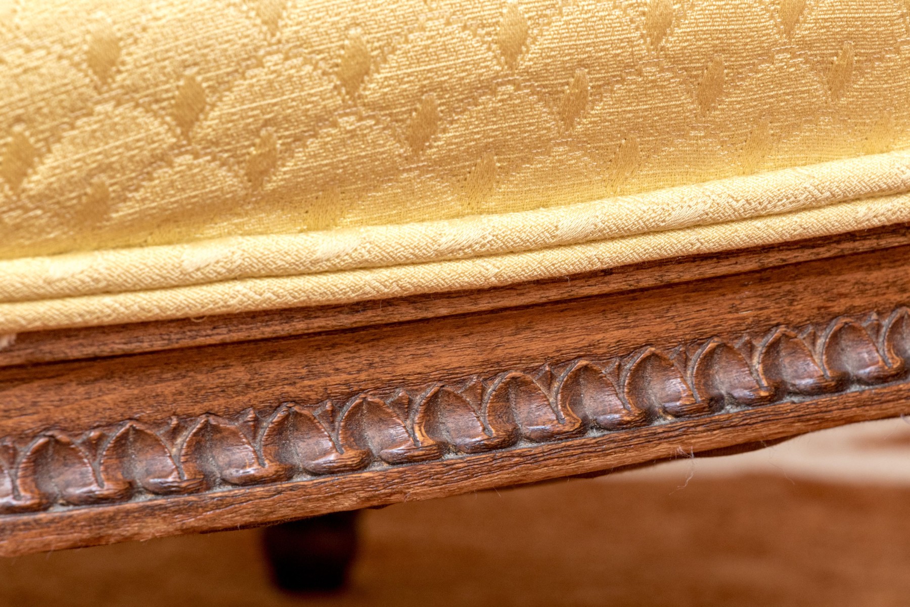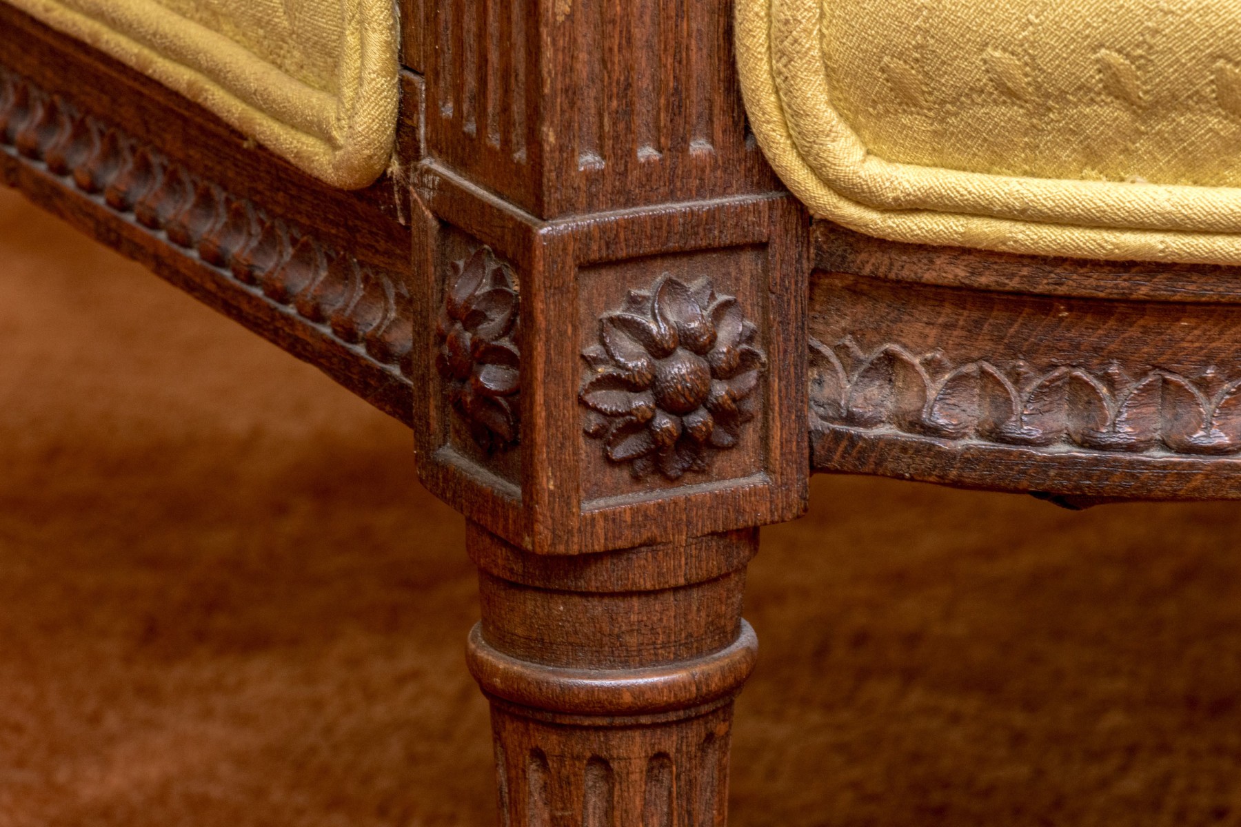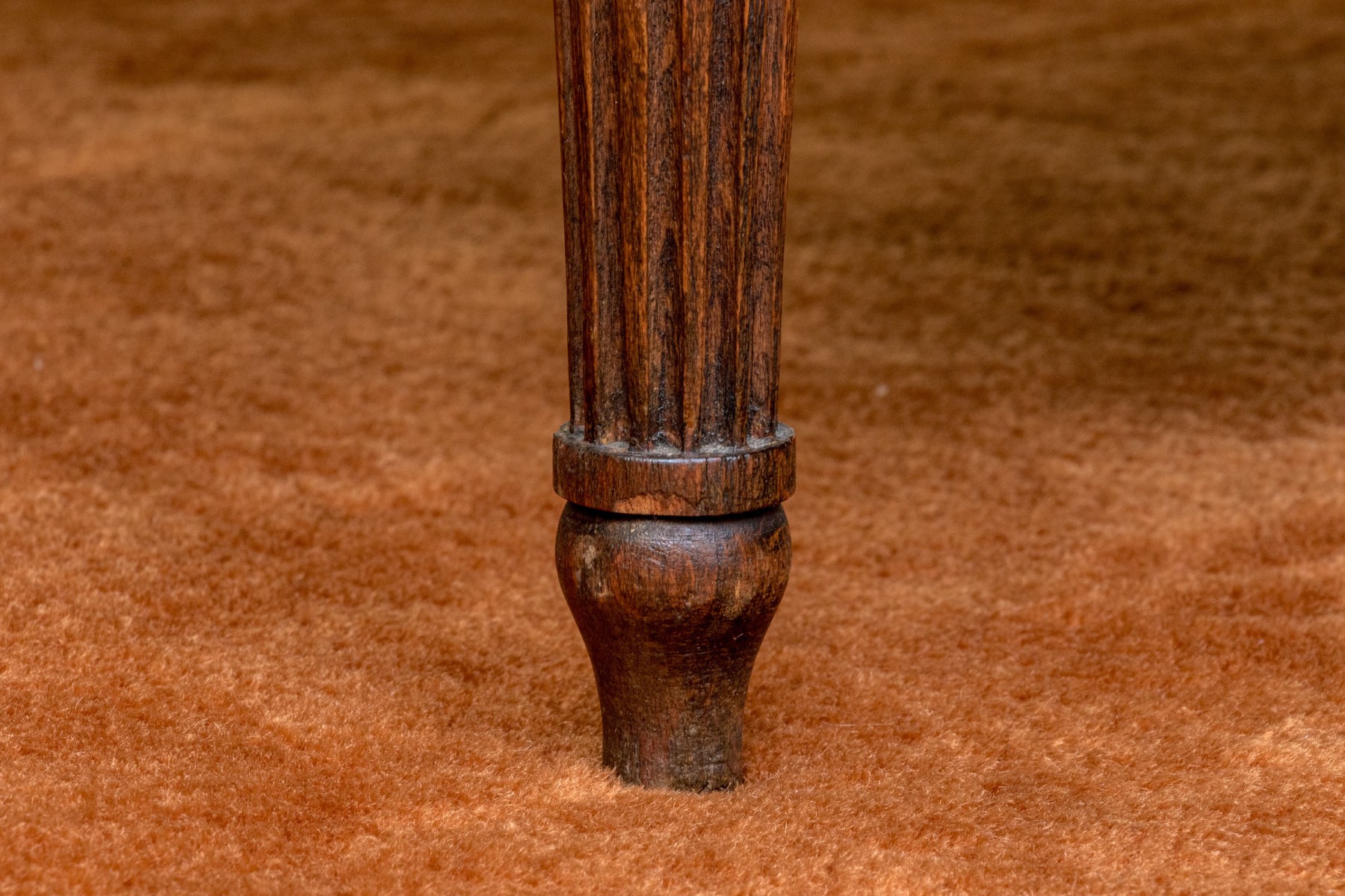 Fluted front legs with foliate carved embellishment in relief.