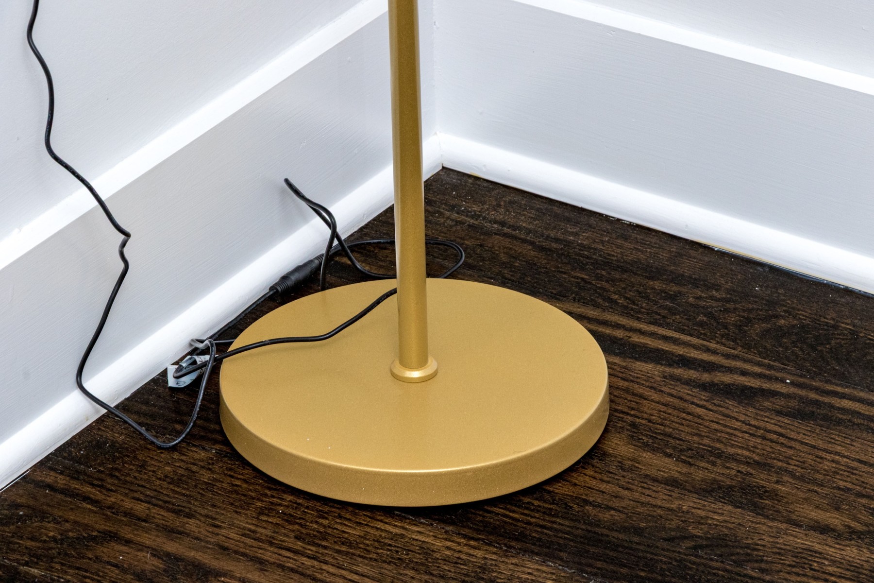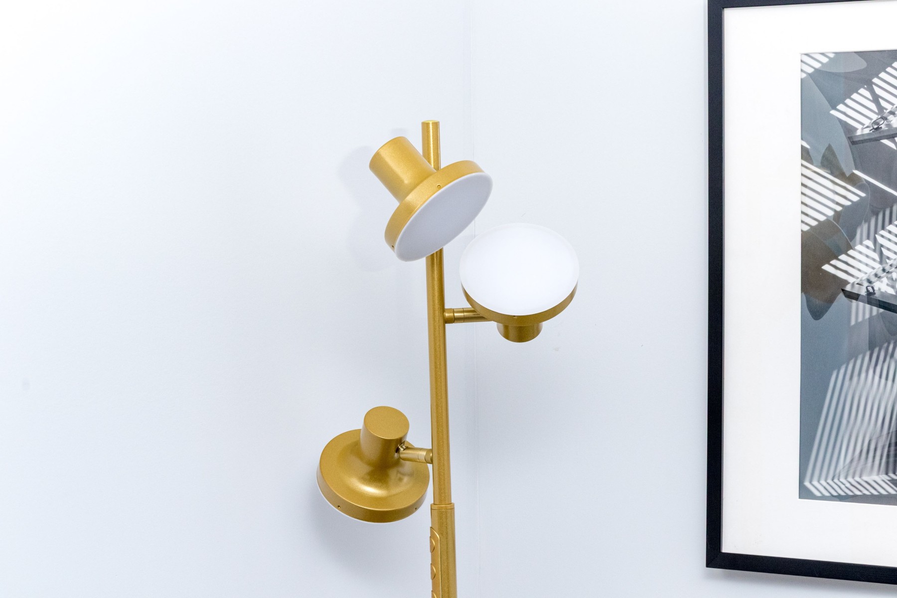 On circular base, the central vertical pole hosts three adjustable shaded bulbs. Buttons on the vertical pole to turn on each bulb. Each bulb has four settings which are attained by pressing the button, one is lower and warmer and the higher settings are bright white.