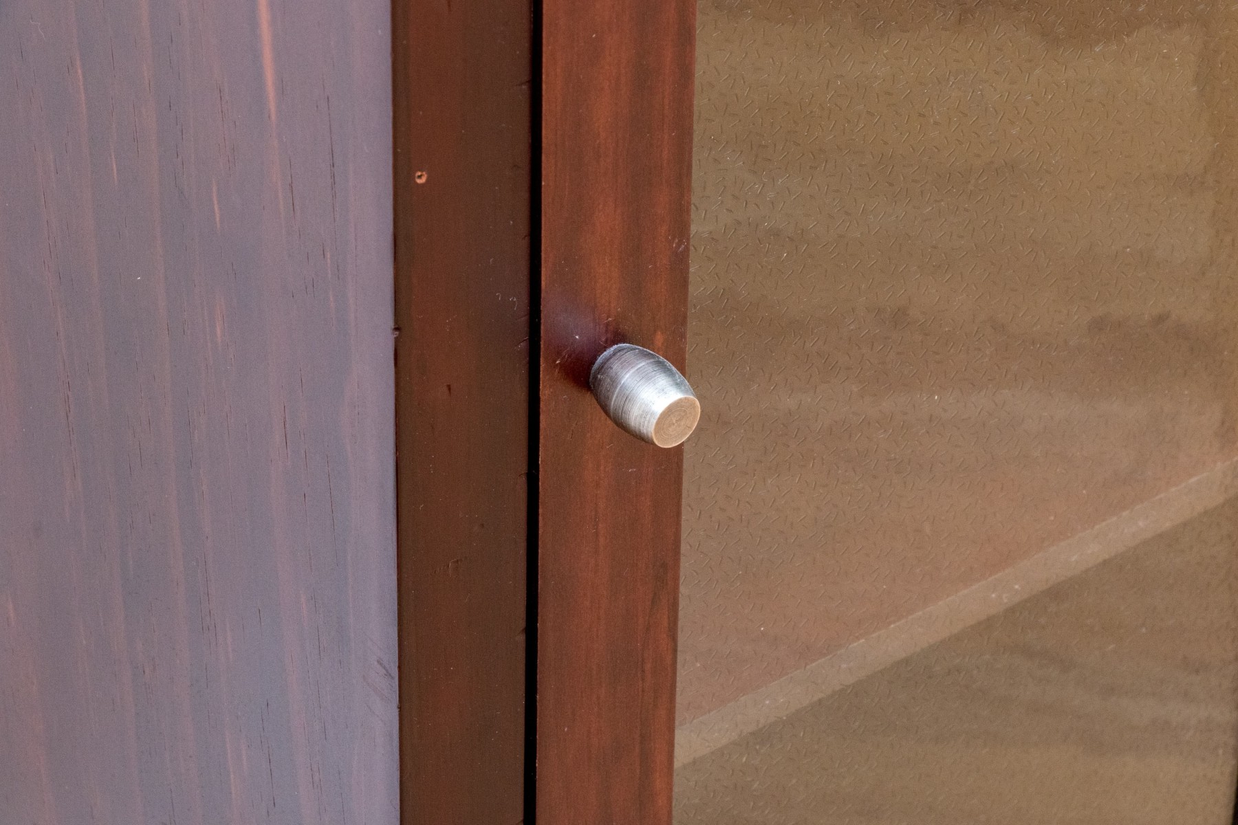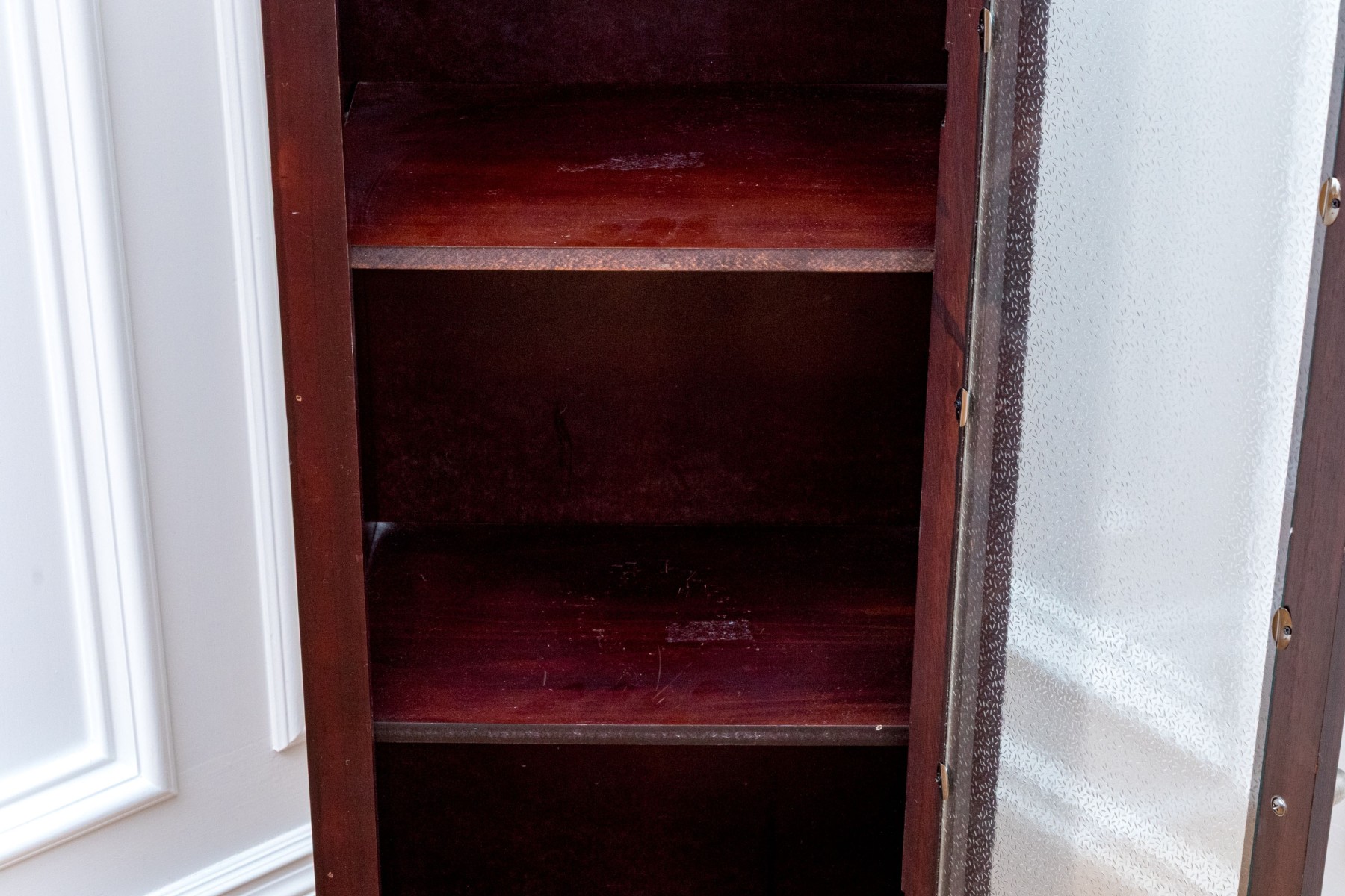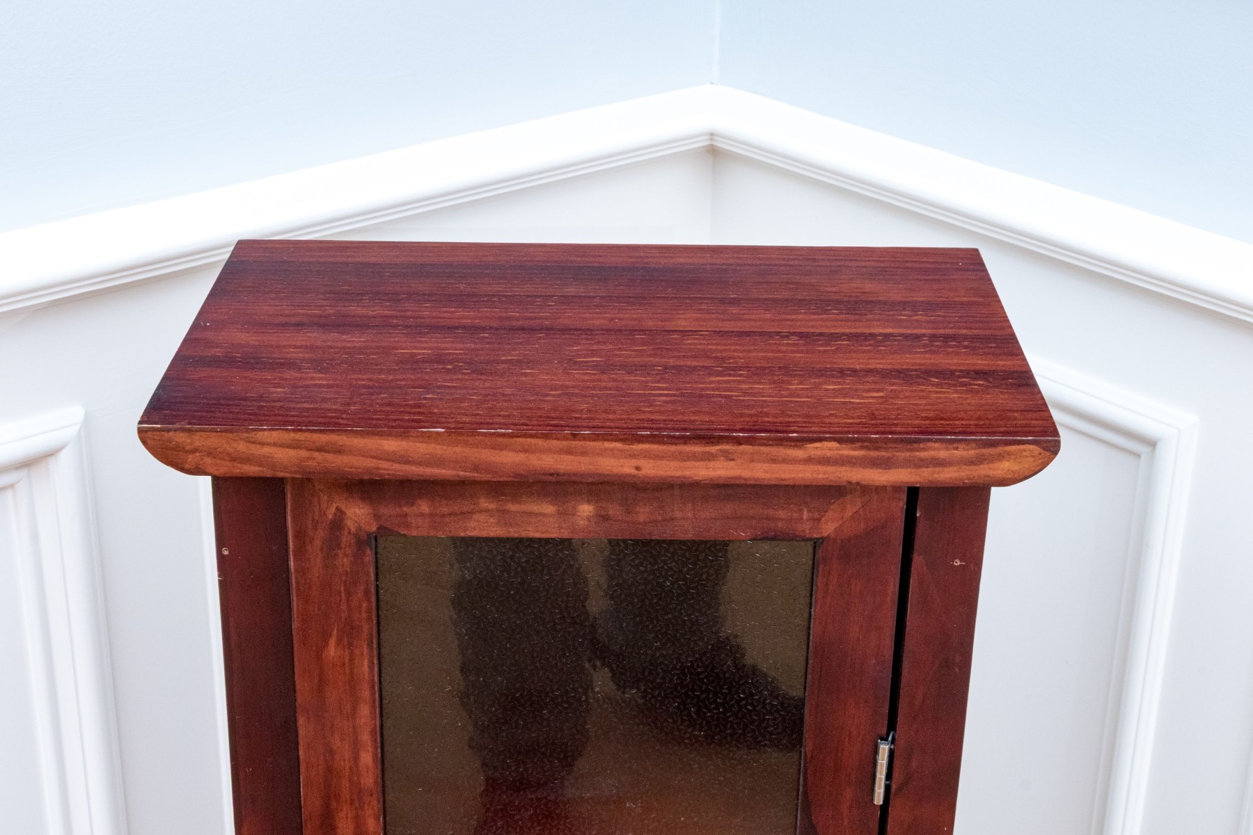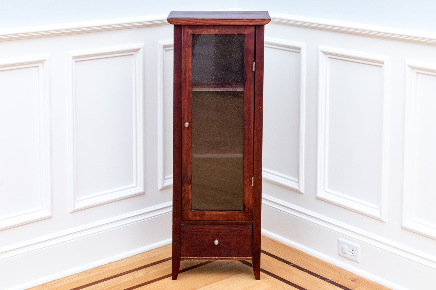 A fabulous tall and narrow display cabinet with versatile arts and crafts, Regency, and transitional appeal. The cabinet is finished in a rich red-brown hue and features a straight top with a beveled underside over a single wavy glass paned door opening to two shelves within. Raised over a single drawer on gently flared and tapered legs.