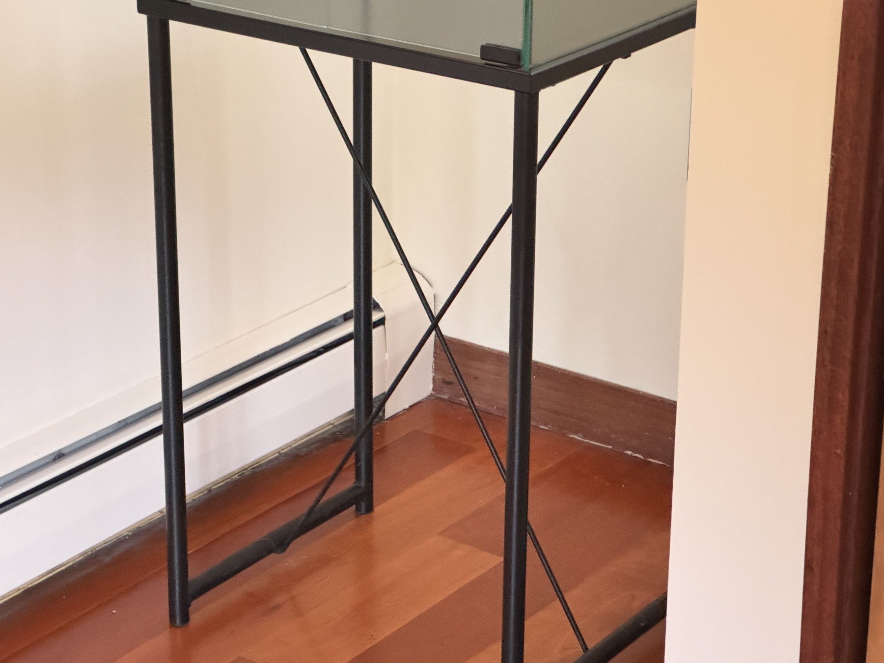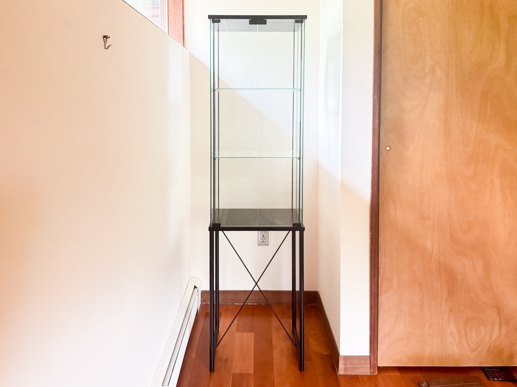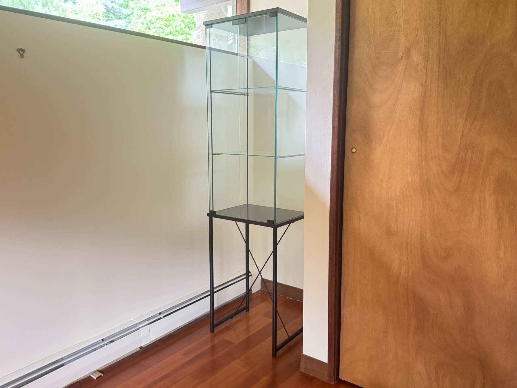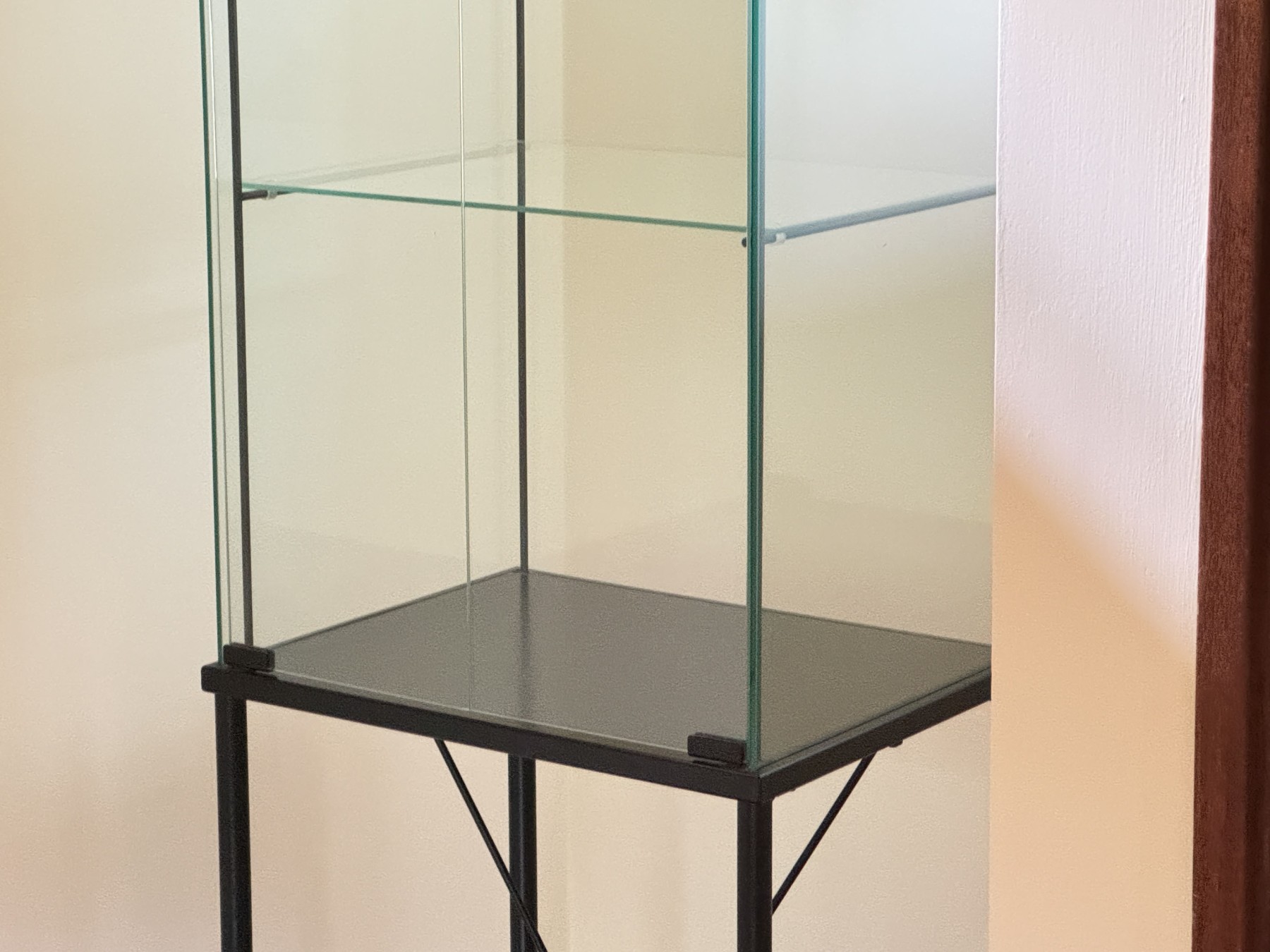 A handsome vitrine showcasing a rectangular glass display case with double doors opening to two glass shelves within, supported by a black metal base with a vertical X-stretcher support.