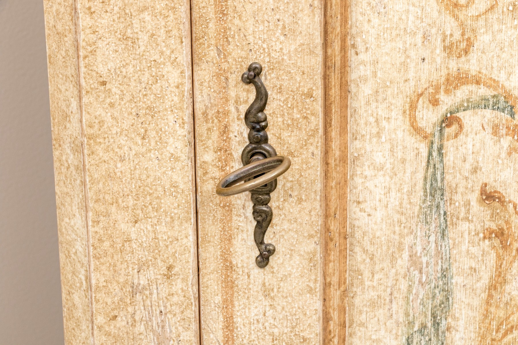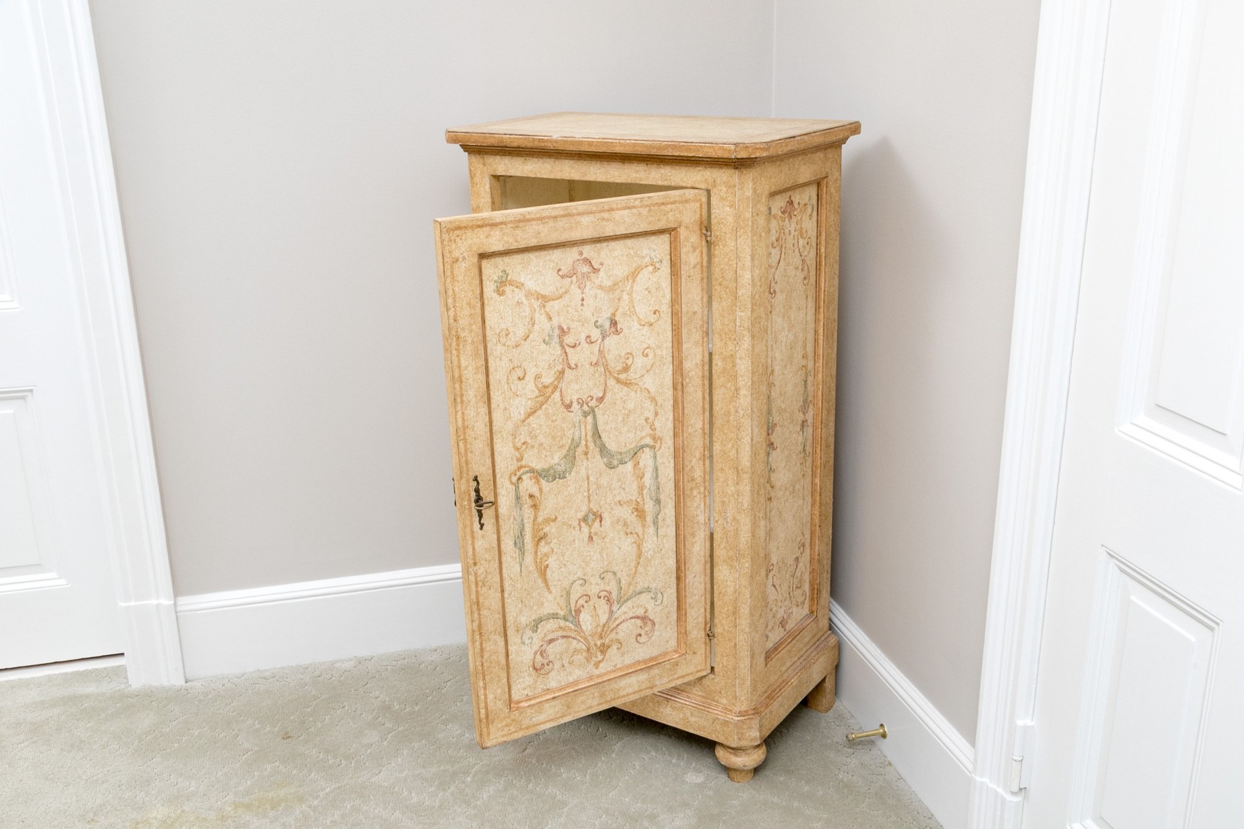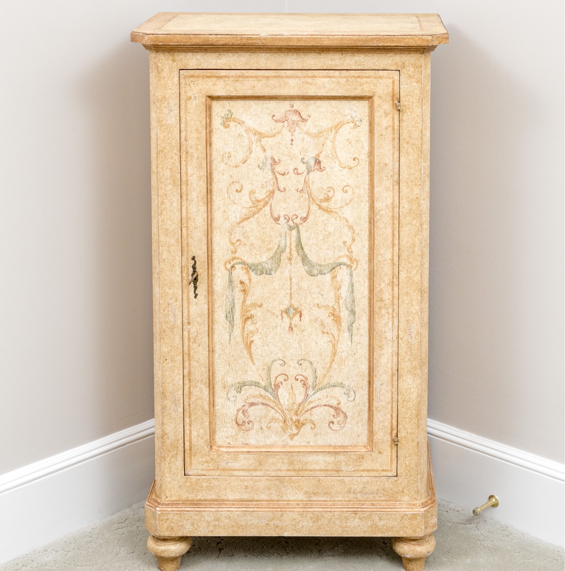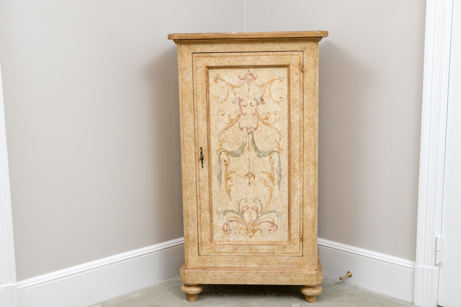 A handsome side cabinet in Italian Baroque style, painted in mottled warm cream with a cut-corner square top over a tall single cabinet door paneled and painted with an elegant design of scrolled foliate in orange, red, and green, opening to a shelved interior.