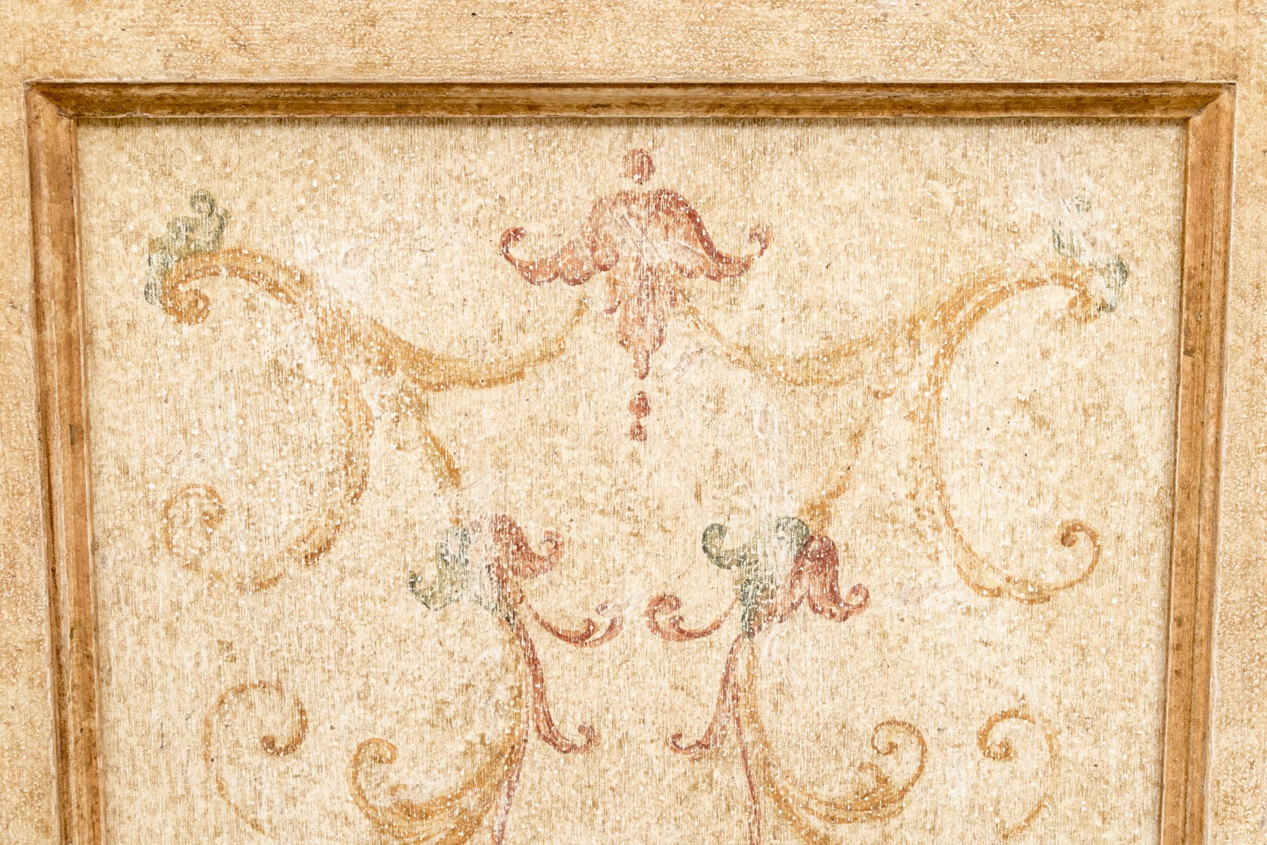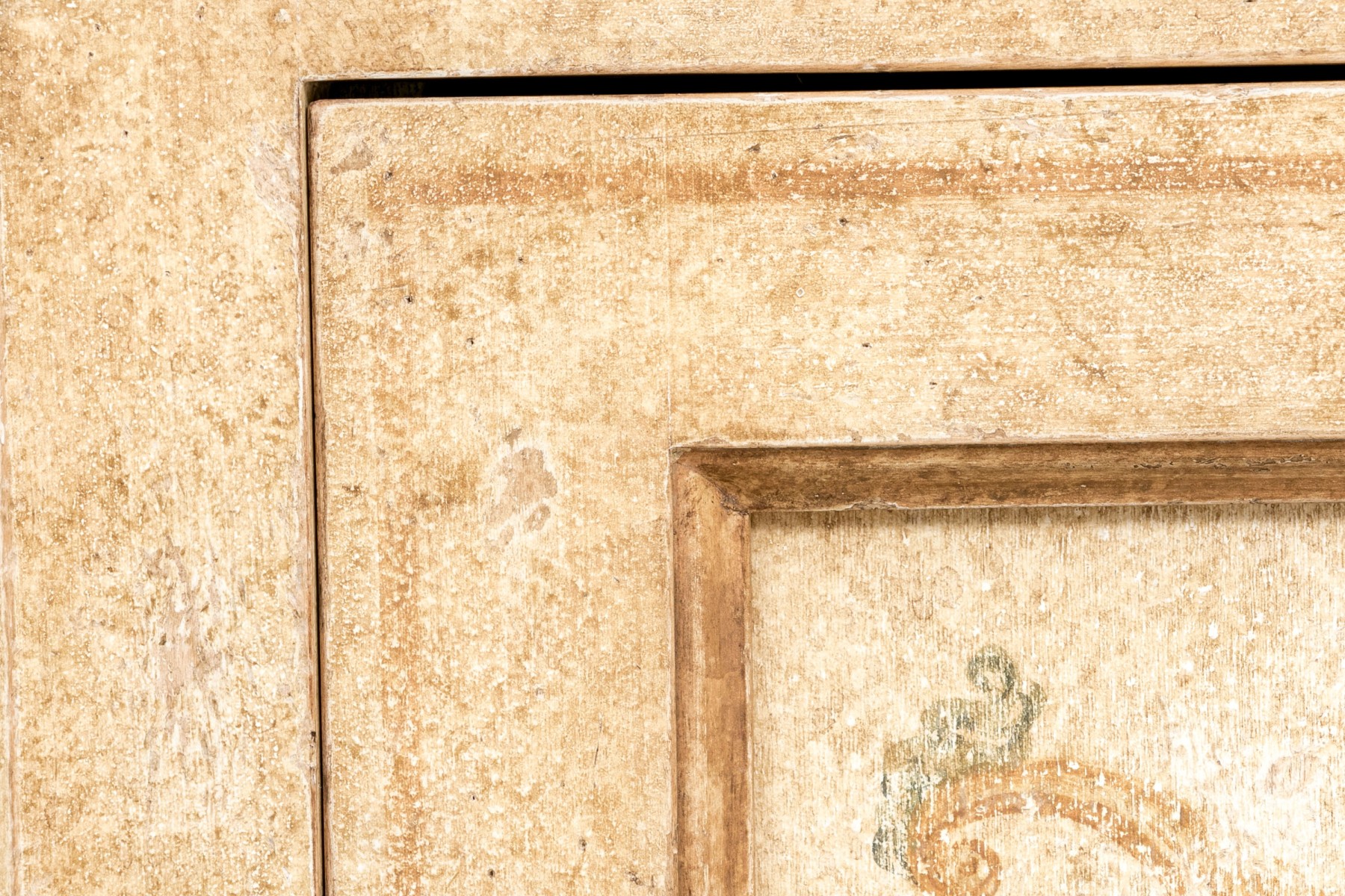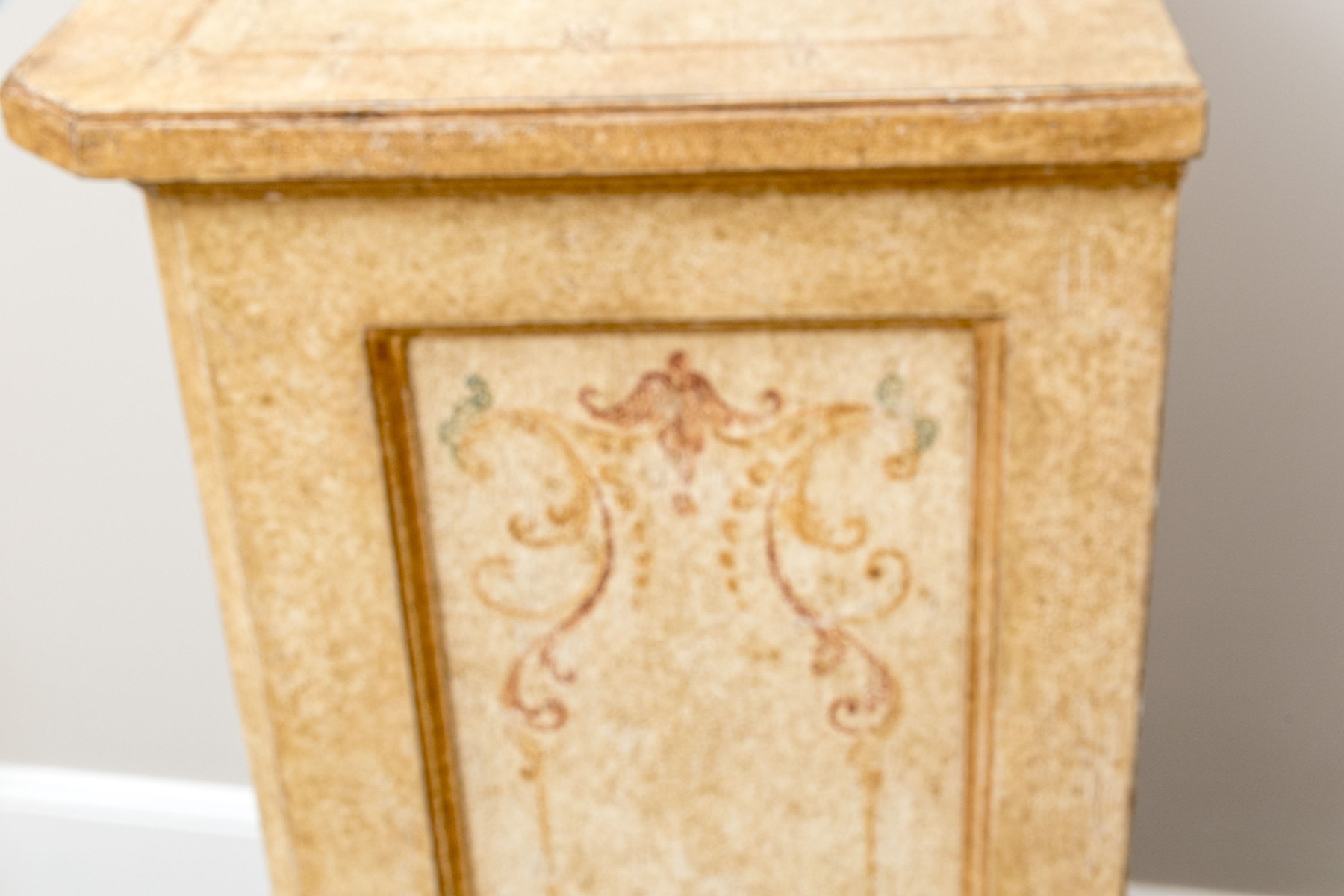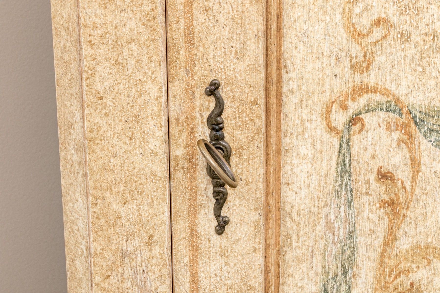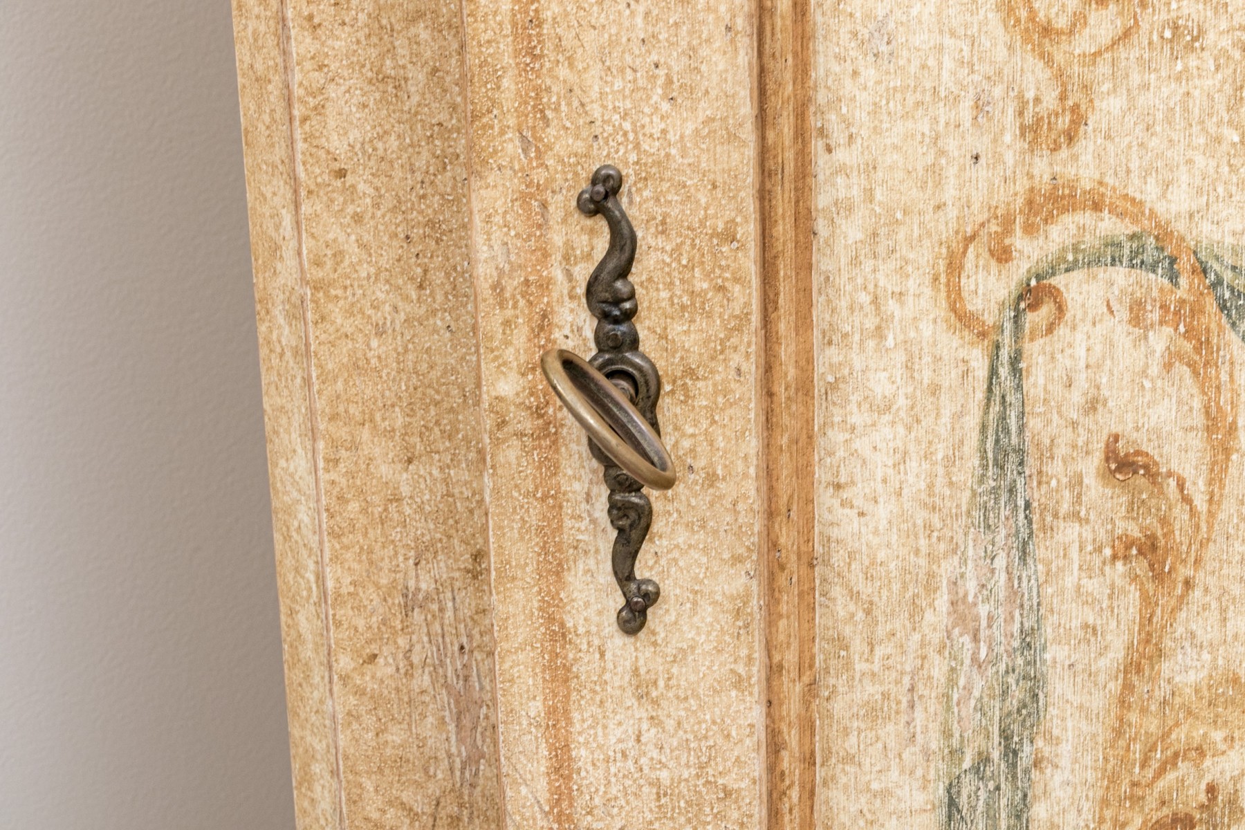 A handsome side cabinet in Italian Baroque style, painted in mottled warm cream with a cut-corner square top over a tall single cabinet door paneled and painted with an elegant design of scrolled foliate in orange, red, and green, opening to a shelved interior.