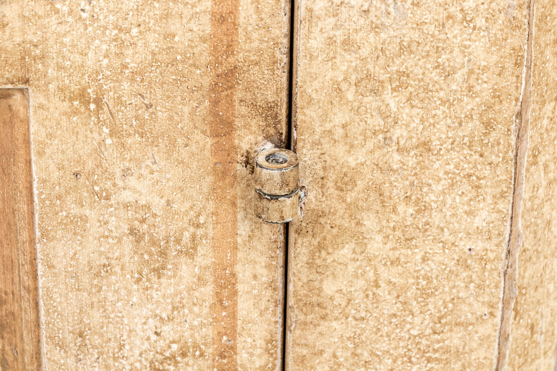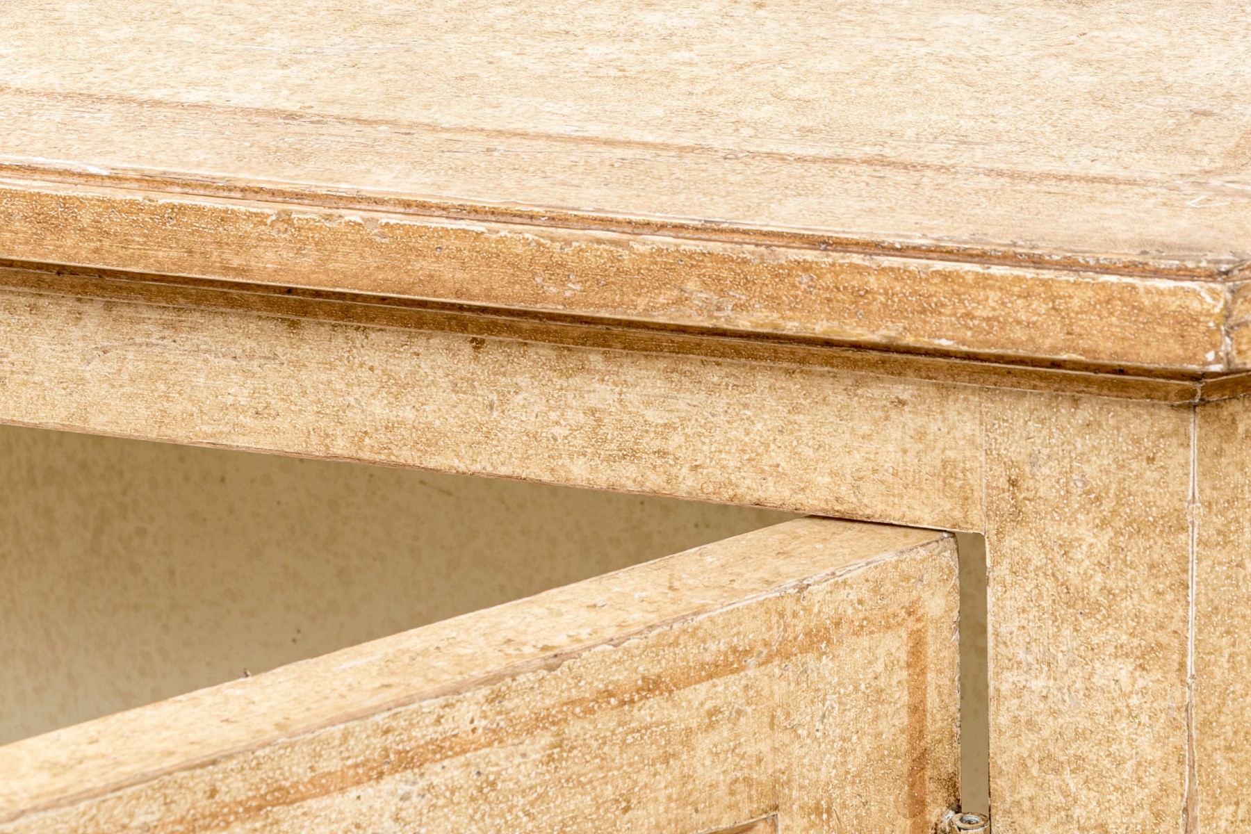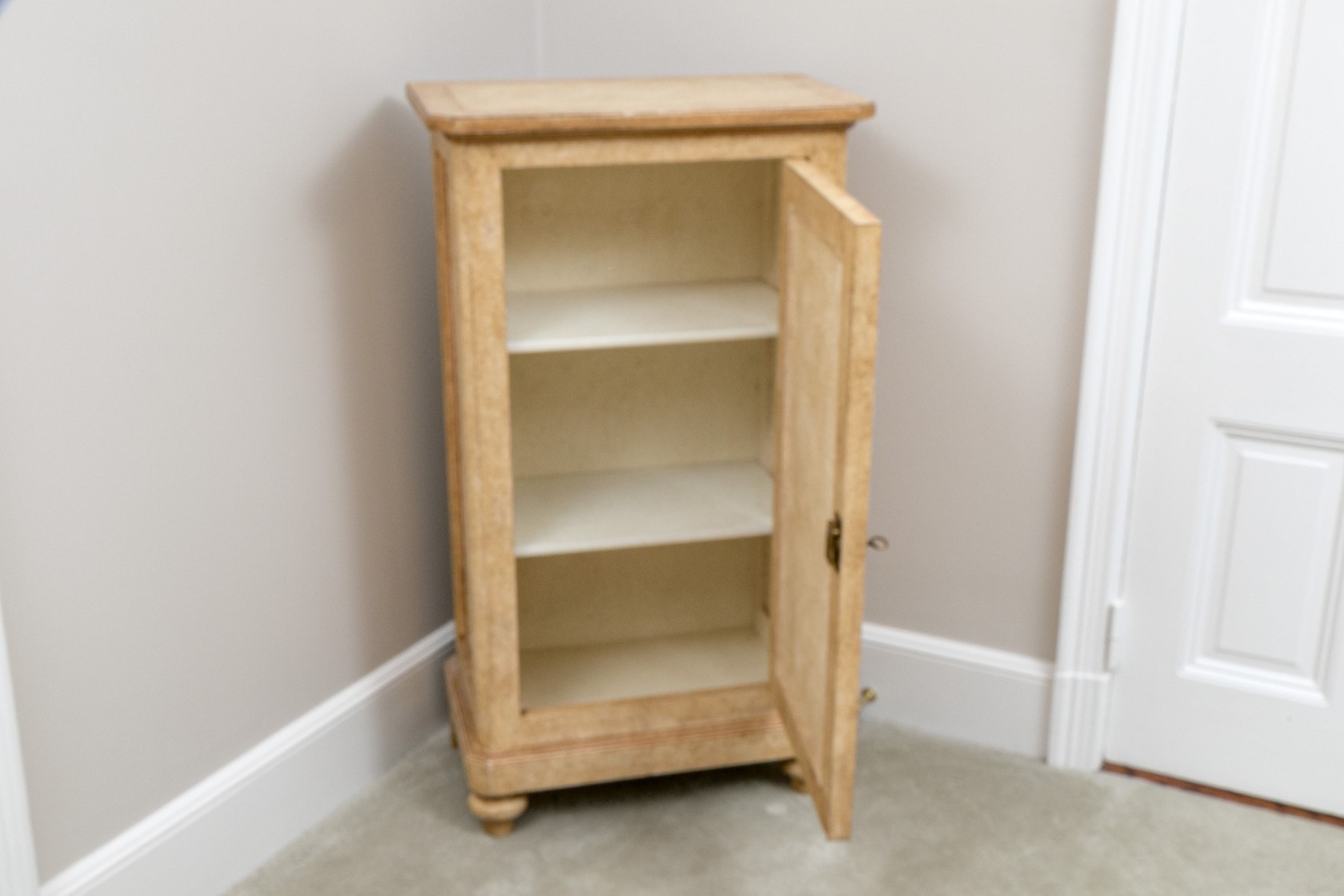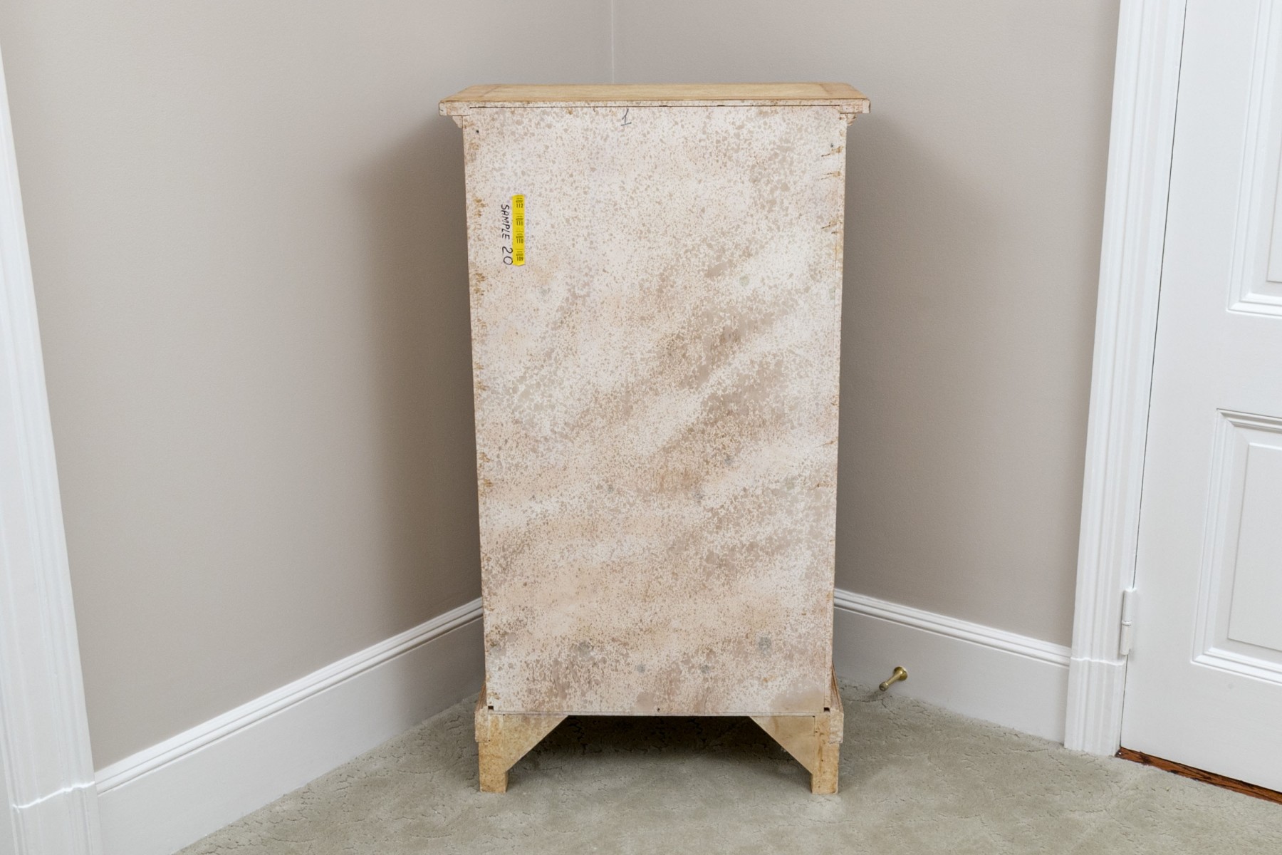 A handsome side cabinet in Italian Baroque style, painted in mottled warm cream with a cut-corner square top over a tall single cabinet door paneled and painted with an elegant design of scrolled foliate in orange, red, and green, opening to a shelved interior.