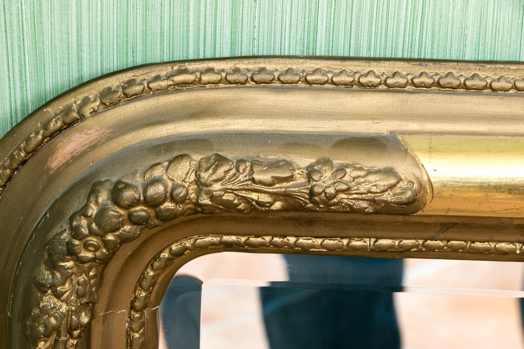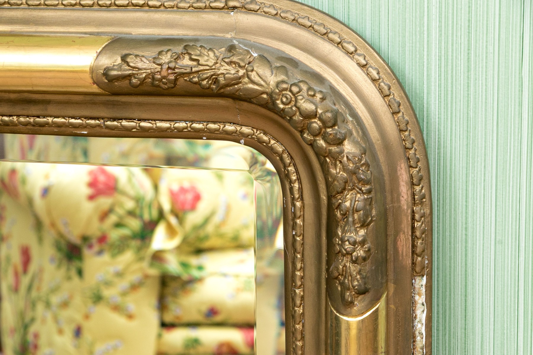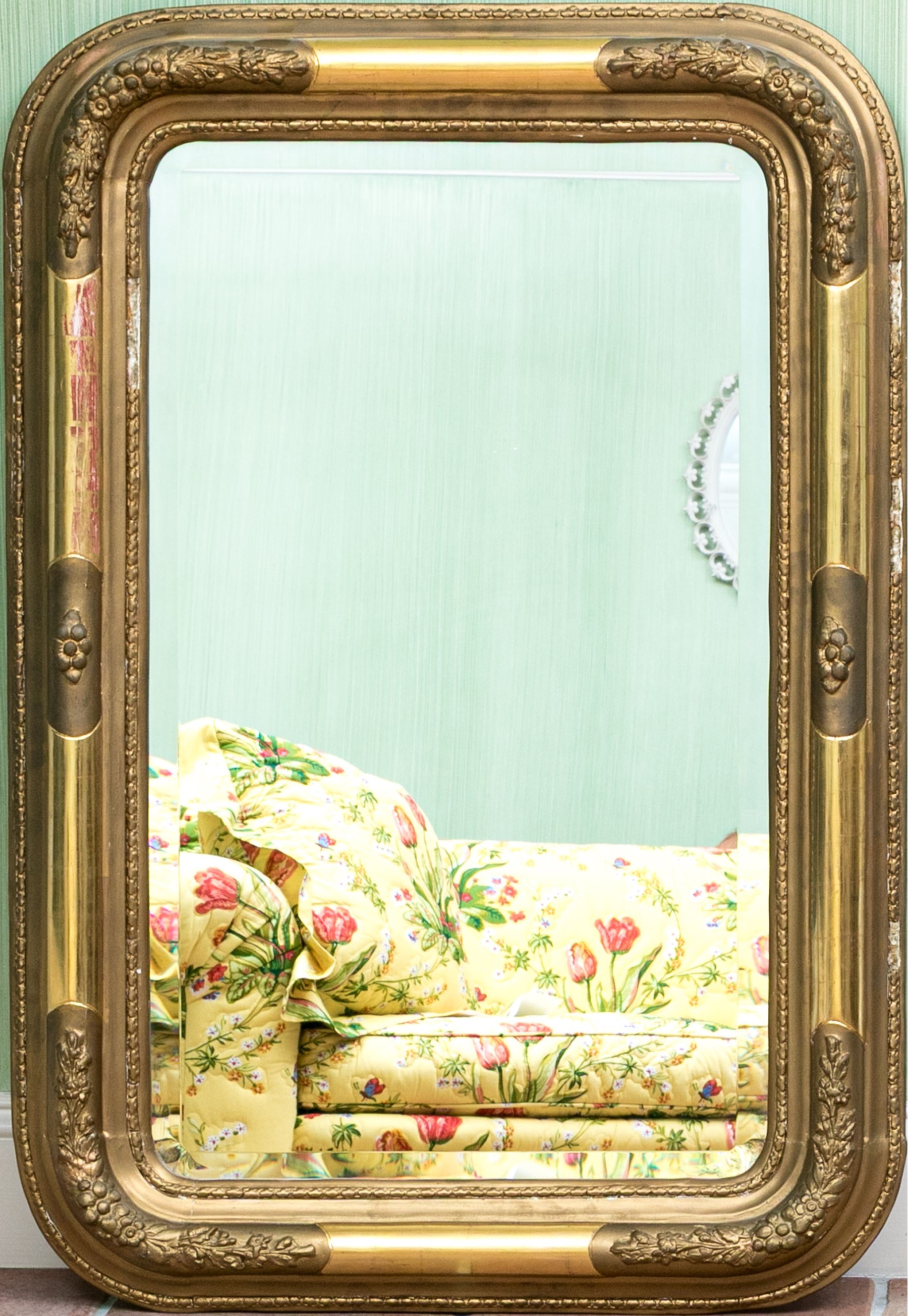 A rectangular beveled mirror with rounded corners in an elegant Louis Philippe style frame with high sheen gilt borders beautifully contrasting patinaed gesso relief borders of foliate and floral motifs.