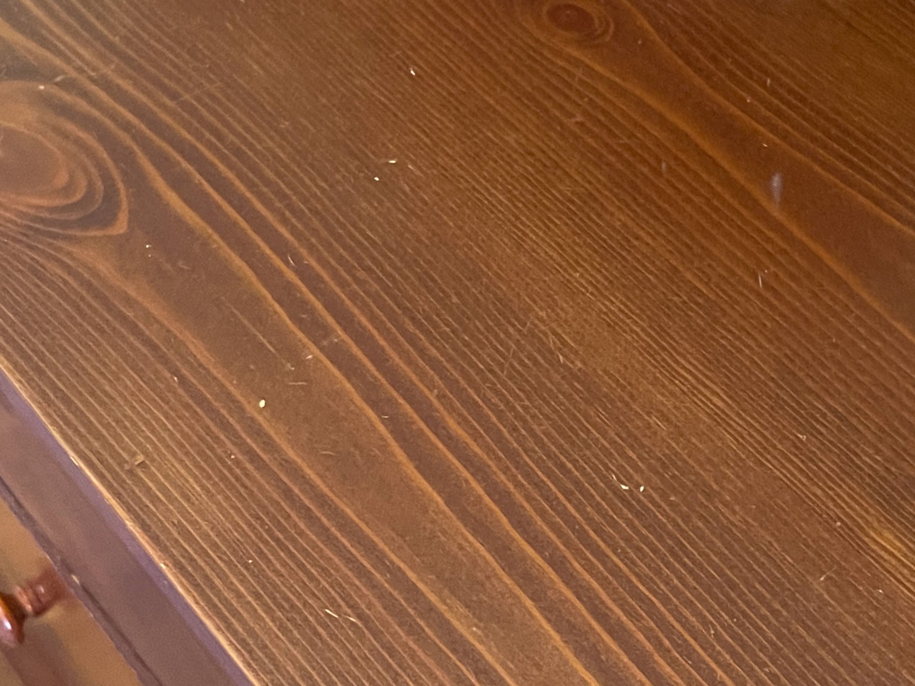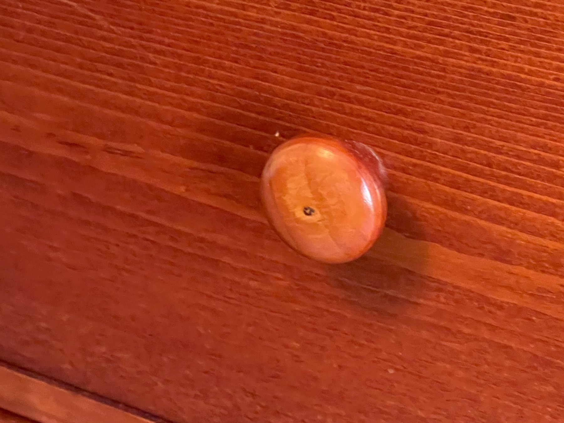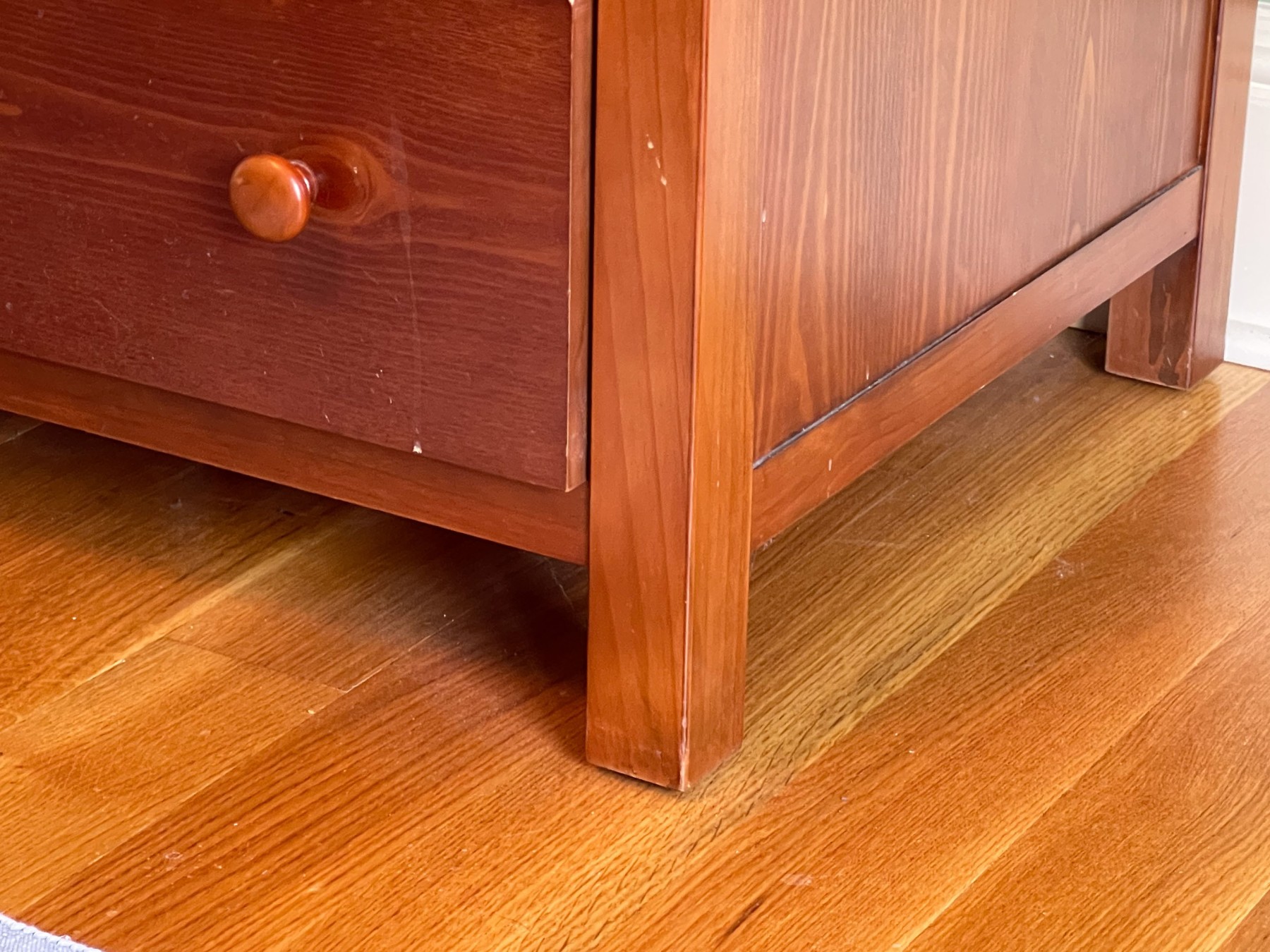 Handsome chest of drawers with 6 drawers. Raised on four short feet the chest is arranged horizontally with two bays of three drawers on either side. Each opened with a turned wood knob pull.
