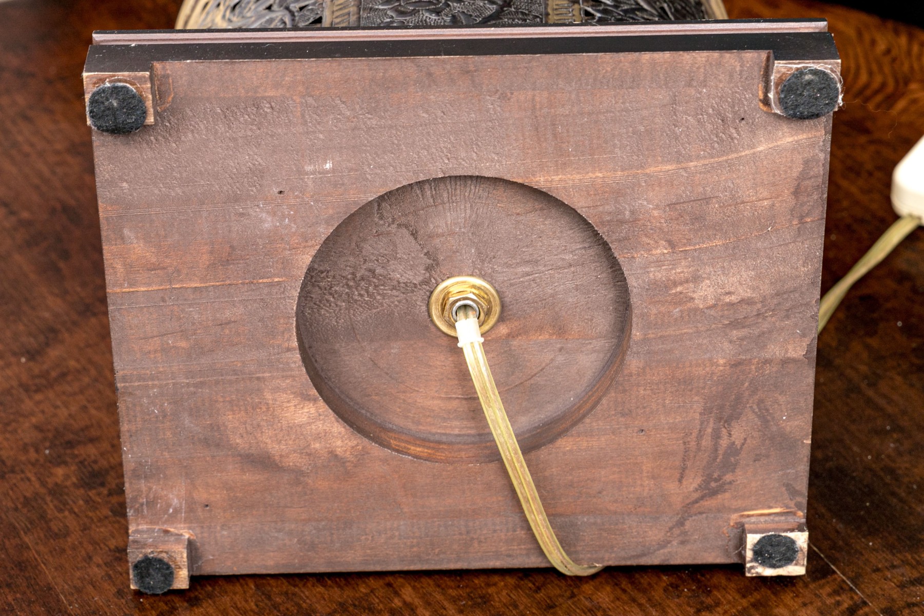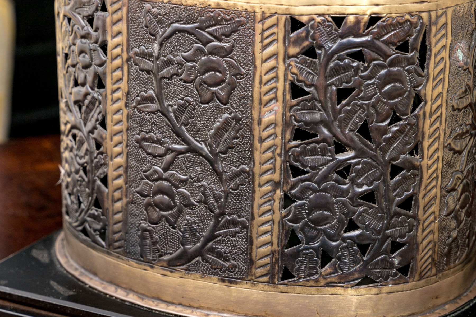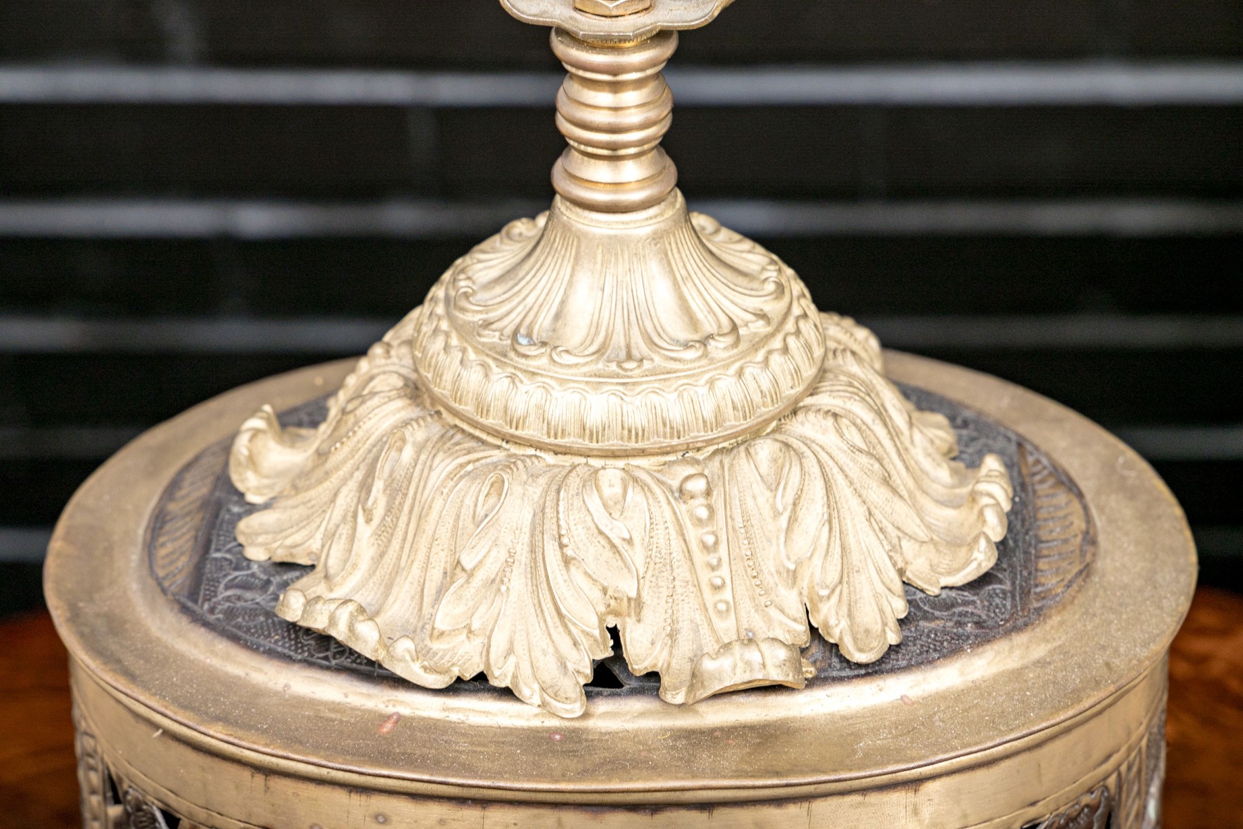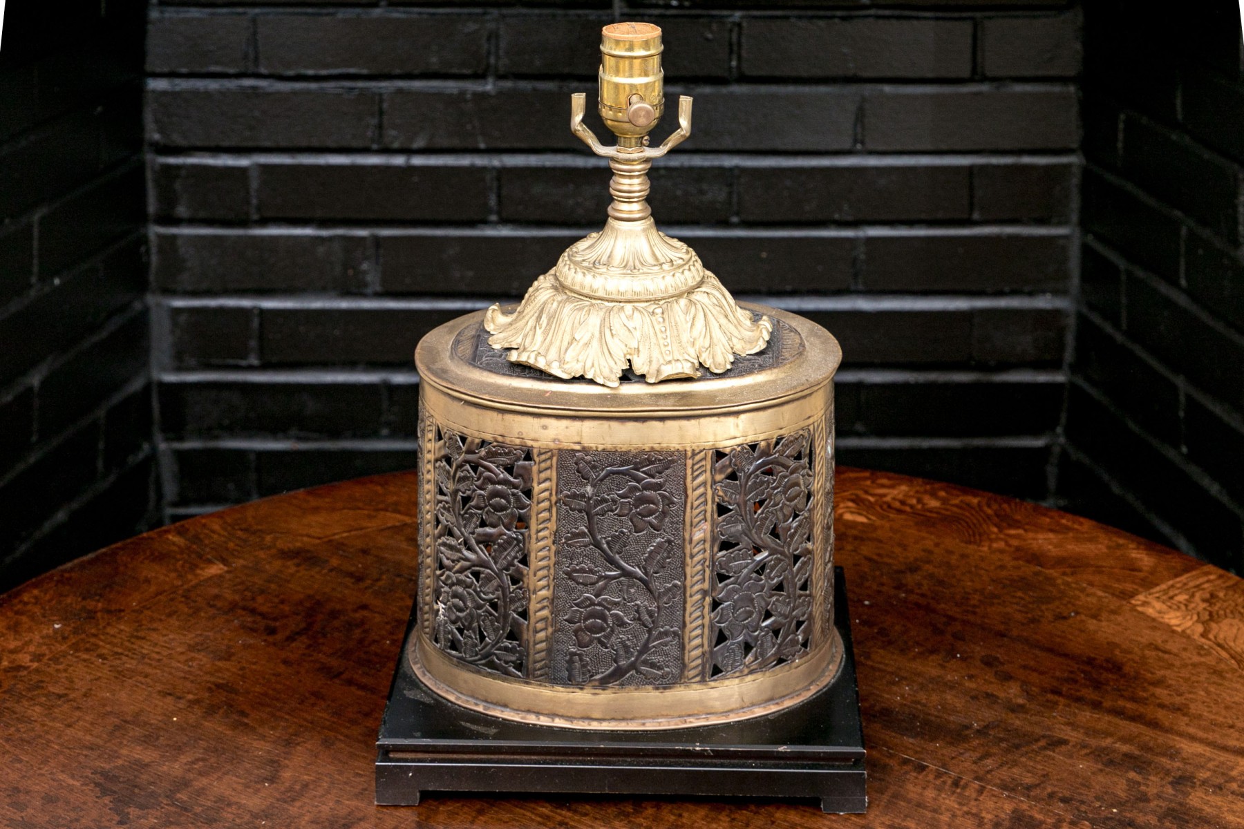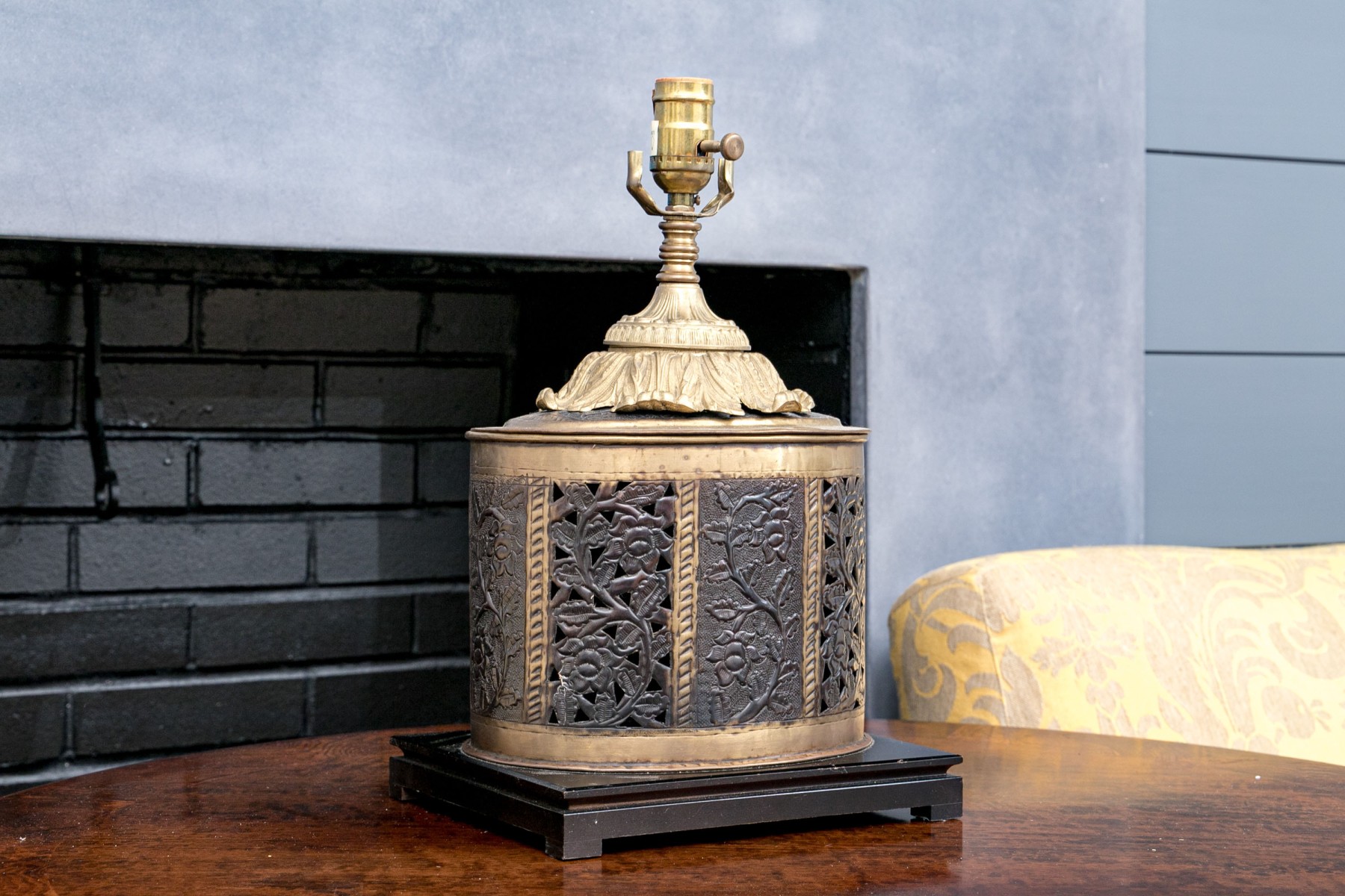On a rectangular base, the oval form table lamp with pierced decoration and gilt finished foliate form top.