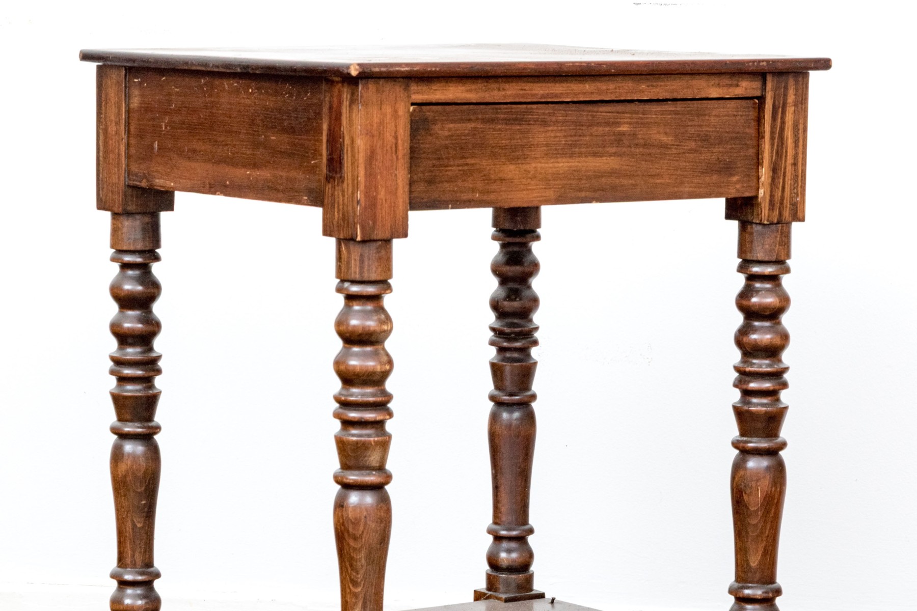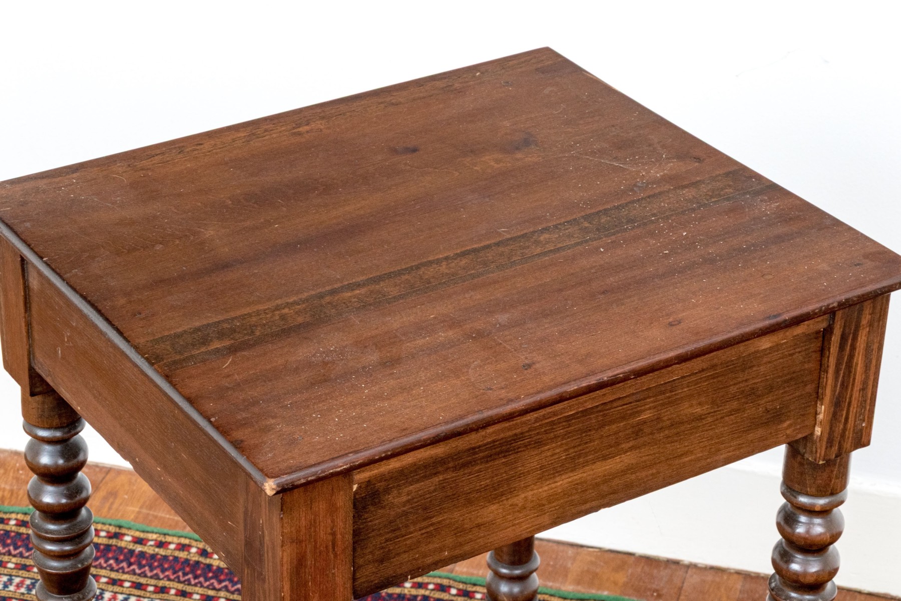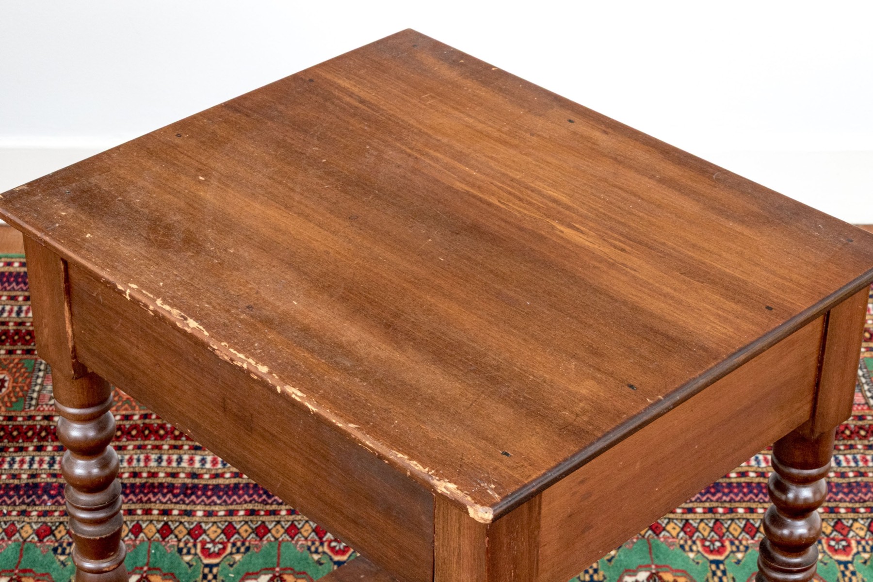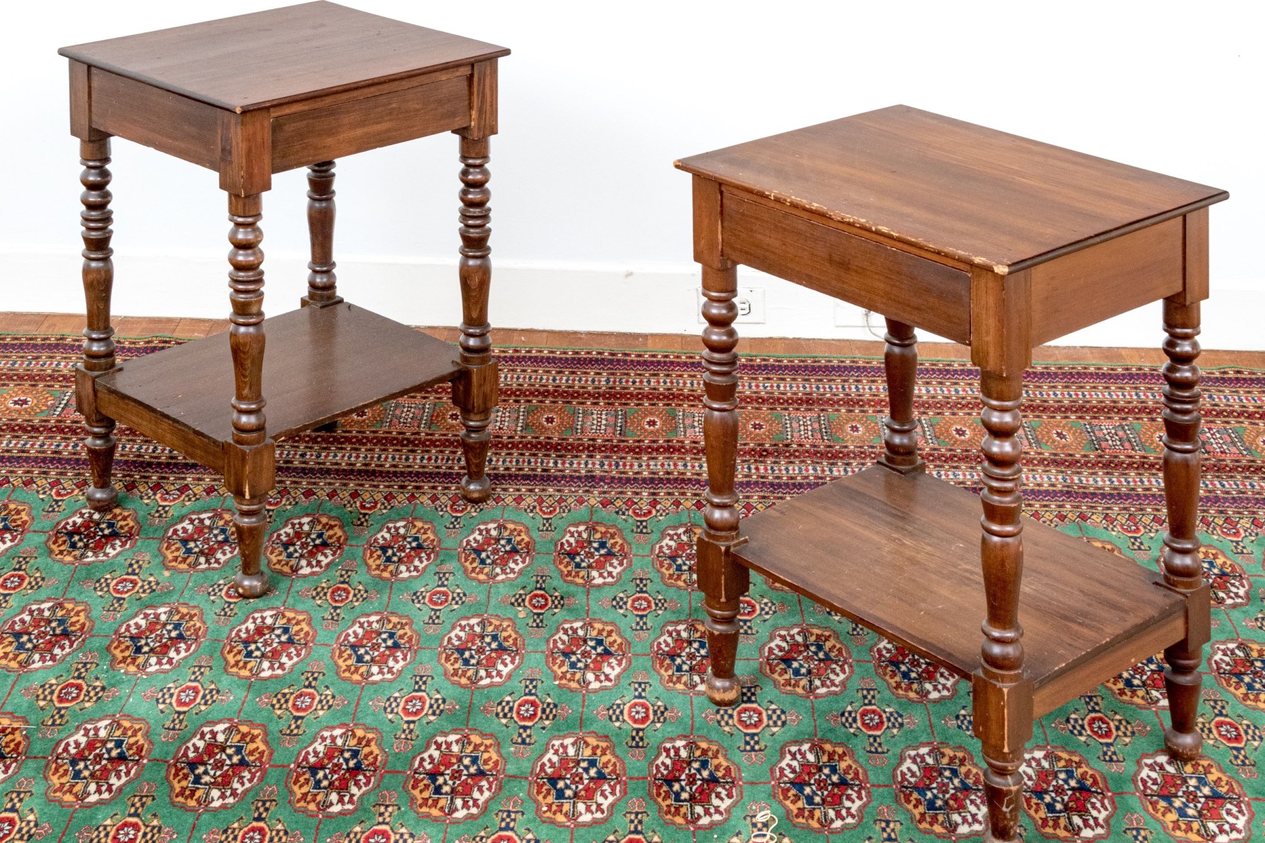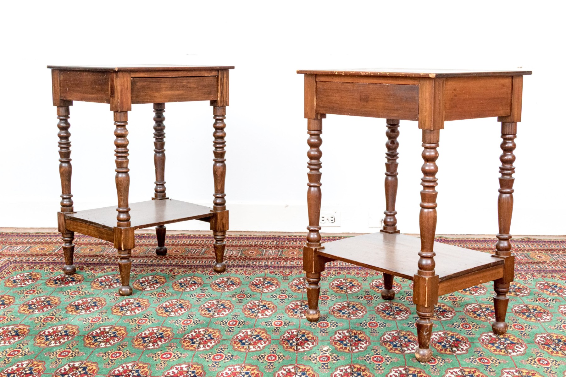 A handsome pair of traditional end tables in a warm medium brown finish, showcasing rectangular tabletops over single drawers supported by nicely turned legs with open lower shelves below.