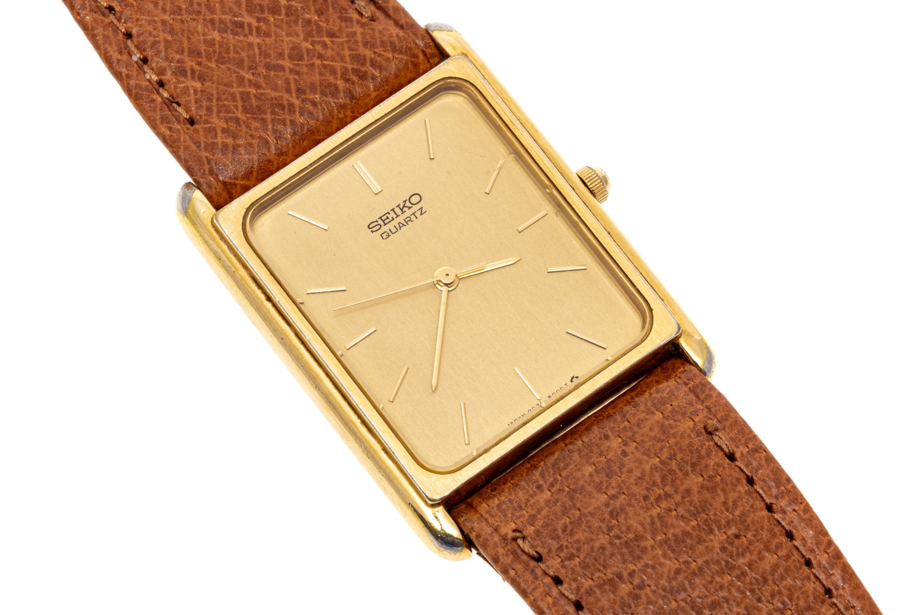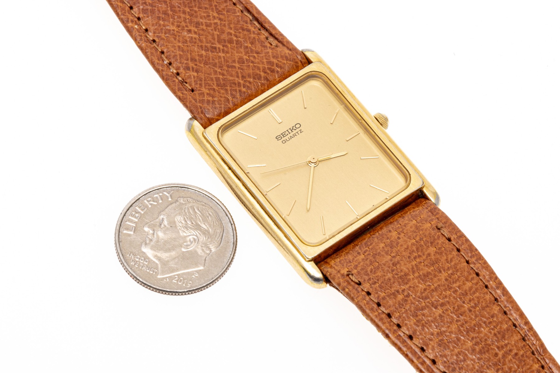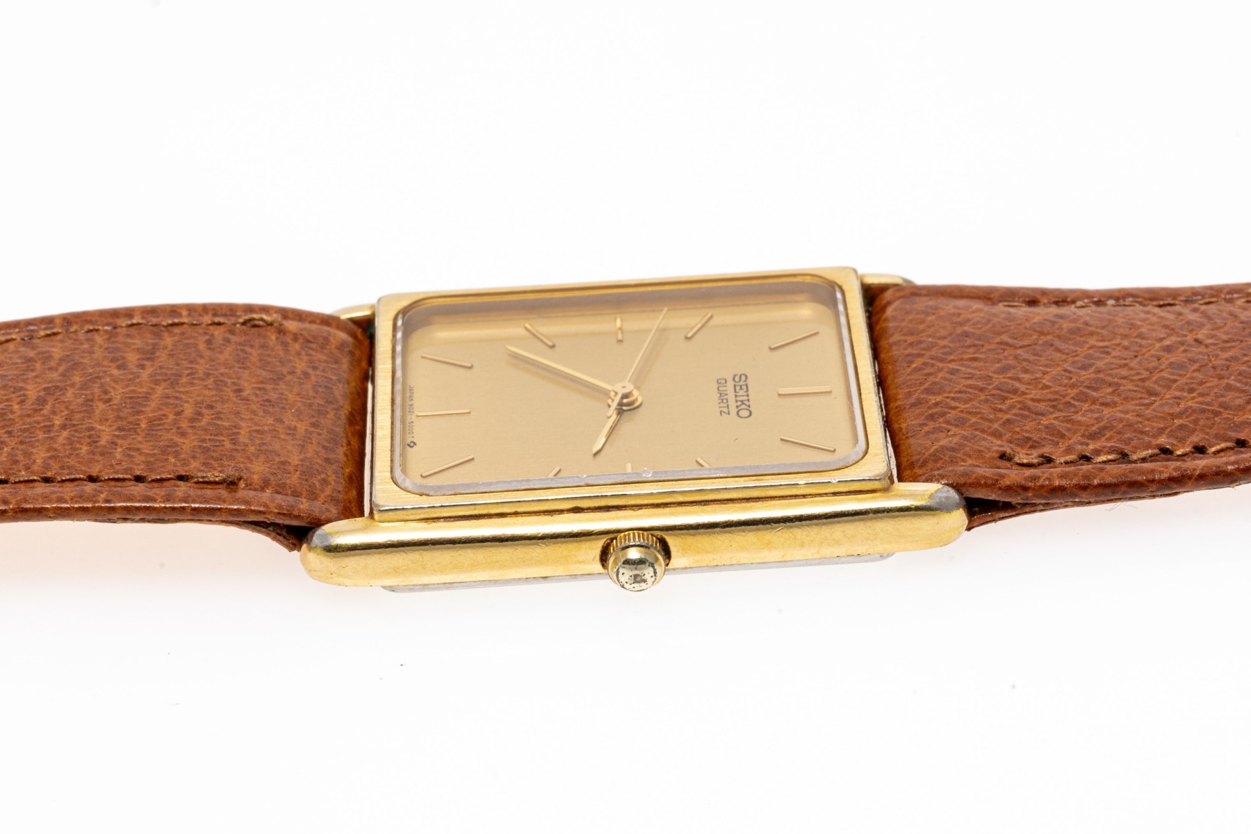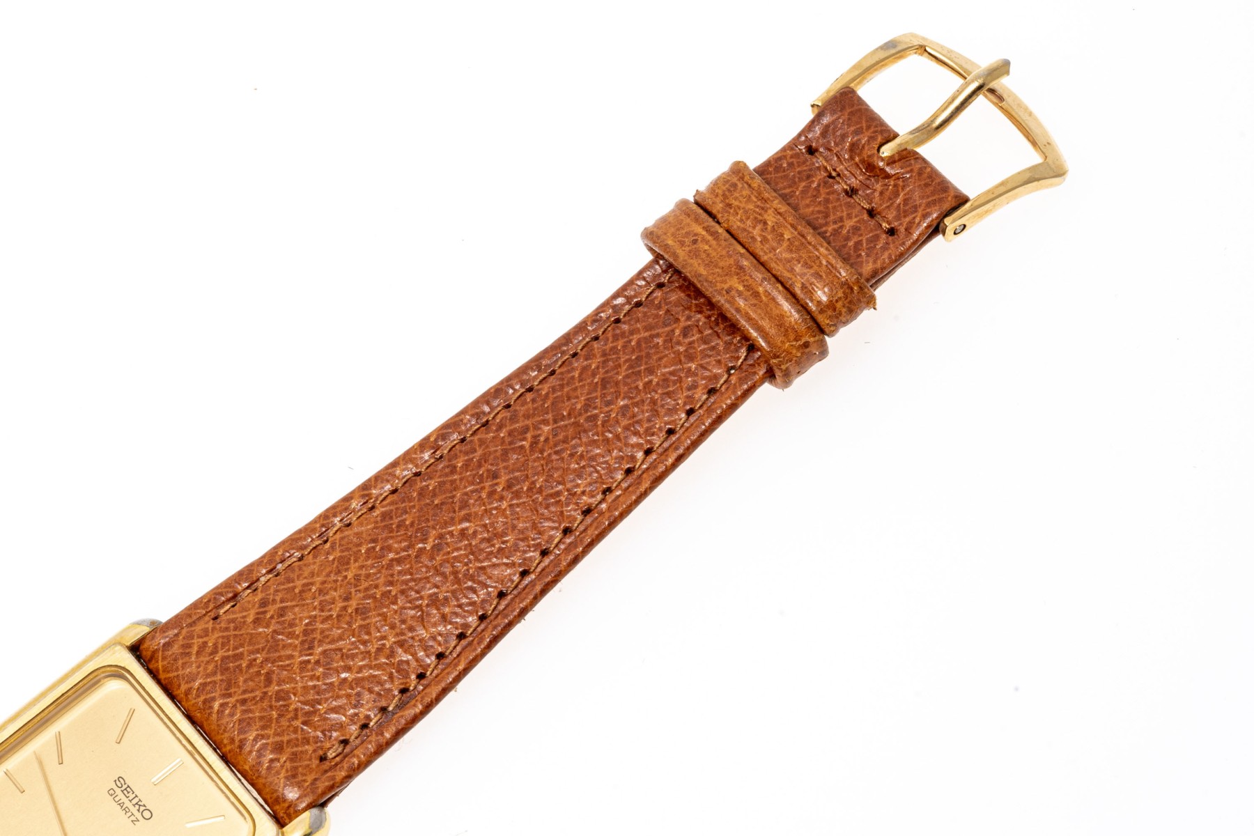 Handsome Seiko watch with a rectangular brushed dial with stick indices. Light brown leather pig skin strap with buckle clasp.