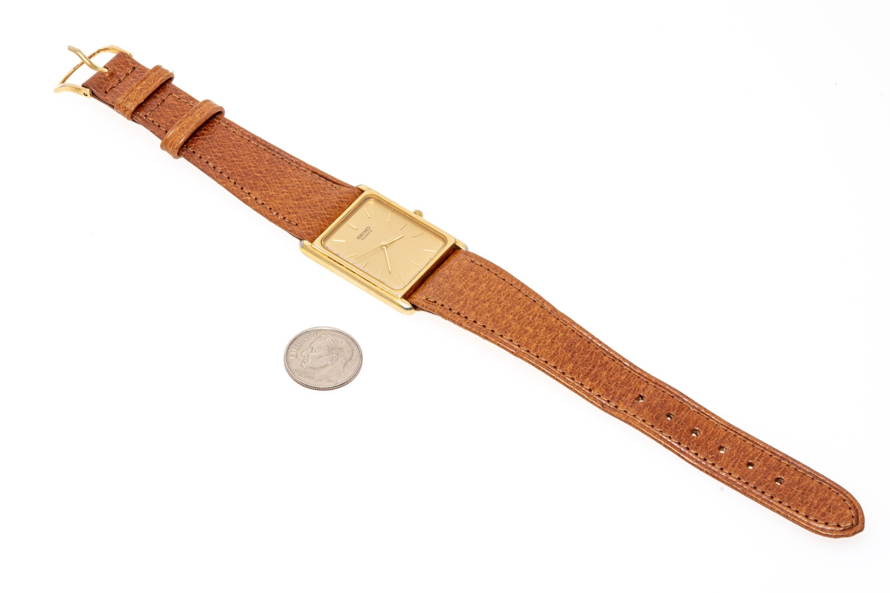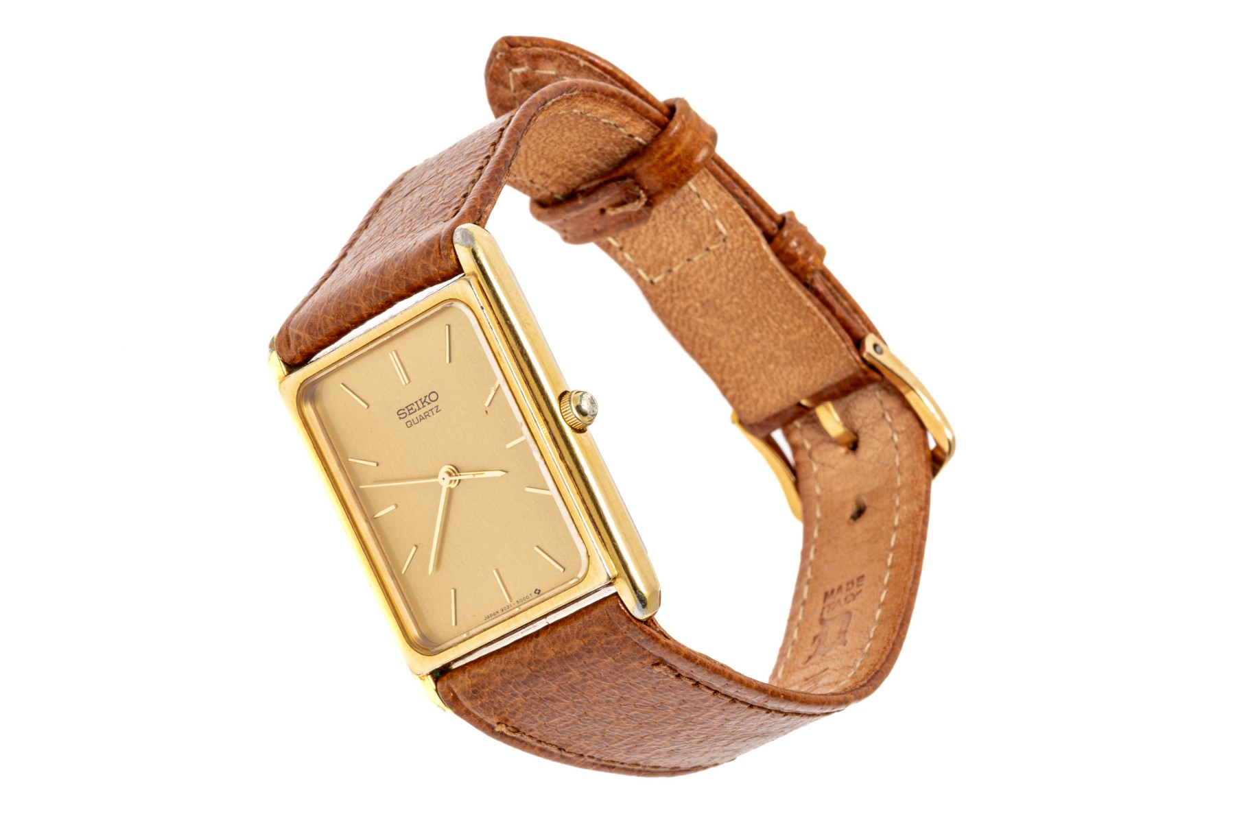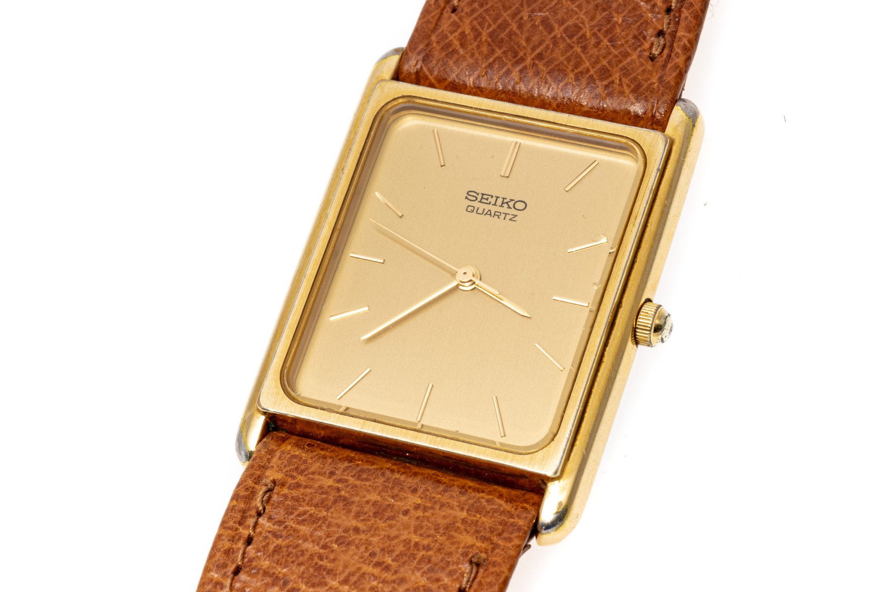 Handsome Seiko watch with a rectangular brushed dial with stick indices. Light brown leather pig skin strap with buckle clasp.