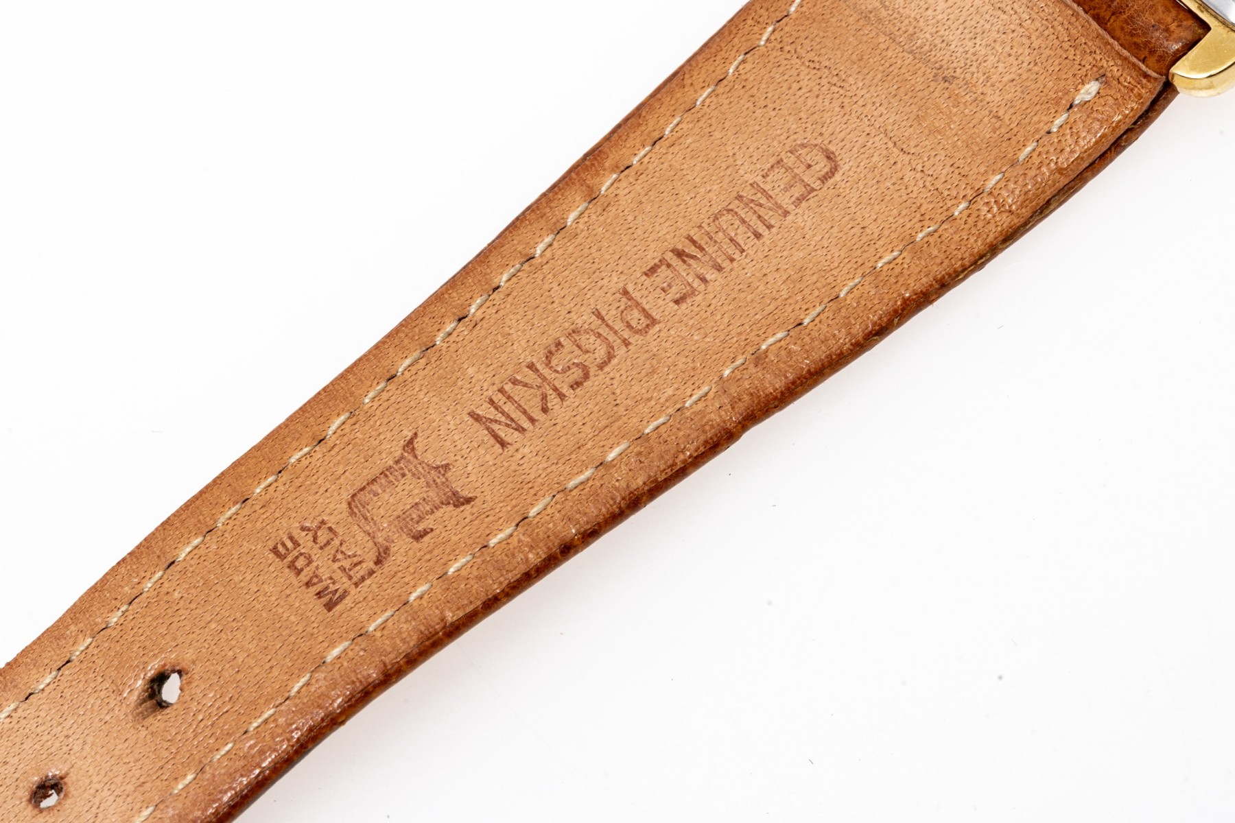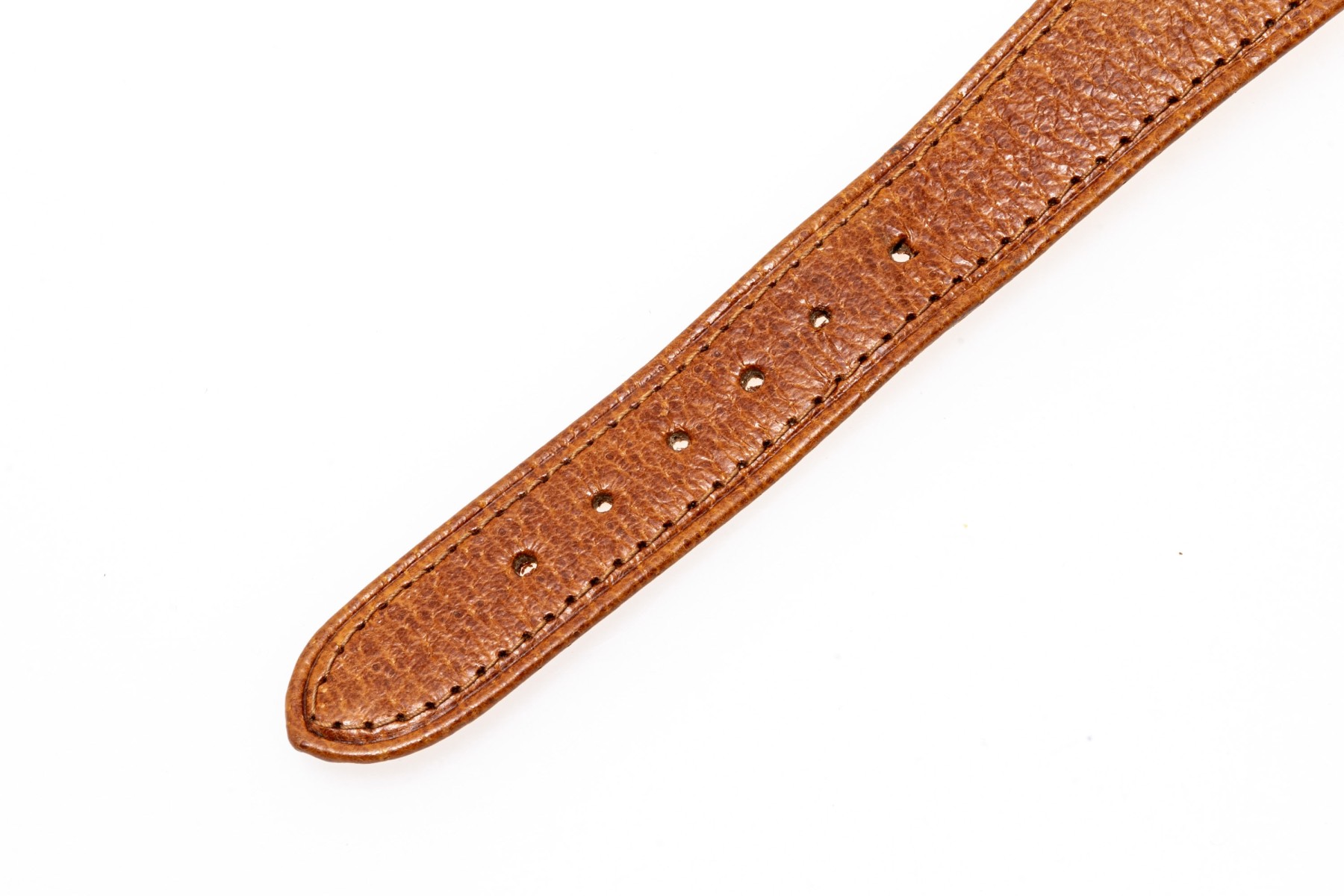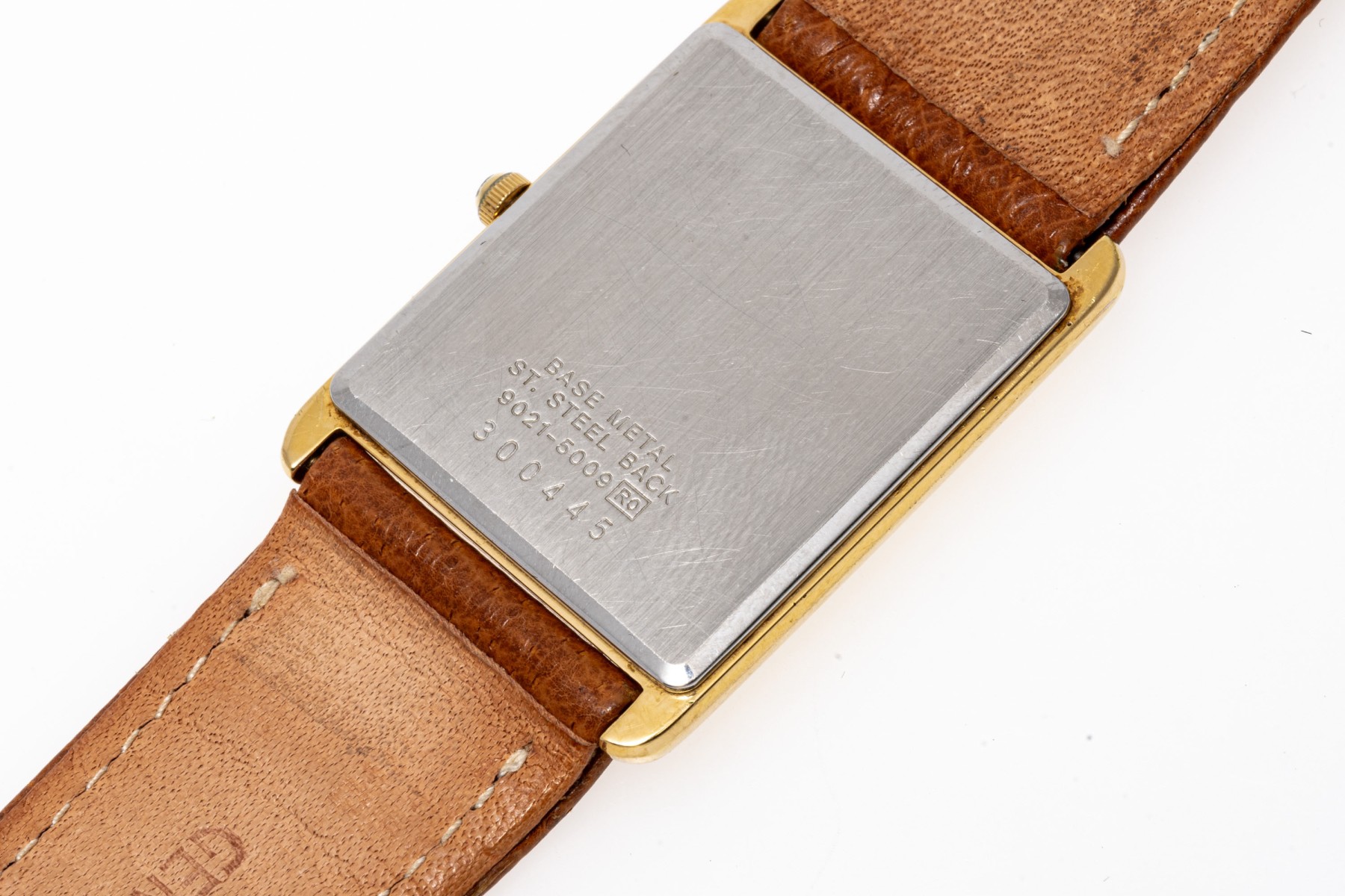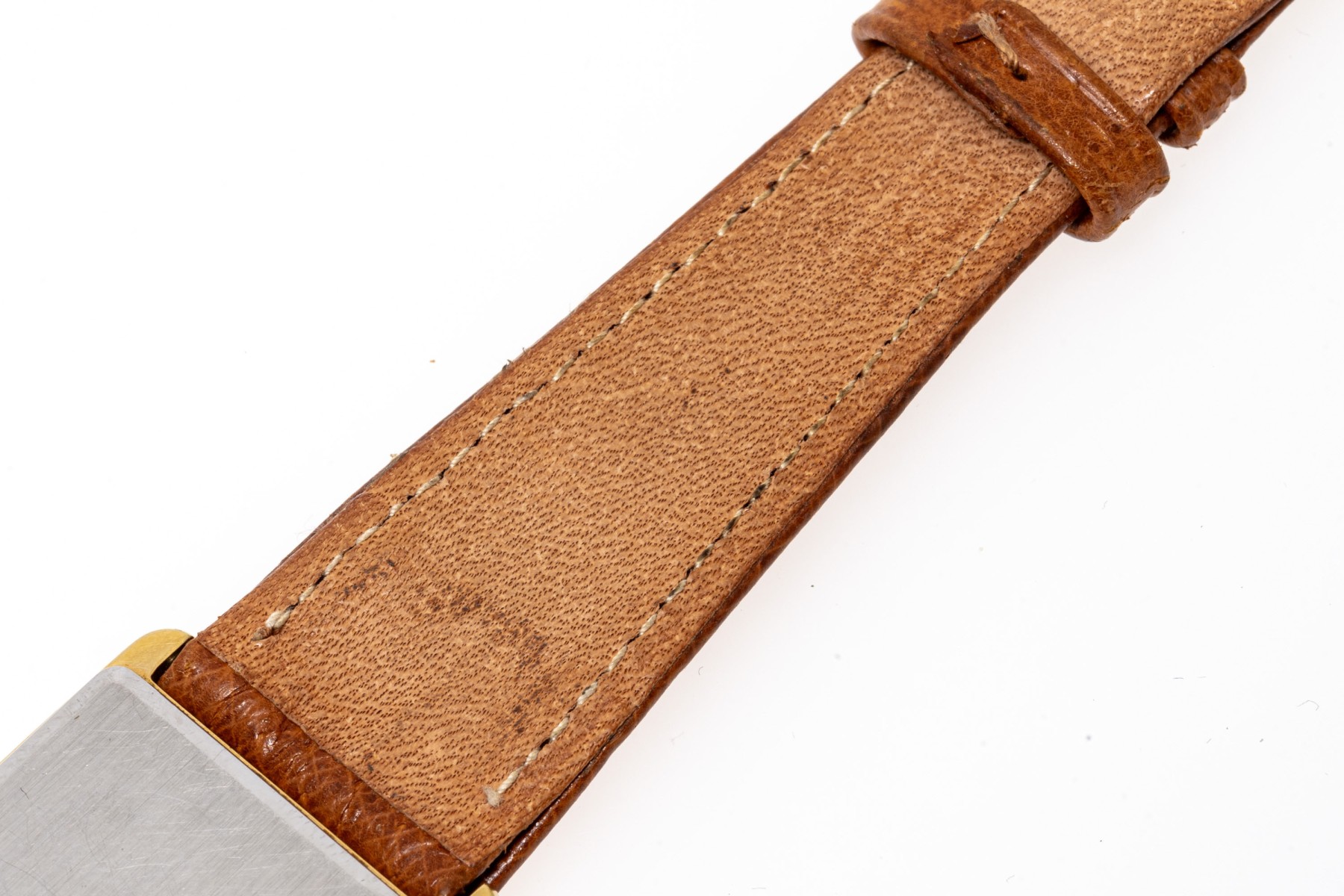 Handsome Seiko watch with a rectangular brushed dial with stick indices. Light brown leather pig skin strap with buckle clasp.