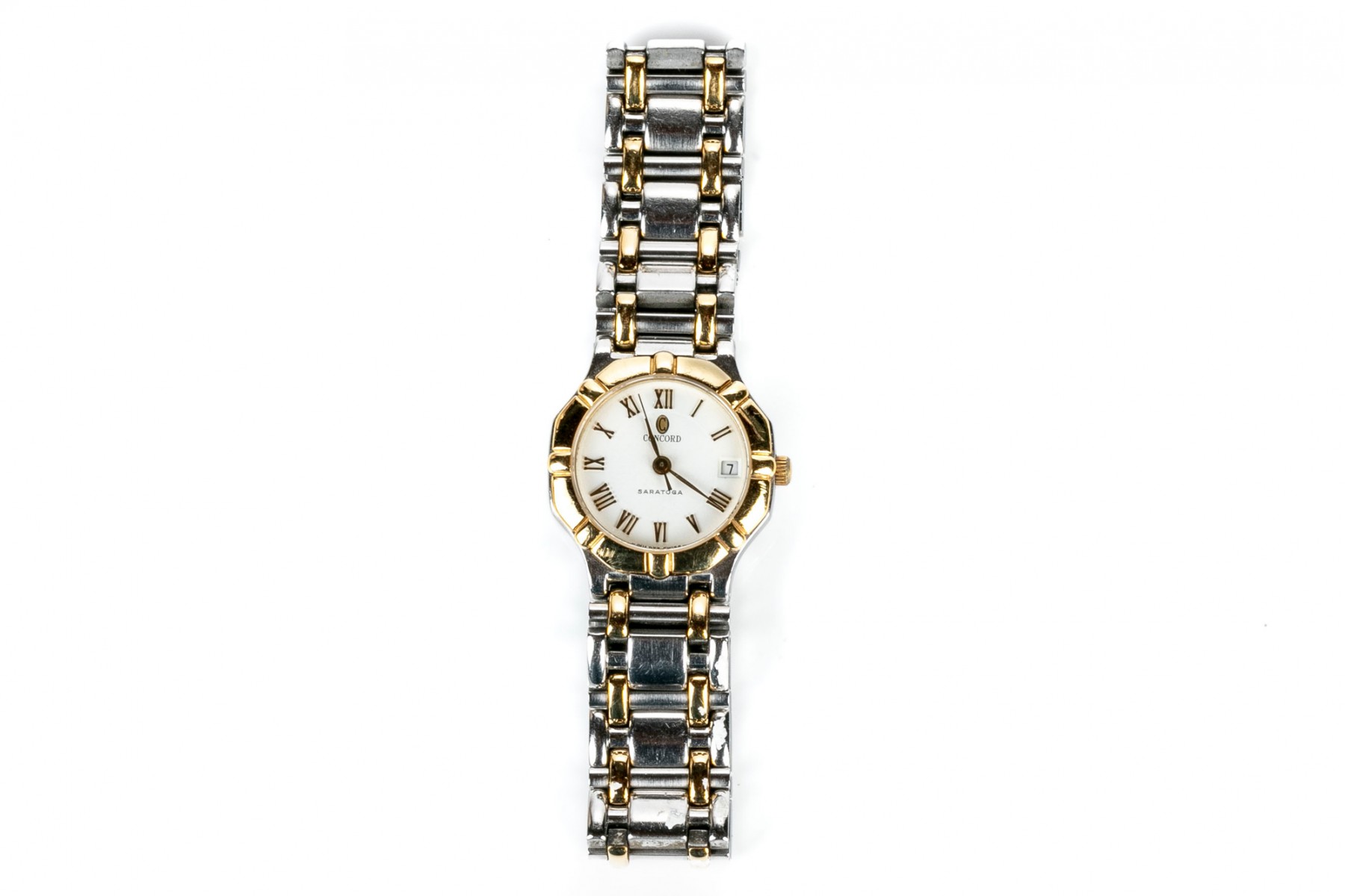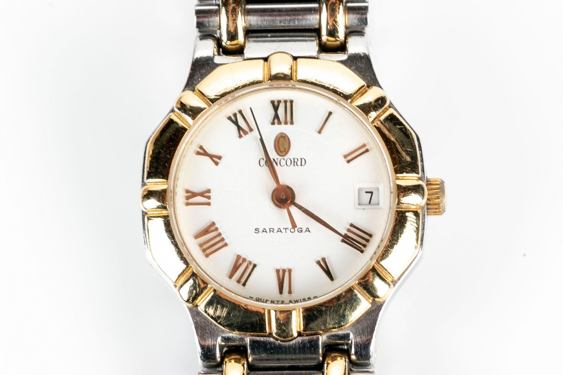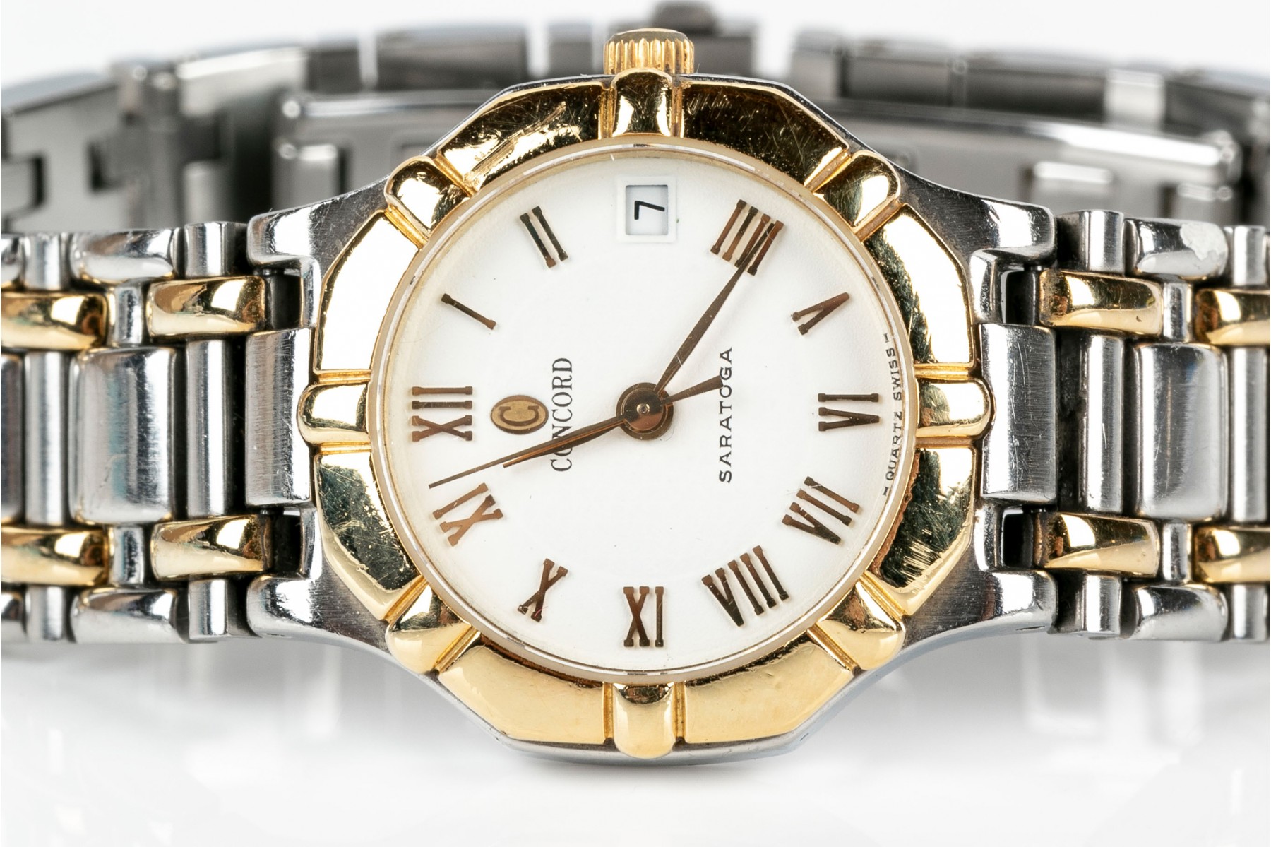 Concord Saratoga quartz watch. Stainless steel watch and band with round white dial. Roman numerals with centered hour, minute and second hands. Yellow metallic bezel. Butterfly folding latch clasp.