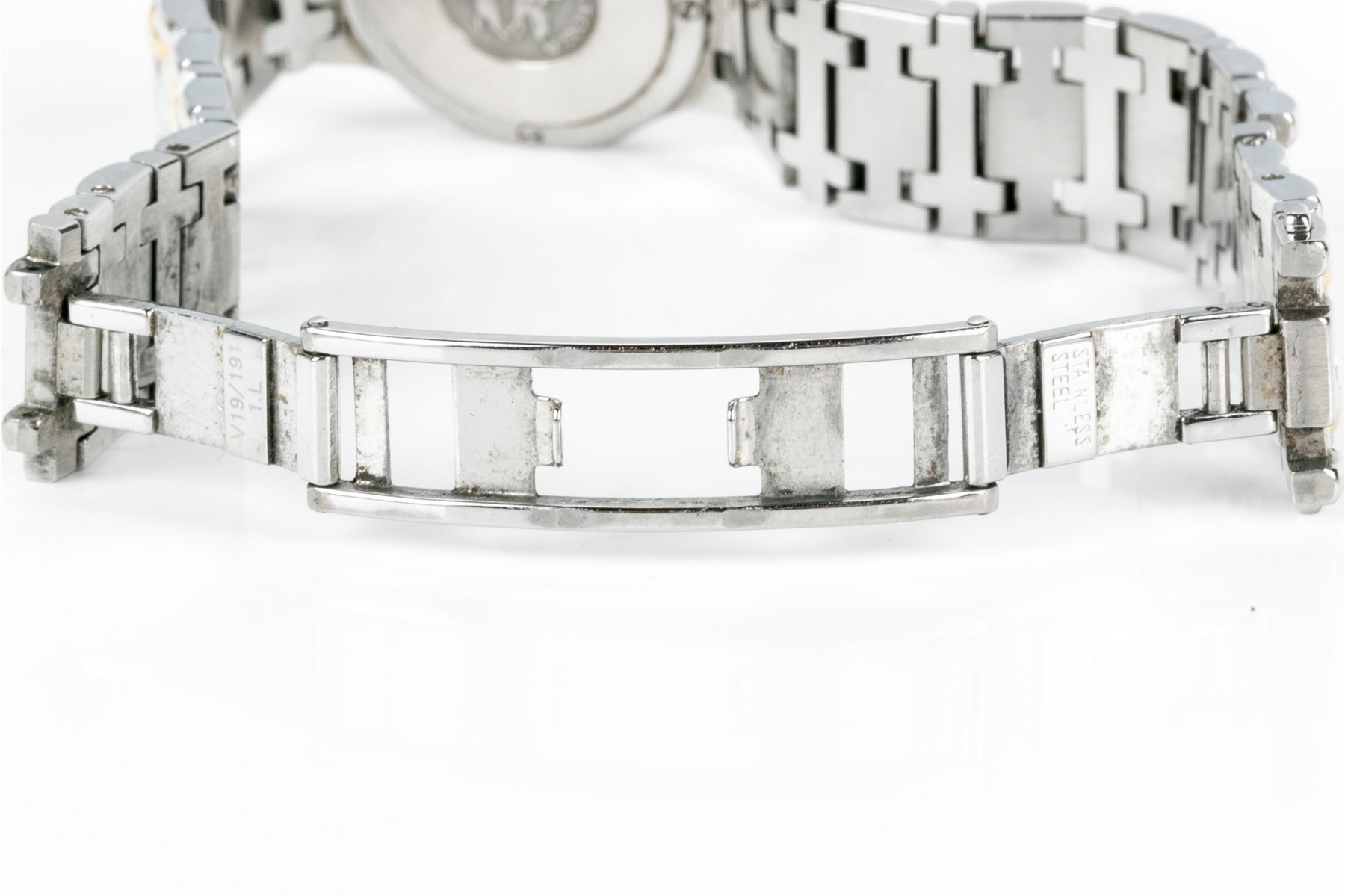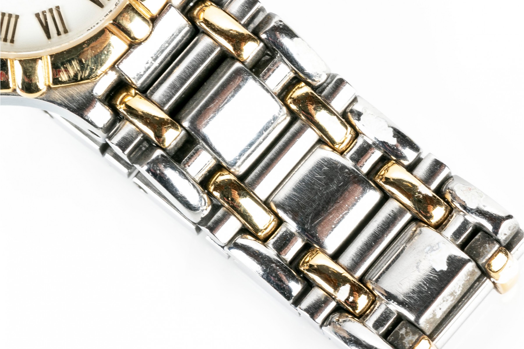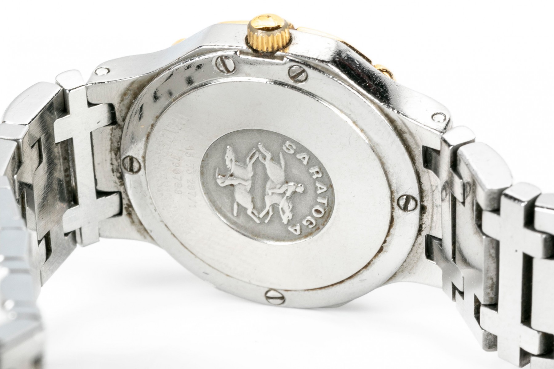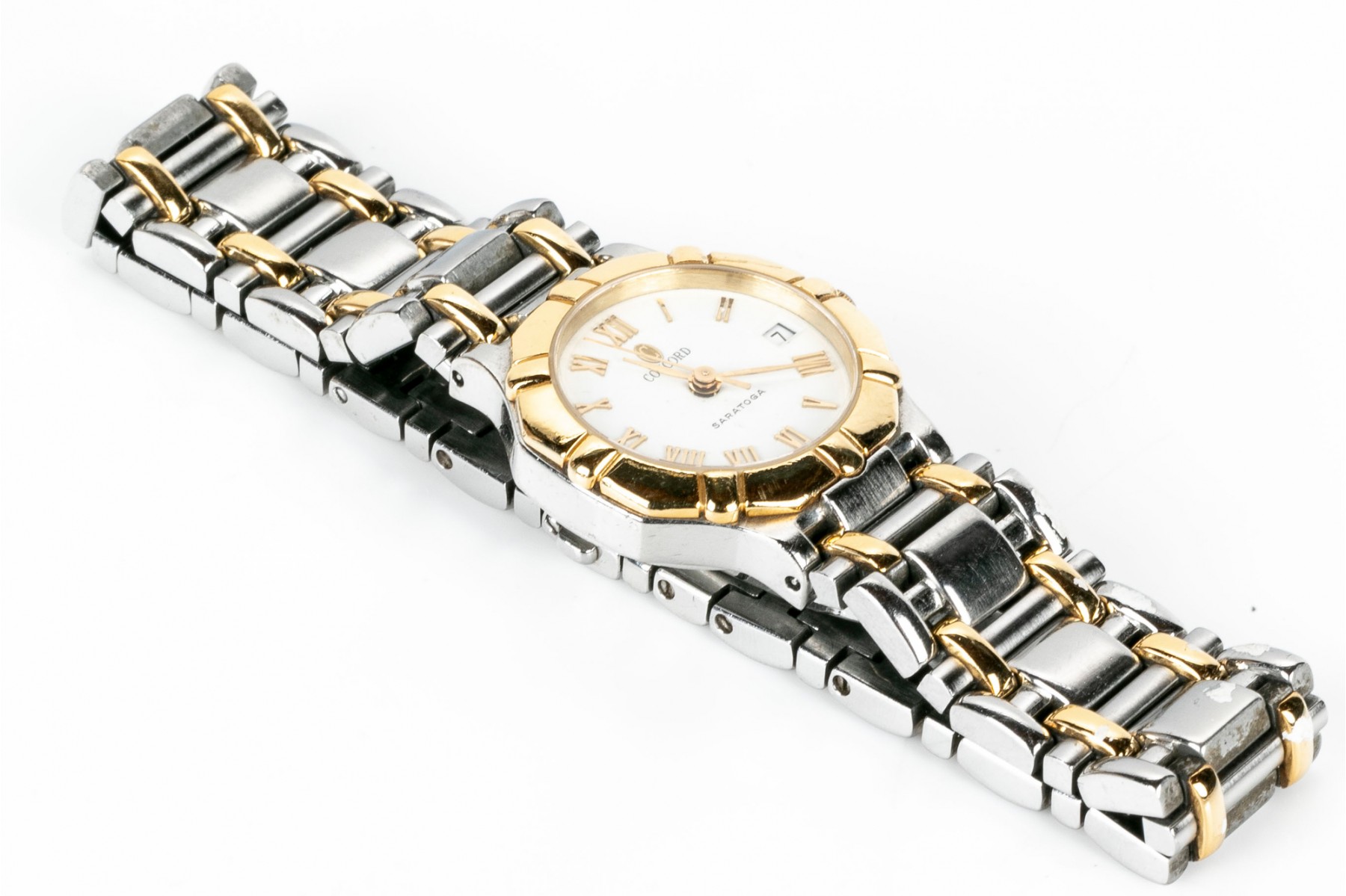 Concord Saratoga quartz watch. Stainless steel watch and band with round white dial. Roman numerals with centered hour, minute and second hands. Yellow metallic bezel. Butterfly folding latch clasp.