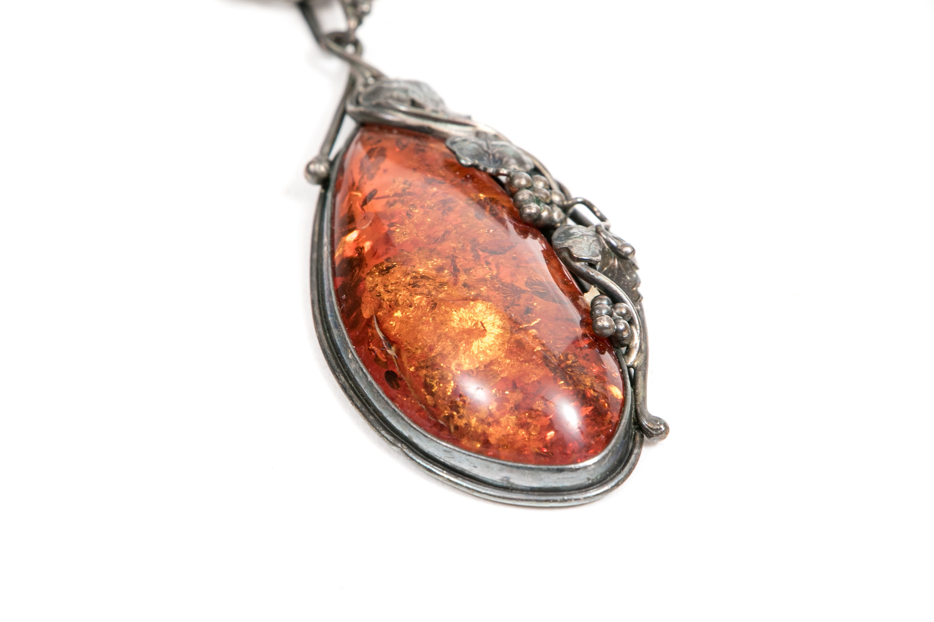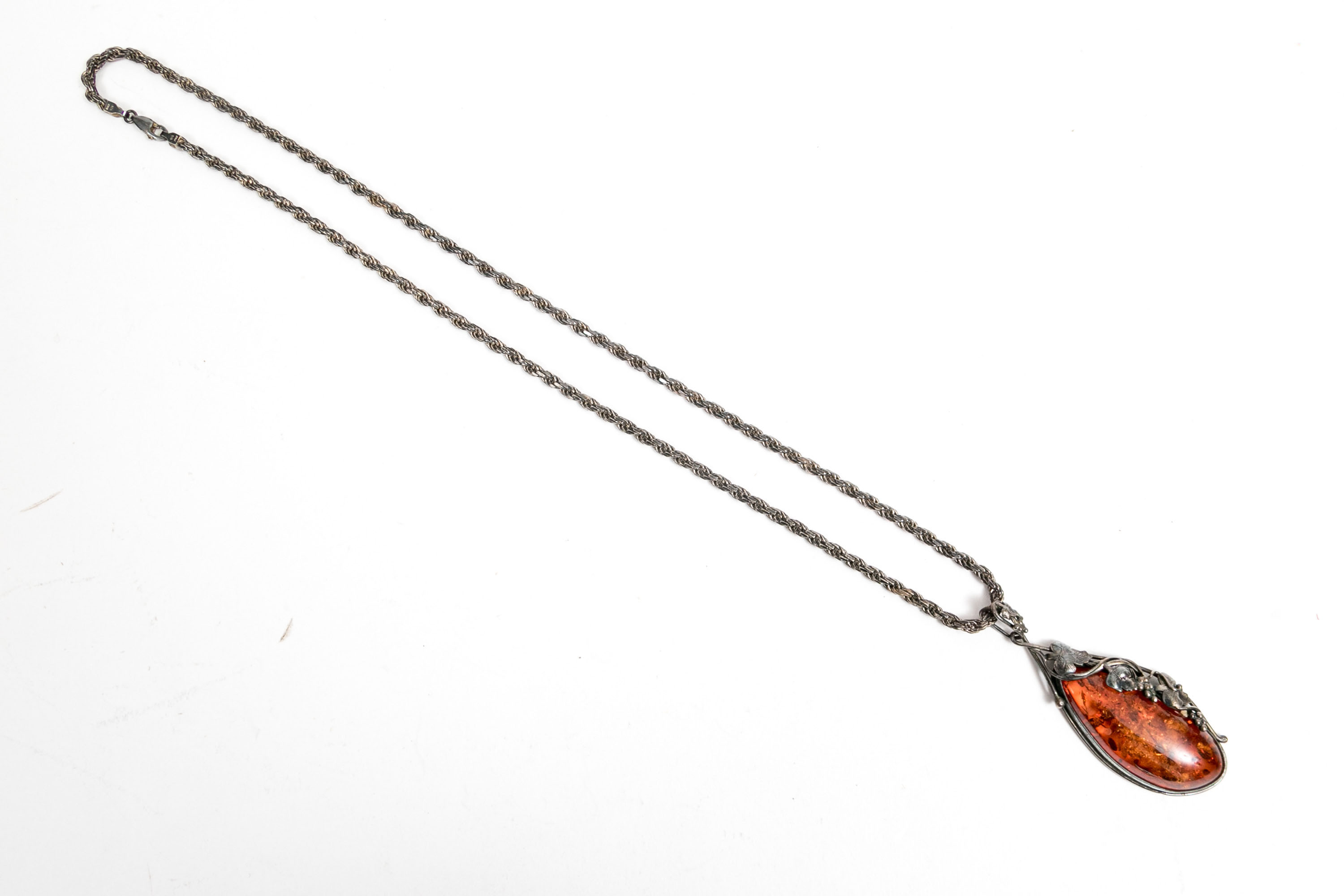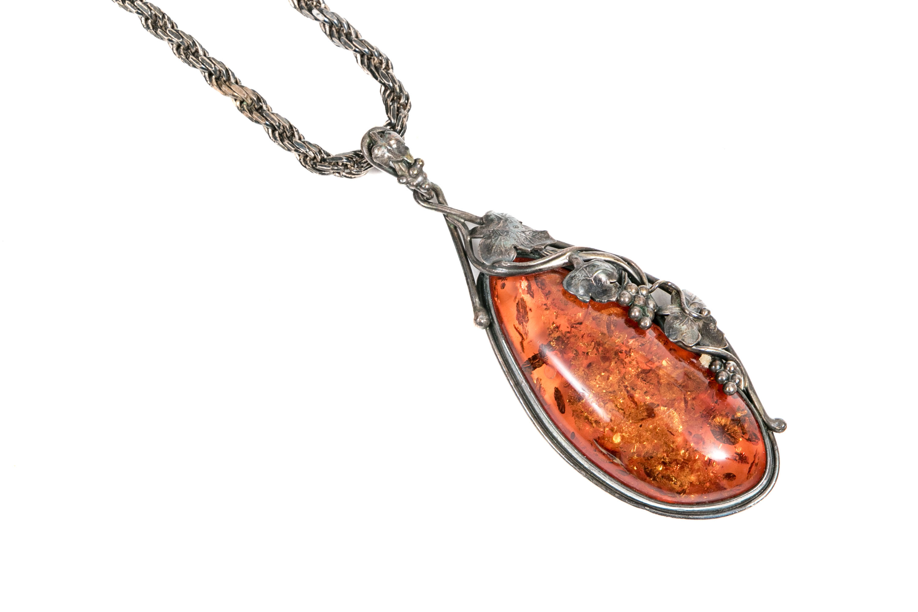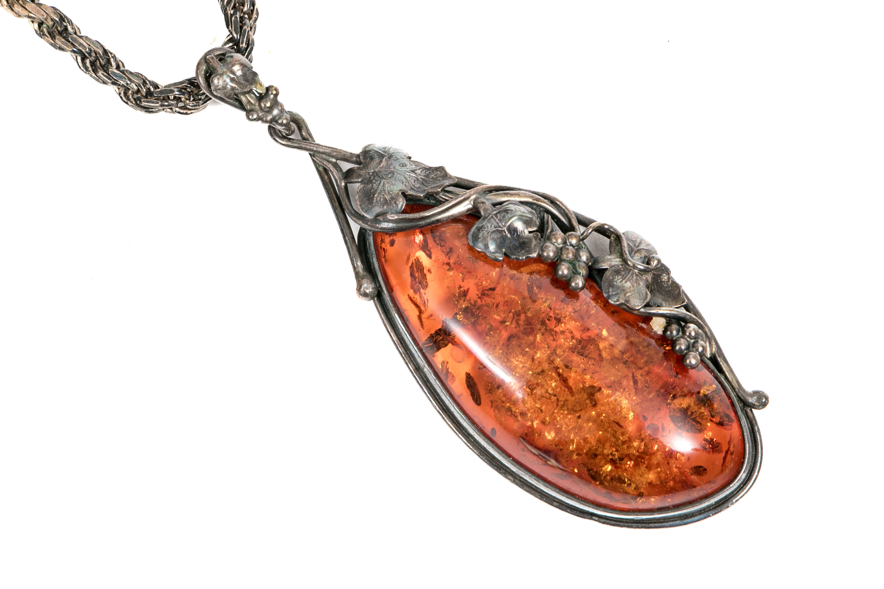 A sterling silver pendant necklace. The rustic twist style chain displays a faux amber pendant. Accenting the amber is a grape cluster and leaf motif extending up to the bale. Chain secures with a lobster claw clasp.