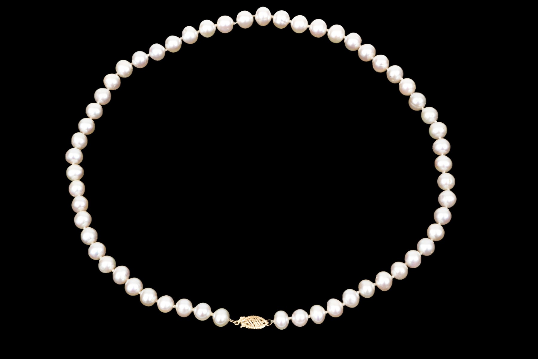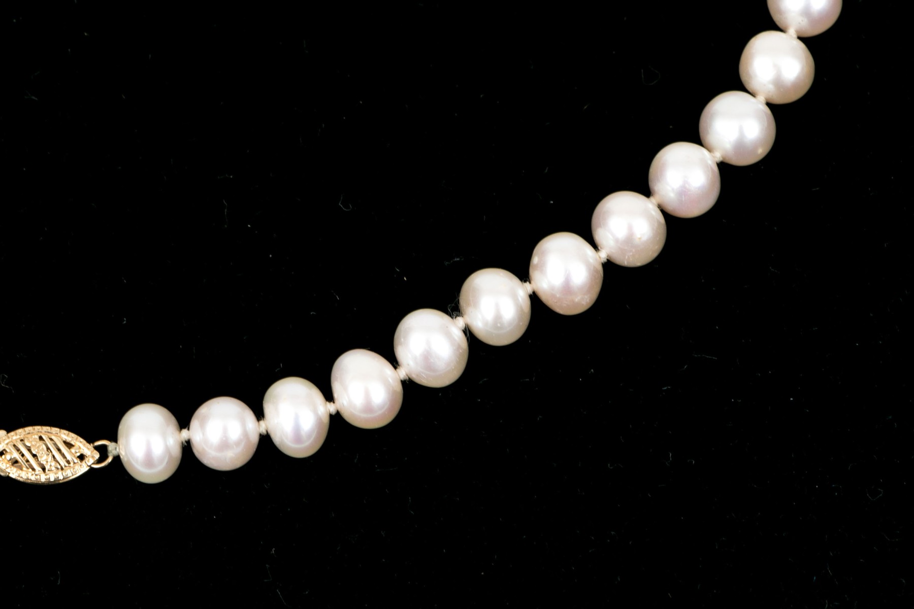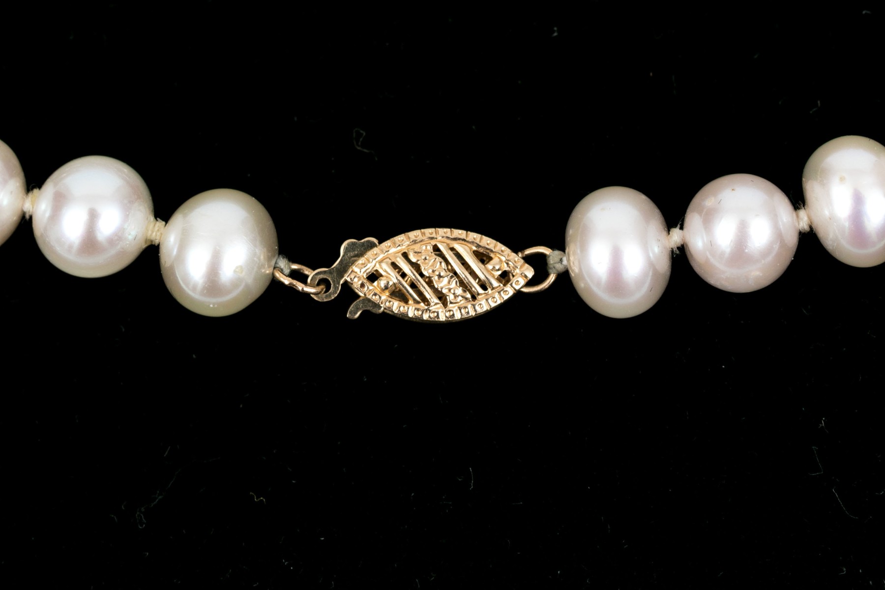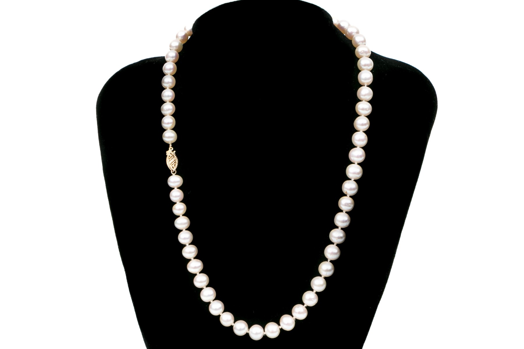 Handsome strand of cultured 7mm to 7.75mm freshwater pearls, 14k clasp