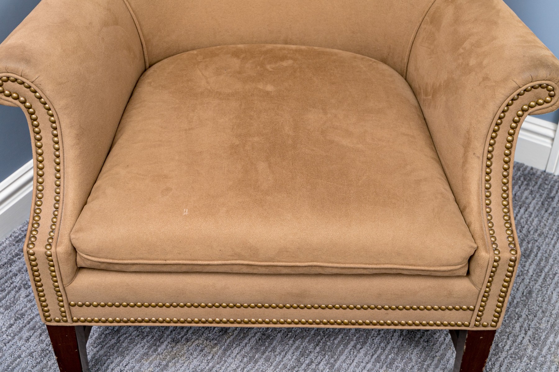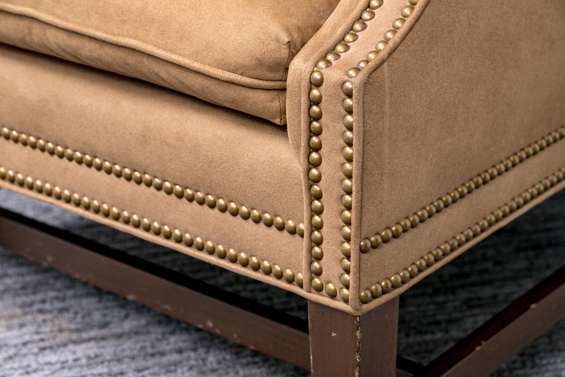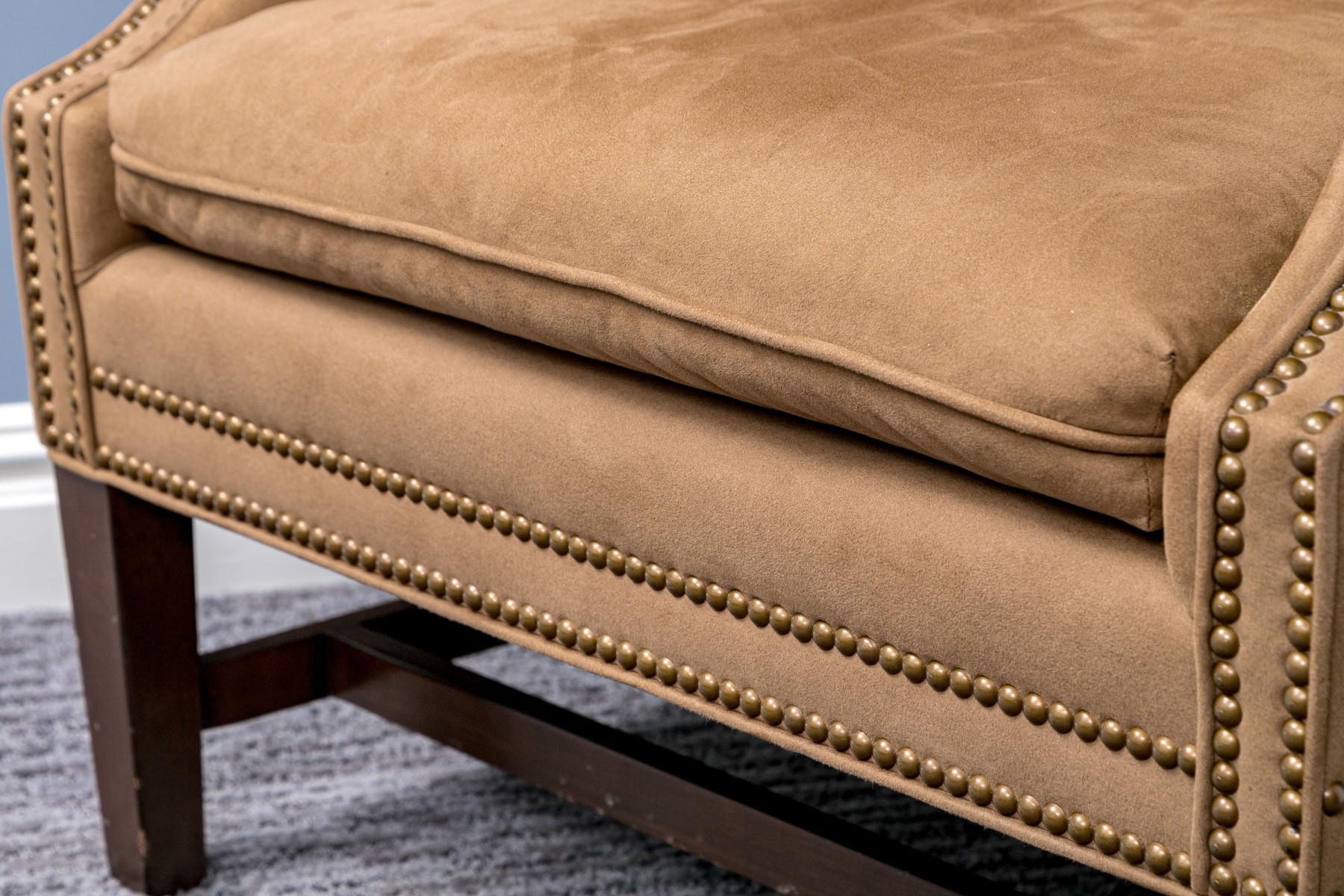 A handsome wingback chair, likely Wesley Hall "Heathcliff." Upholstered in light caramel brown suede for a luxurious feel. Features a wide button tufted back and scrolled arms with brass nailhead trims extending down the arm fronts and the apron. Raised on dark brown finished tapered legs surrounding a box stretcher.