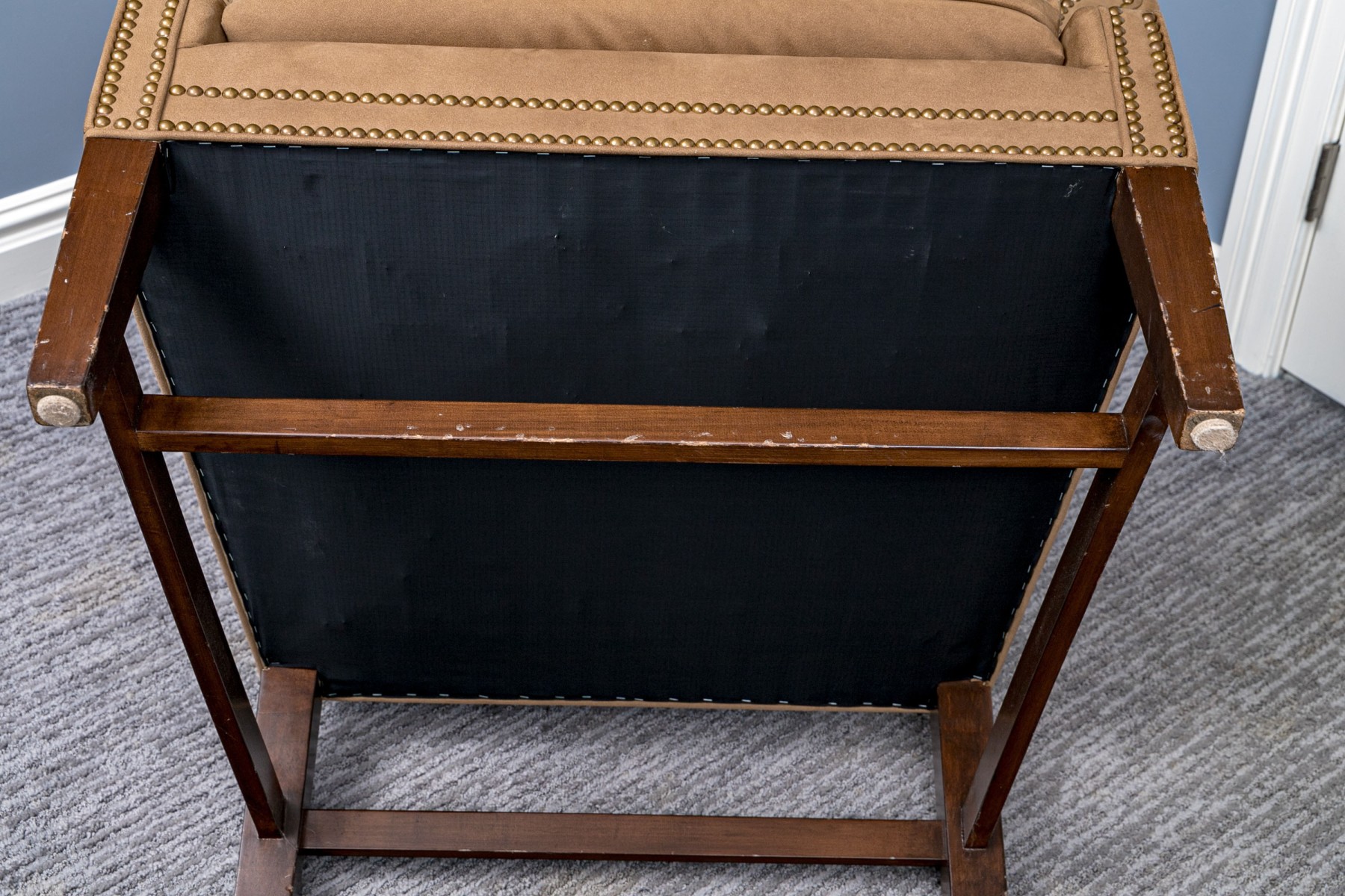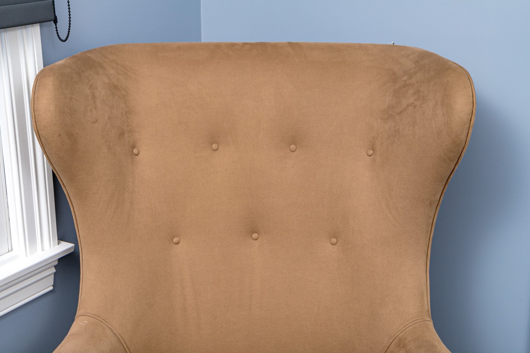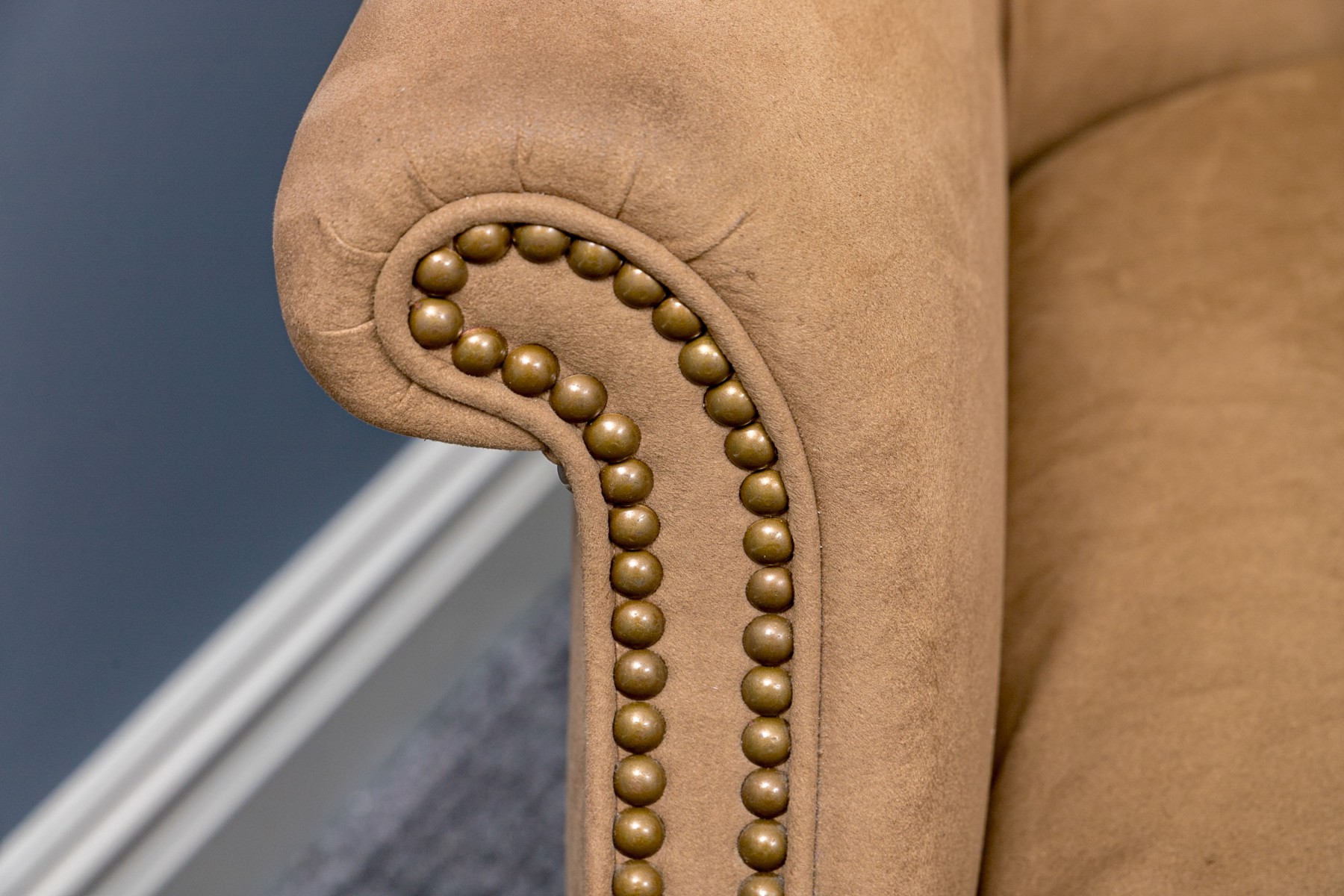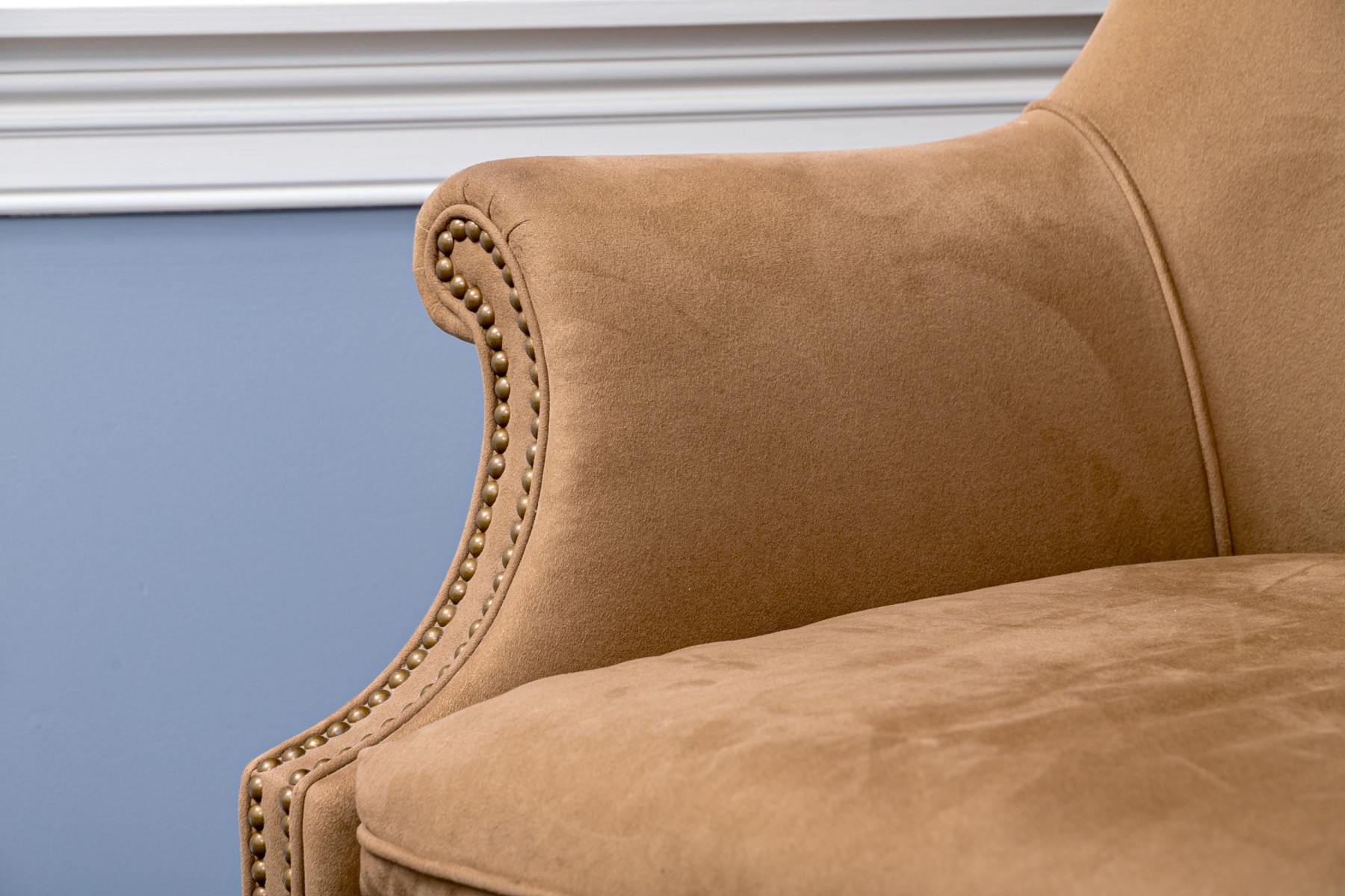 A handsome wingback chair, likely Wesley Hall "Heathcliff." Upholstered in light caramel brown suede for a luxurious feel. Features a wide button tufted back and scrolled arms with brass nailhead trims extending down the arm fronts and the apron. Raised on dark brown finished tapered legs surrounding a box stretcher.