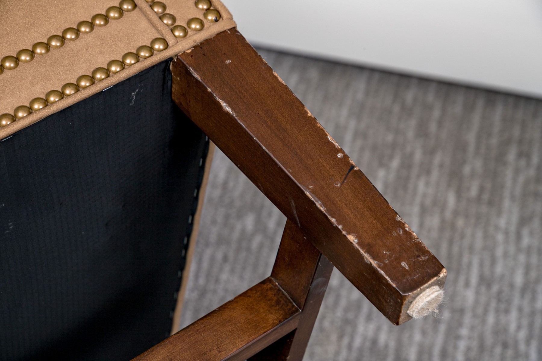 Handome, with some minor discoloration to the upholstery. Scuffs, nicks, and finish wear to the legs and stretcher. Please review the pictures as they are a part of the condition report.