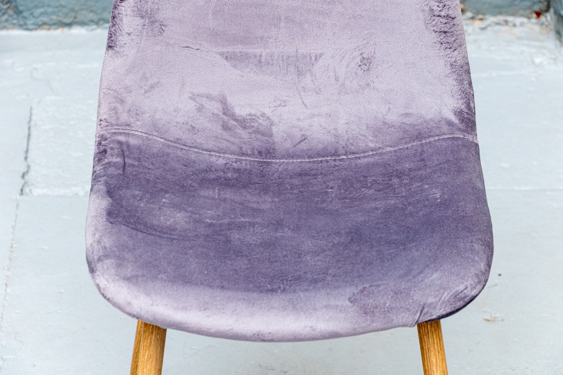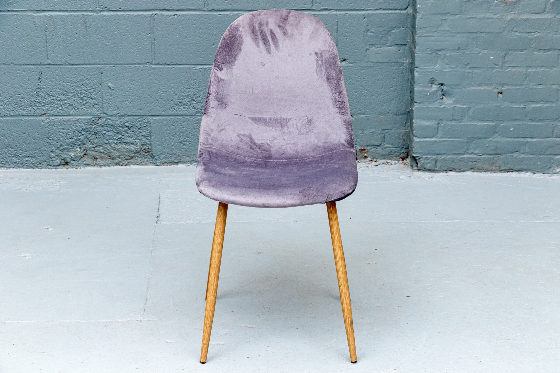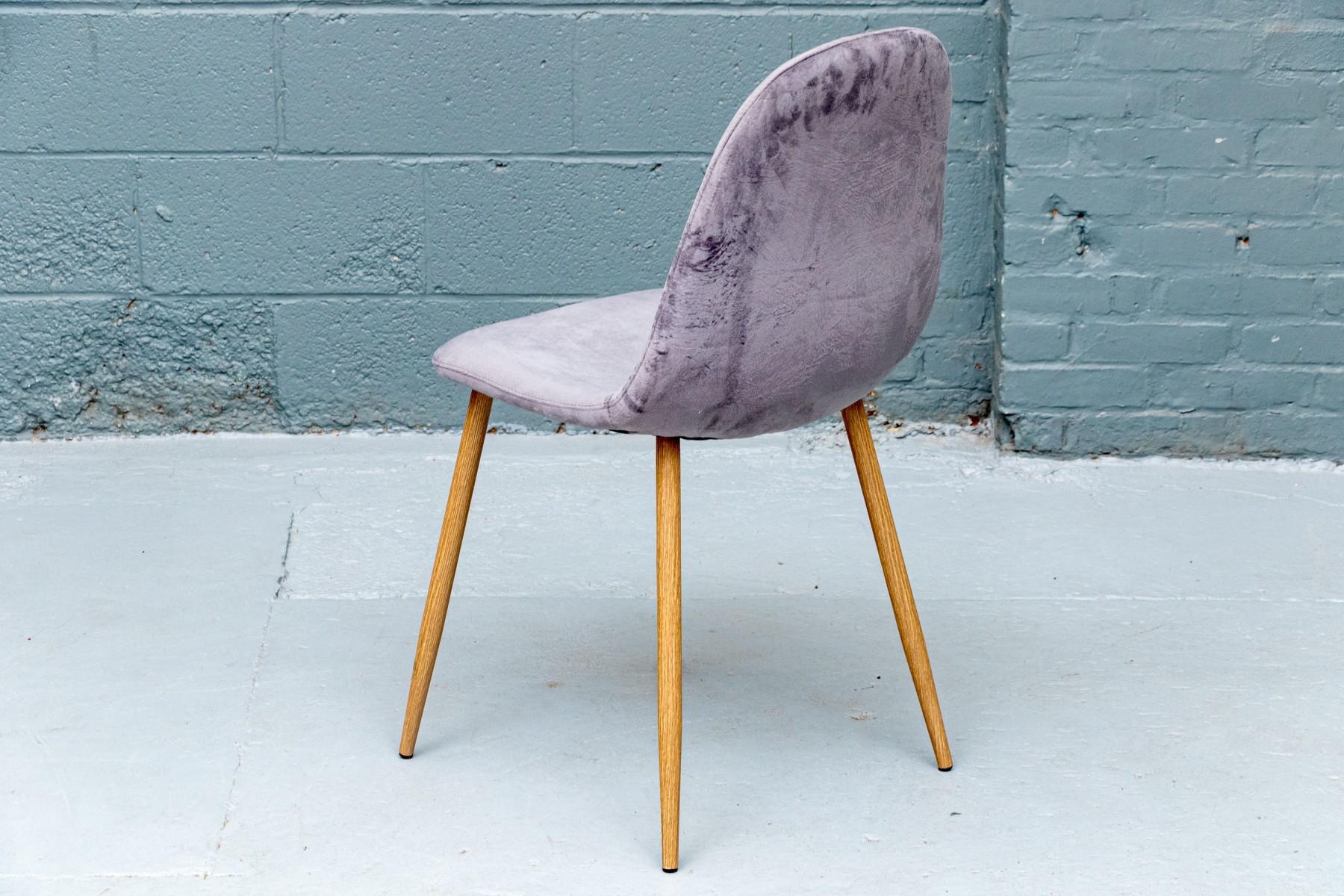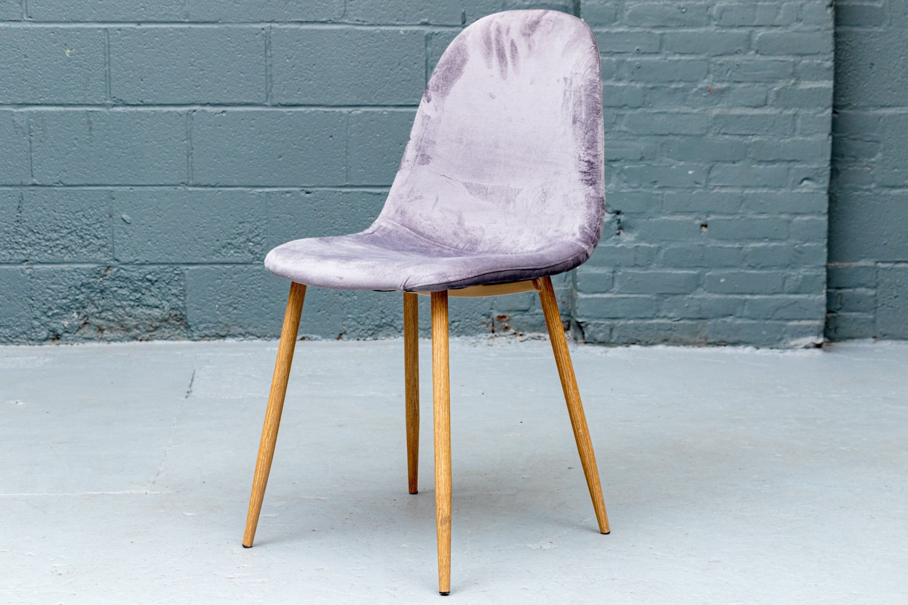 On four splayed legs with single piece seat and seat back with grey upholstery.
