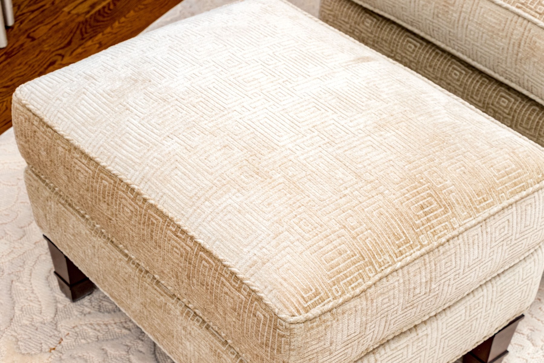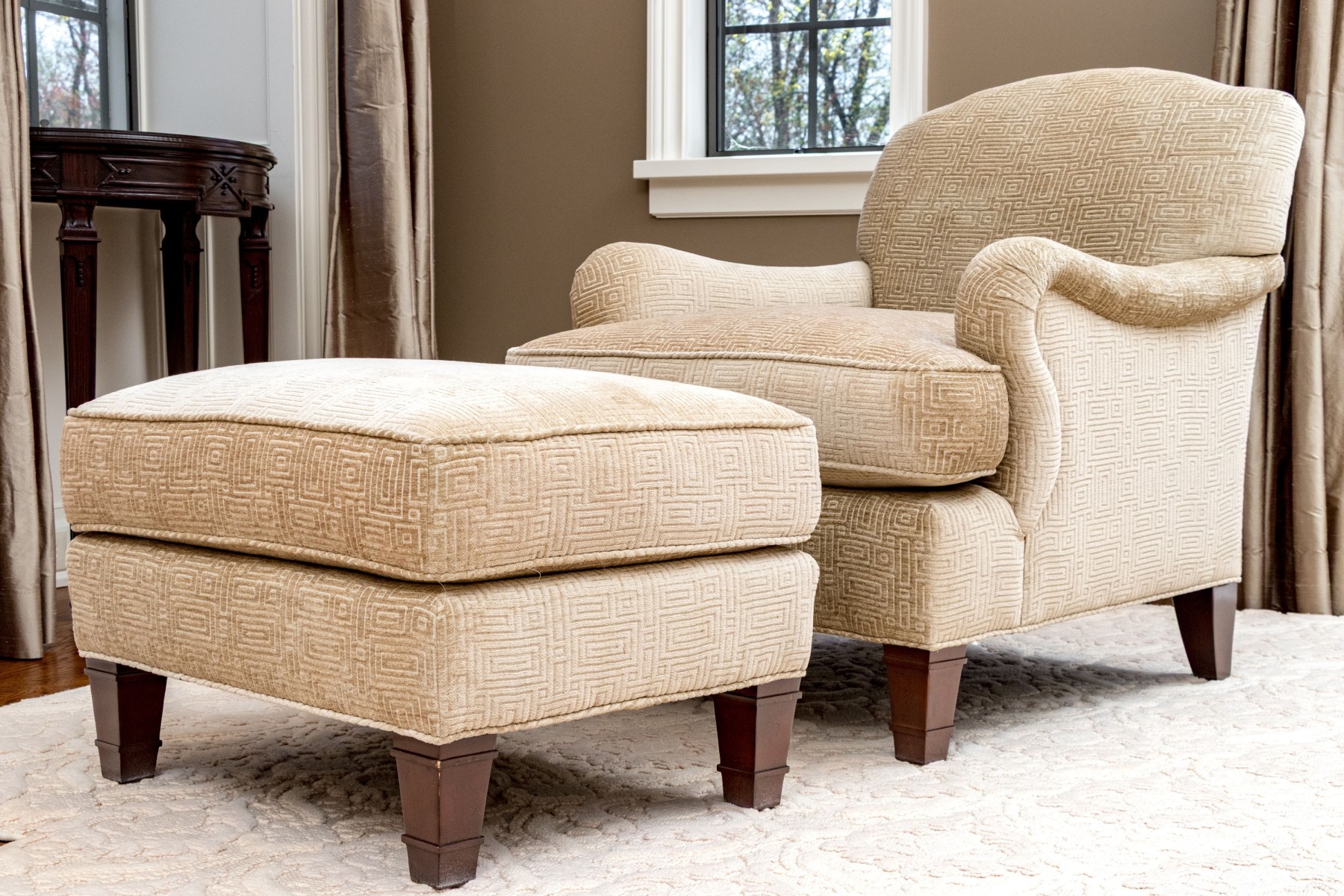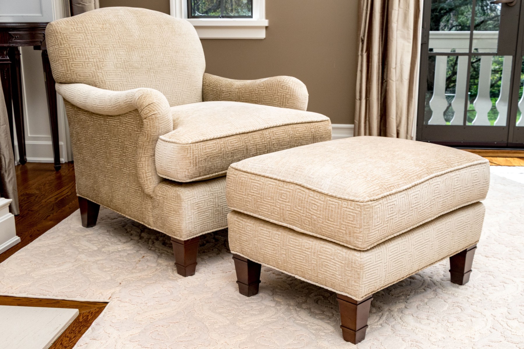 A gorgeous club chair and ottoman with fine transitional English style, upholstered in warm beige-cream fabric with fine geometric patterns. The chair features a camel back and rolled, sloping arms flanking a deep-set seat with a loose seat cushion, raised over straight tapered warm brown wood legs with banded accents. The ottoman follows suit with an affixed cushion top and straight apron, finished with piped trims.