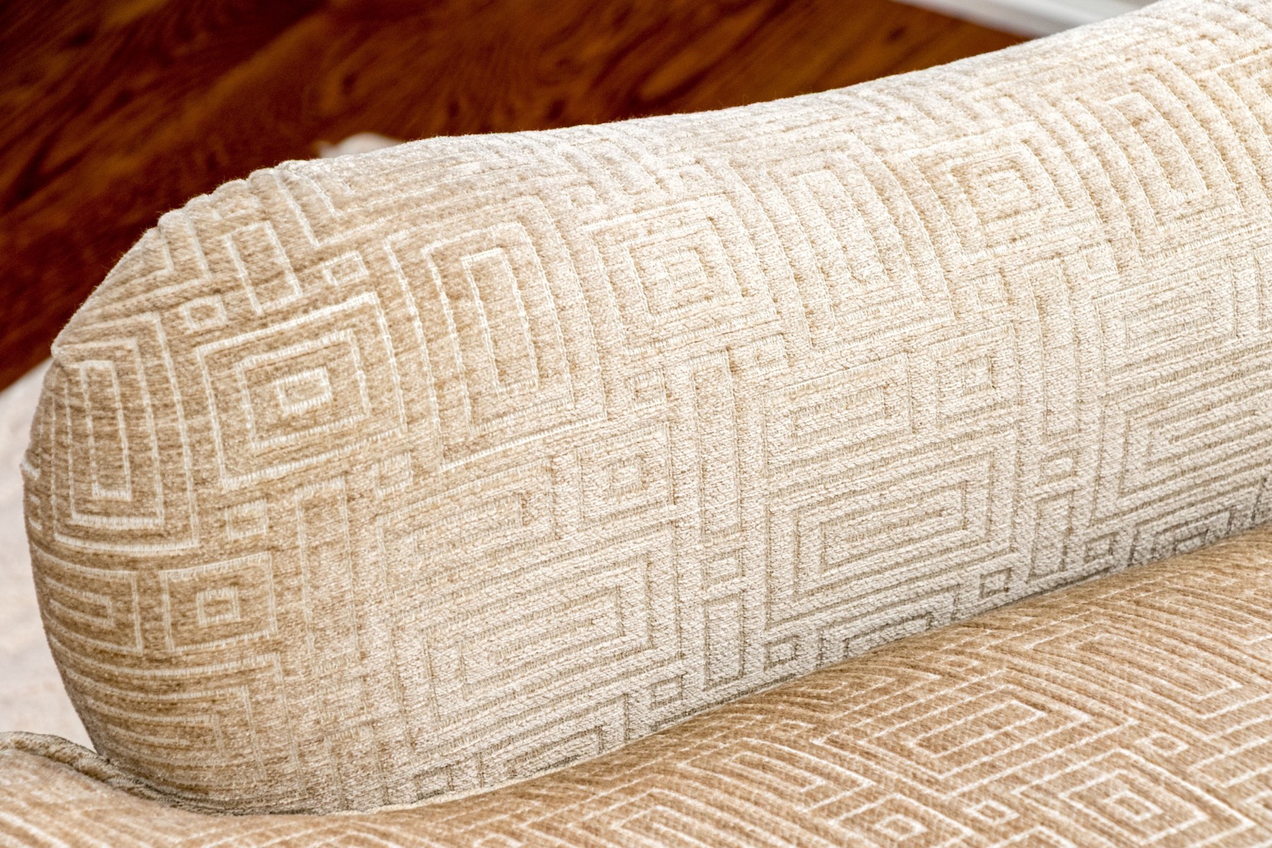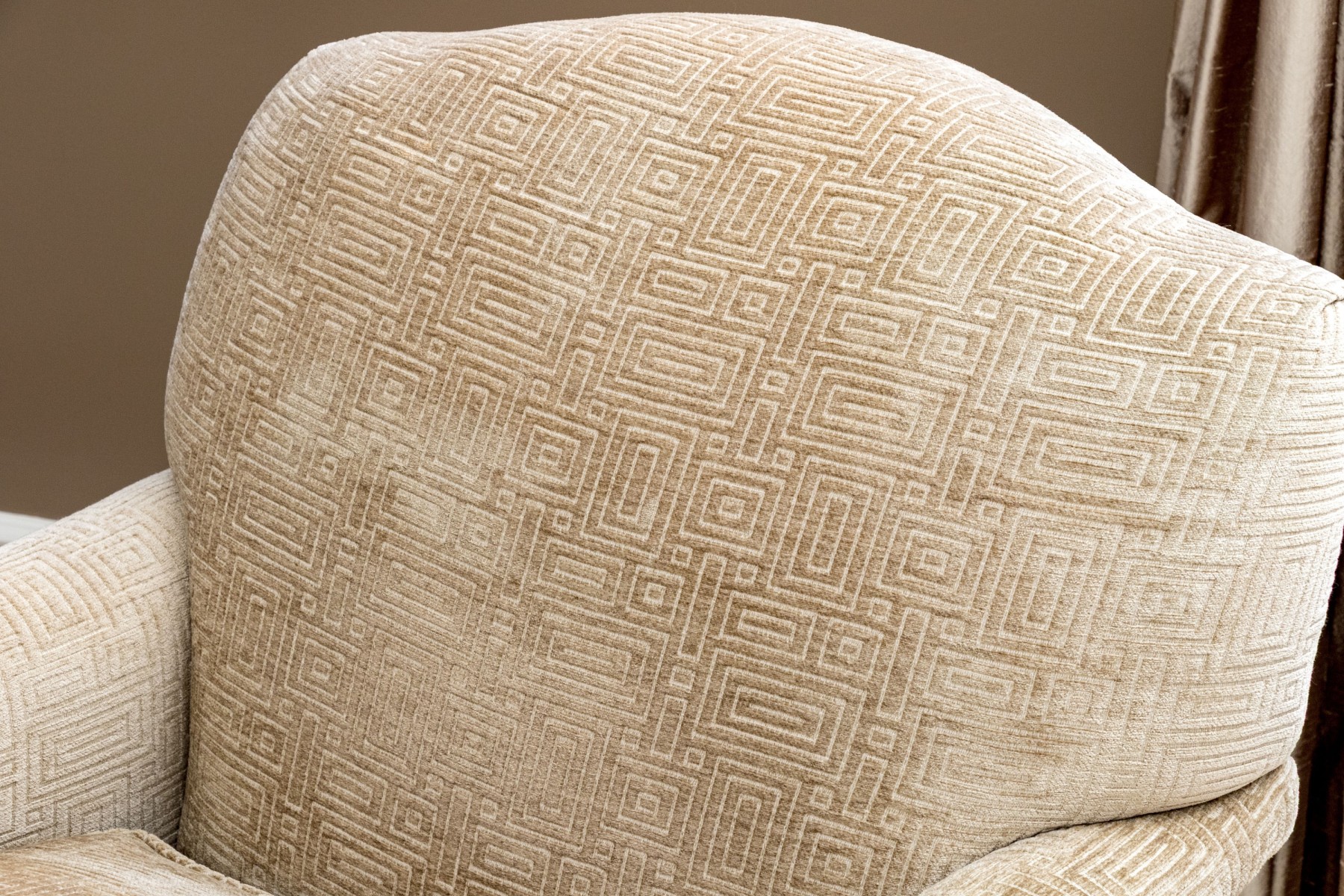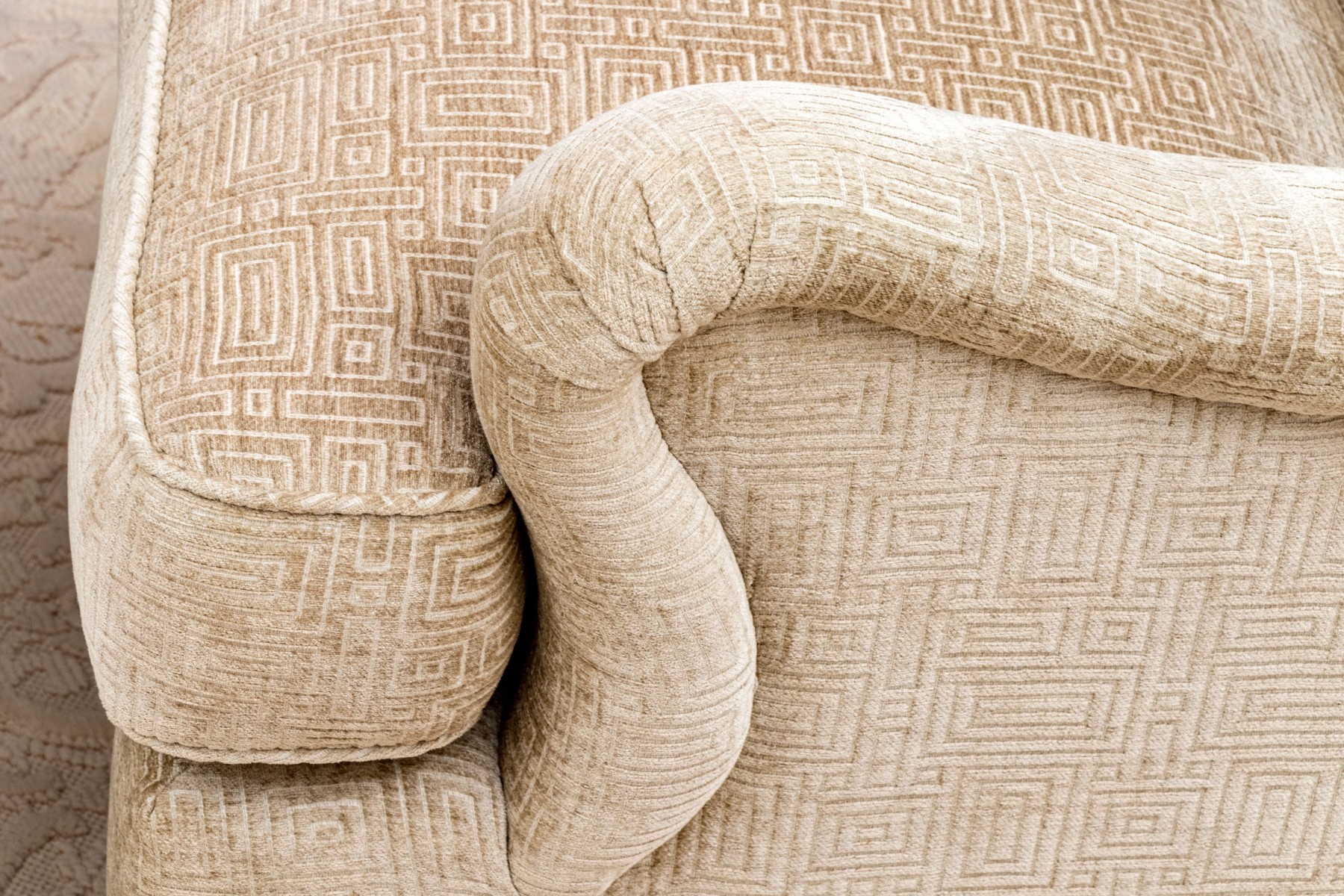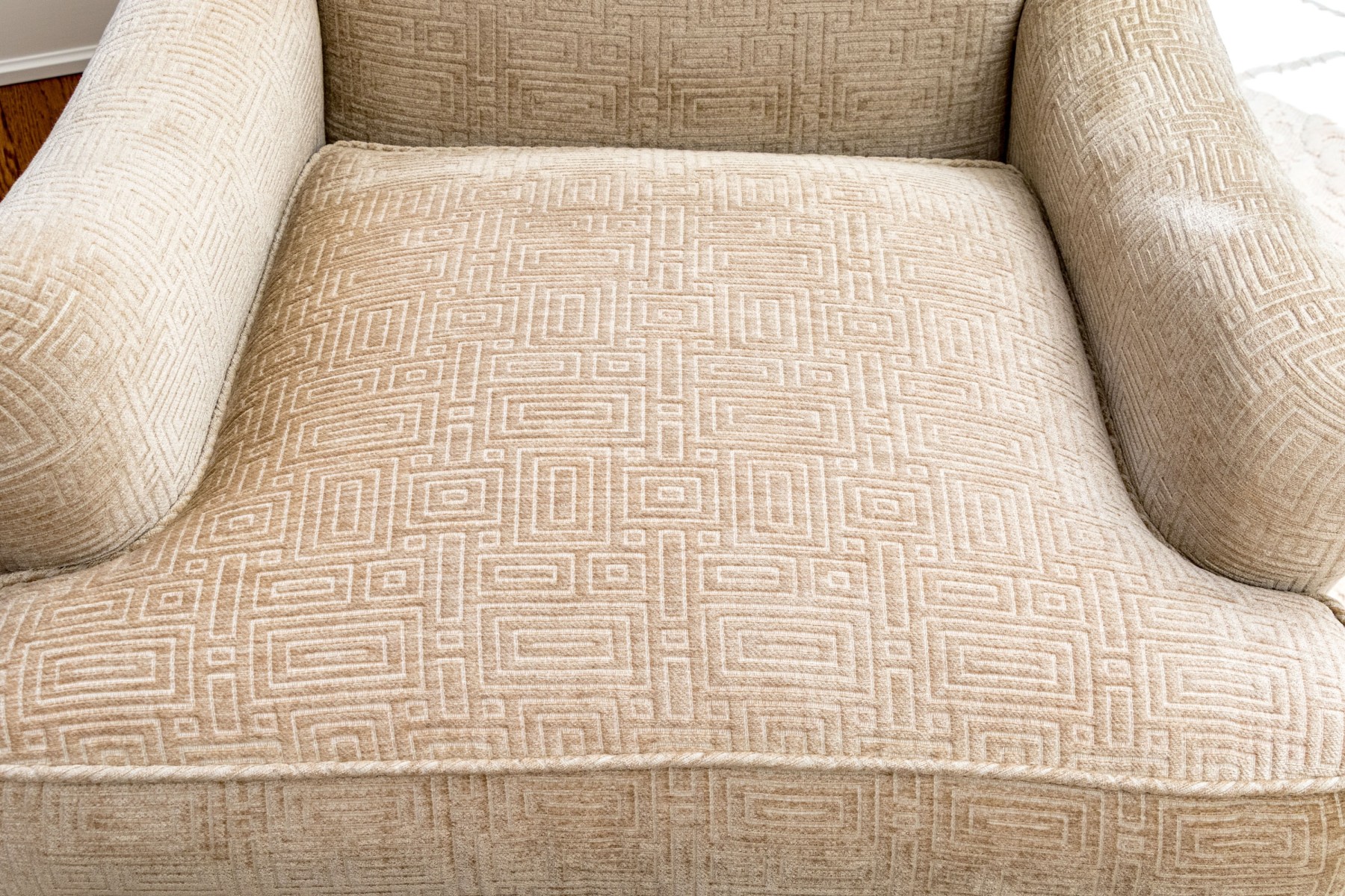 A gorgeous club chair and ottoman with fine transitional English style, upholstered in warm beige-cream fabric with fine geometric patterns. The chair features a camel back and rolled, sloping arms flanking a deep-set seat with a loose seat cushion, raised over straight tapered warm brown wood legs with banded accents. The ottoman follows suit with an affixed cushion top and straight apron, finished with piped trims.