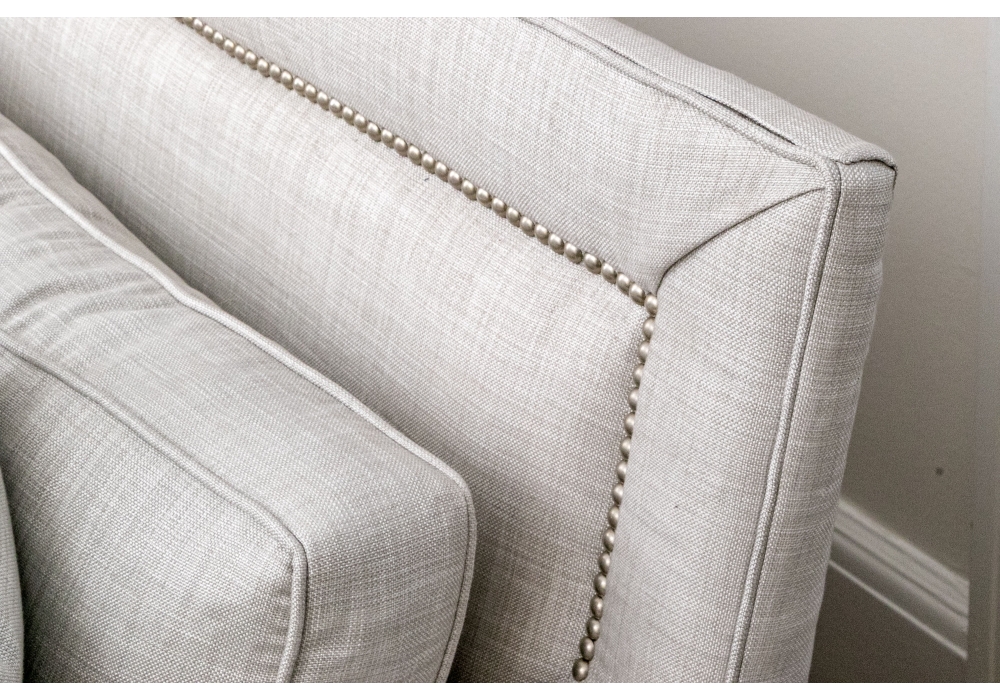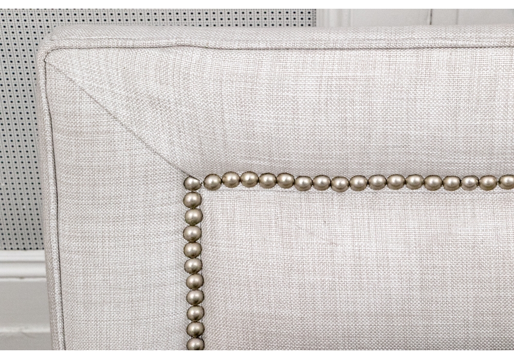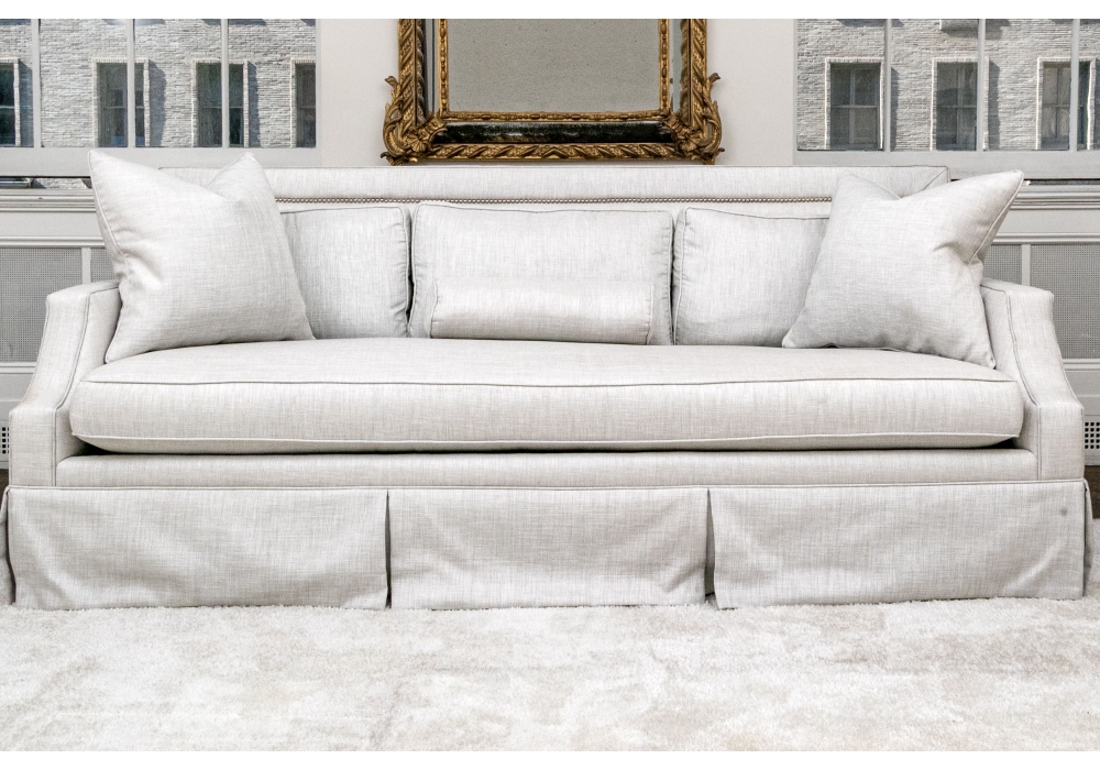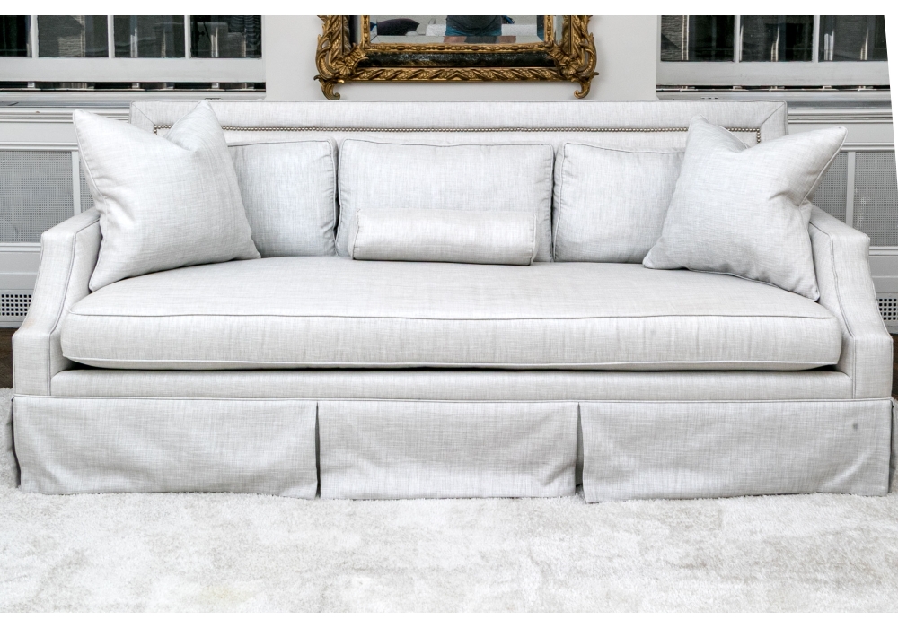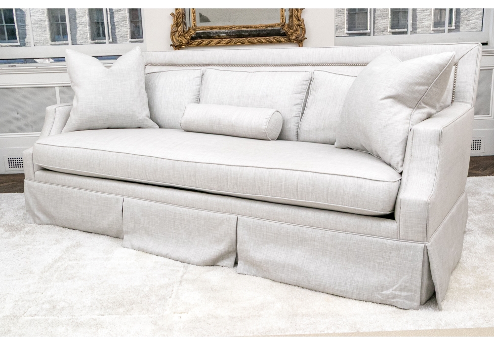 A handsome sofa raised on four legs concealed with skirt with pleats. The sofa itself has a wonderfully long, single upholstered partial down filled seat cushion with a piped trim for a clean finish. Together with upholstered seat back with brass tack nailhead trim and three loose upholstered seat cushions with piped trims, two accent pillows and a single bolster pillow.