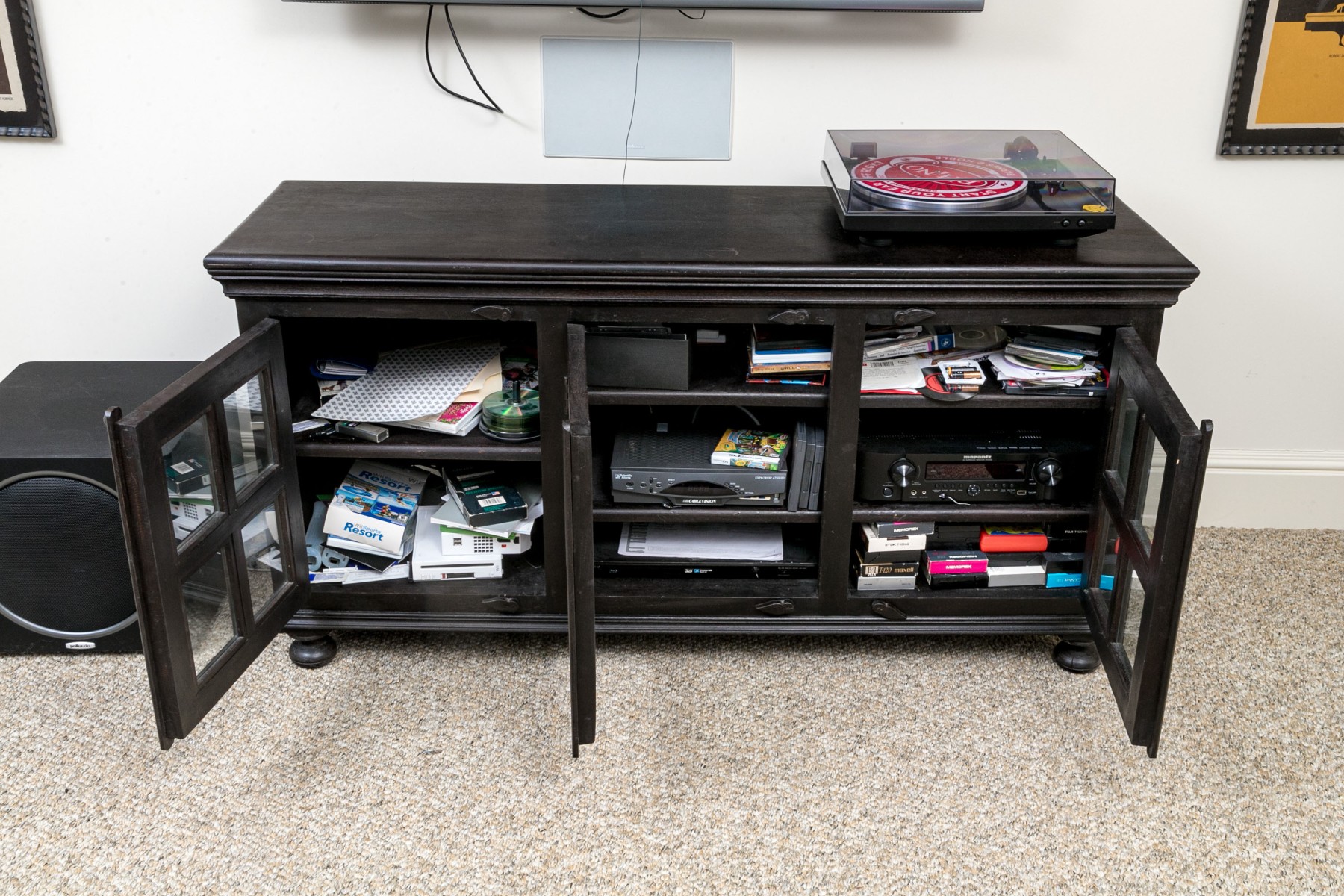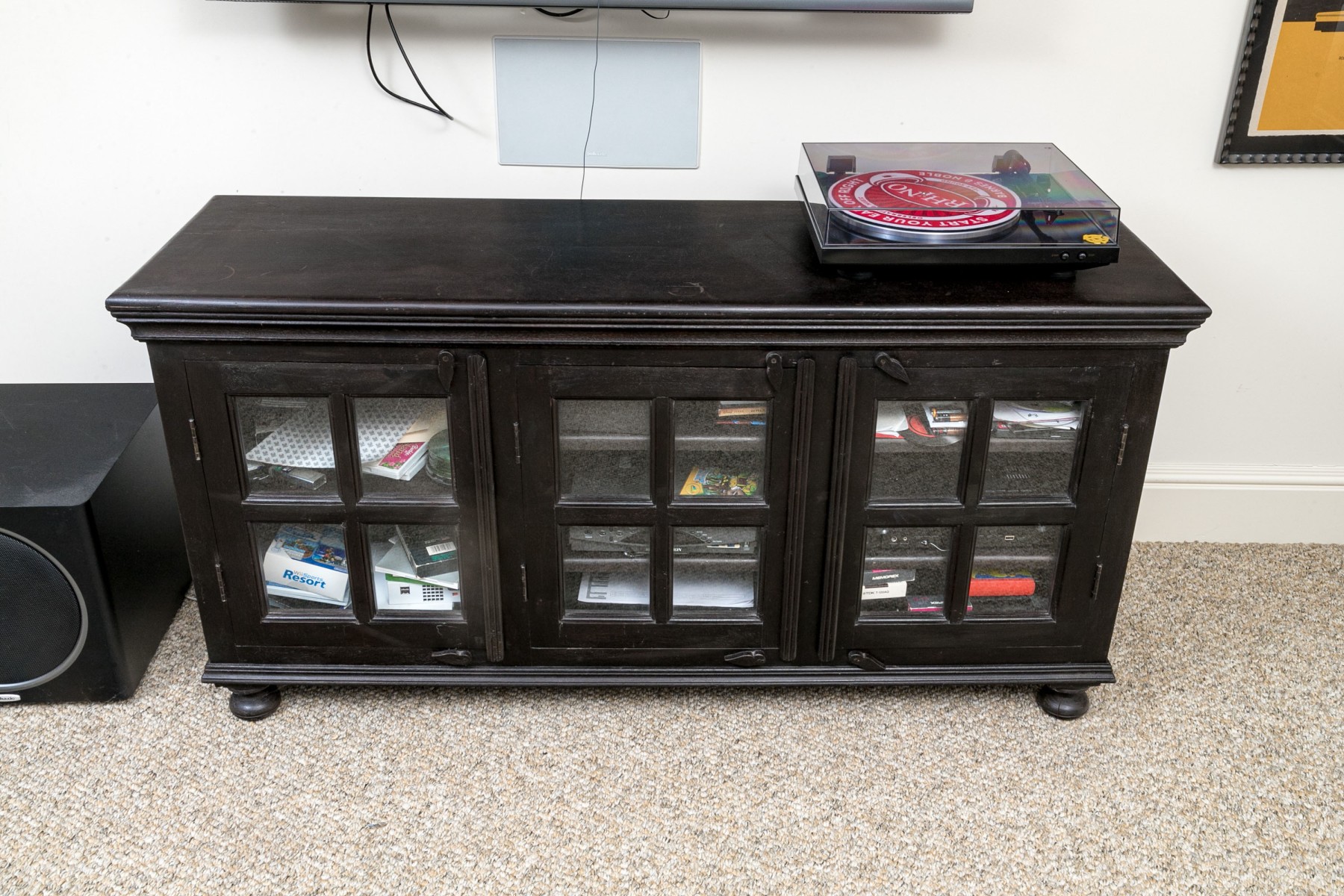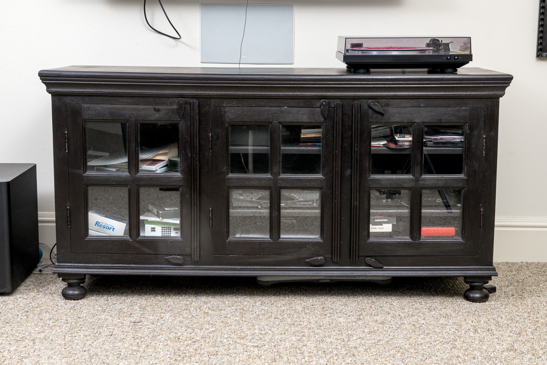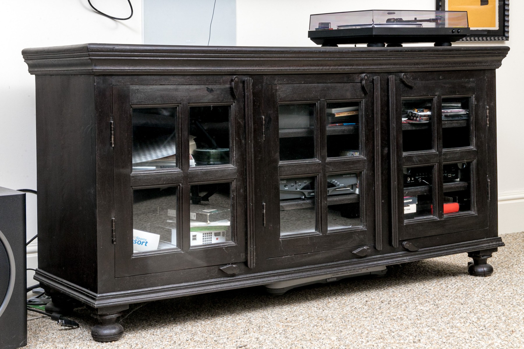 A handsome media cabinet designed with great transitional style, well crafted and painted in a black finish. The cabinet is raised on four feet with three doors, each fitted with four glass window panes to each door.