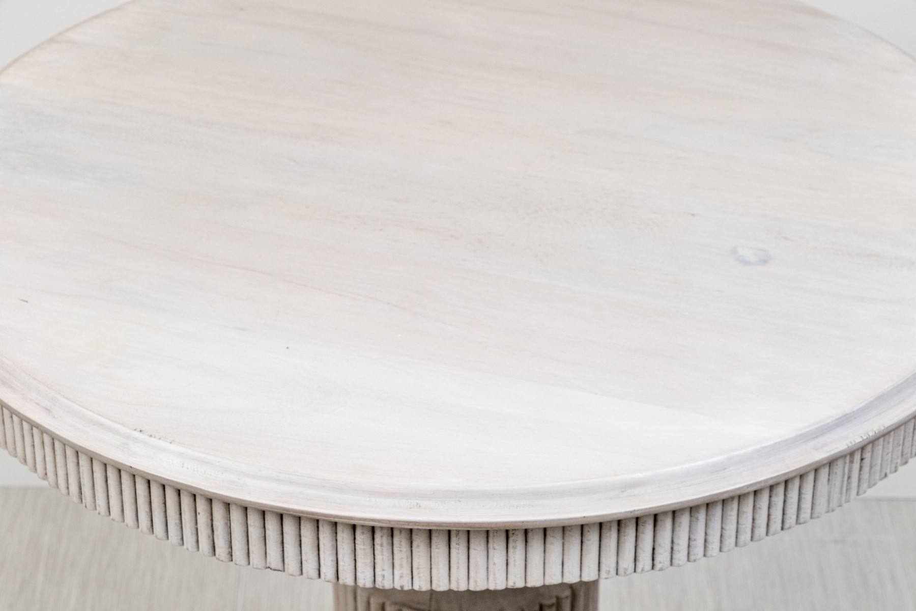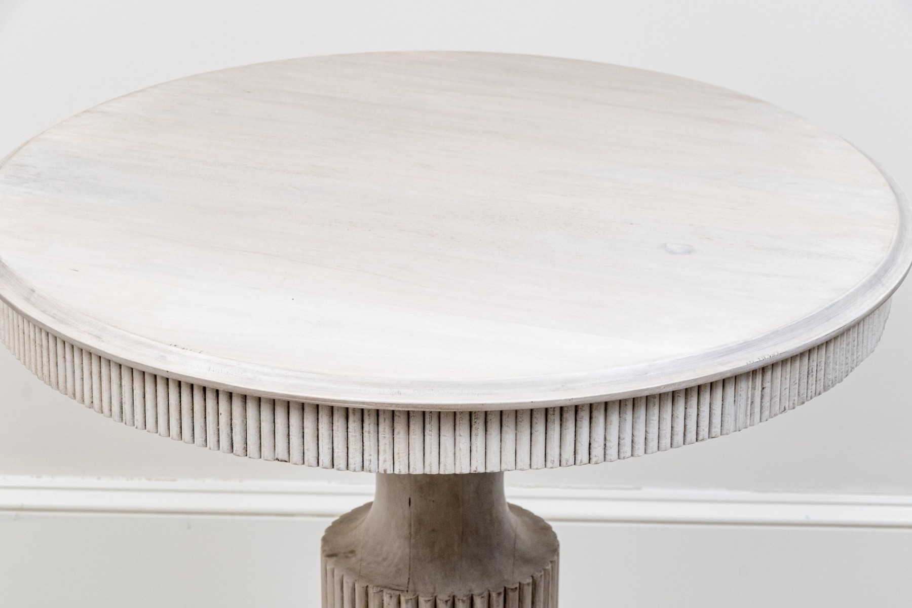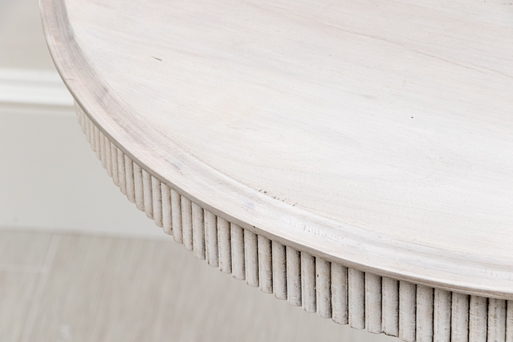 Standing on four carved feet, the pedestal table has an urn form pedestal with carved reeded outer decoration and is surmounted with the tables circular top with matching carved reeded apron. The whole pedestal table in a wonderful rustic, antiqued white finish.