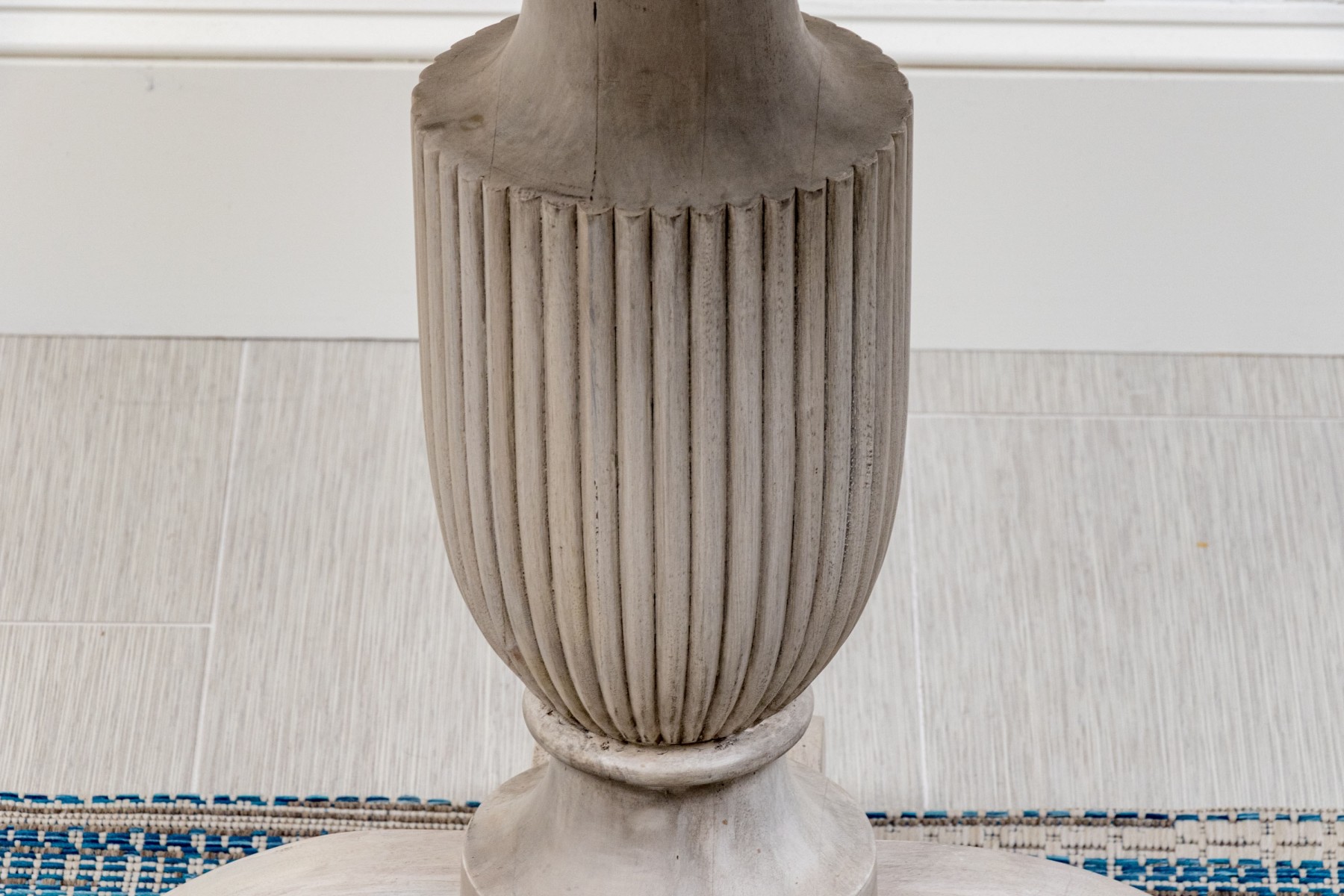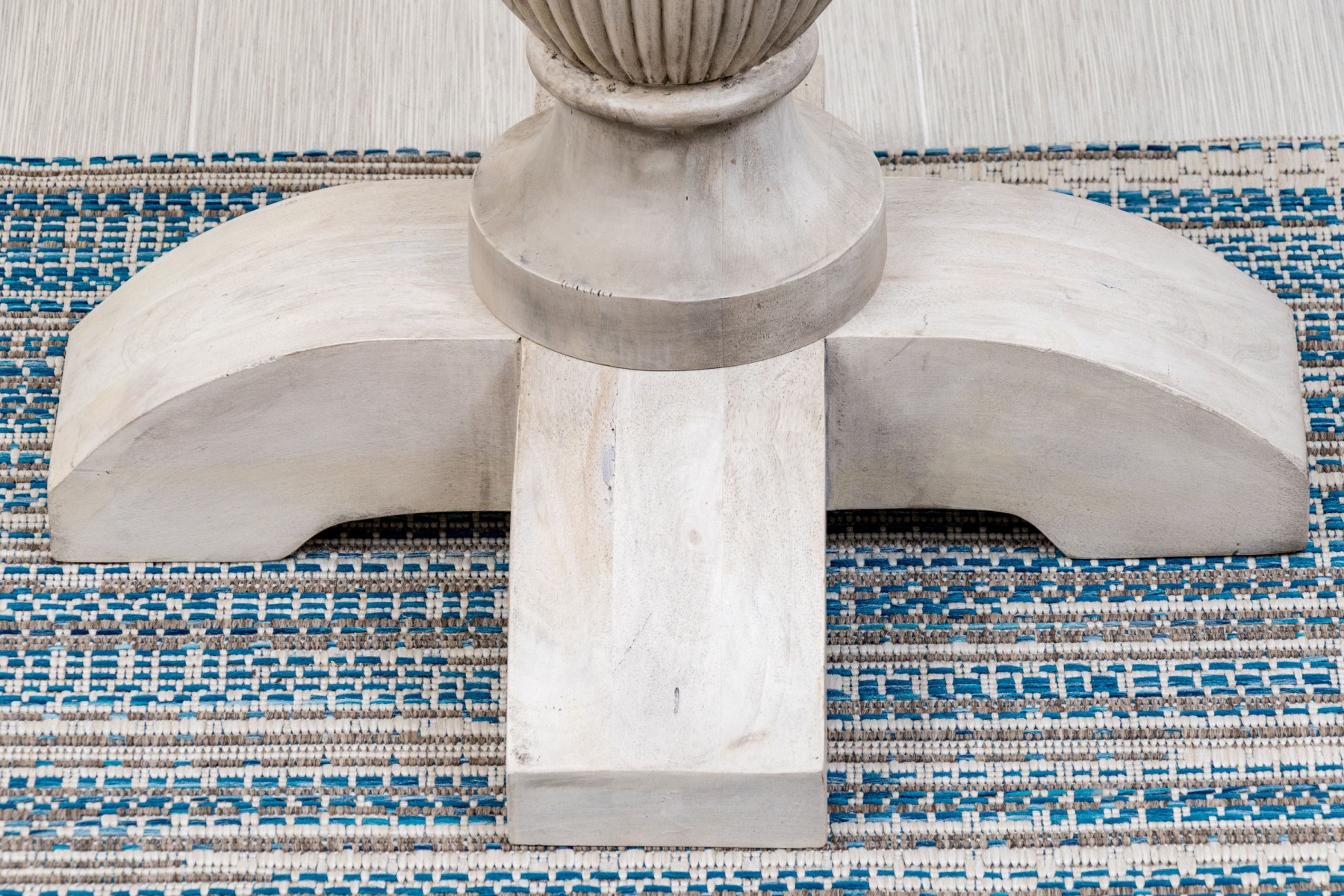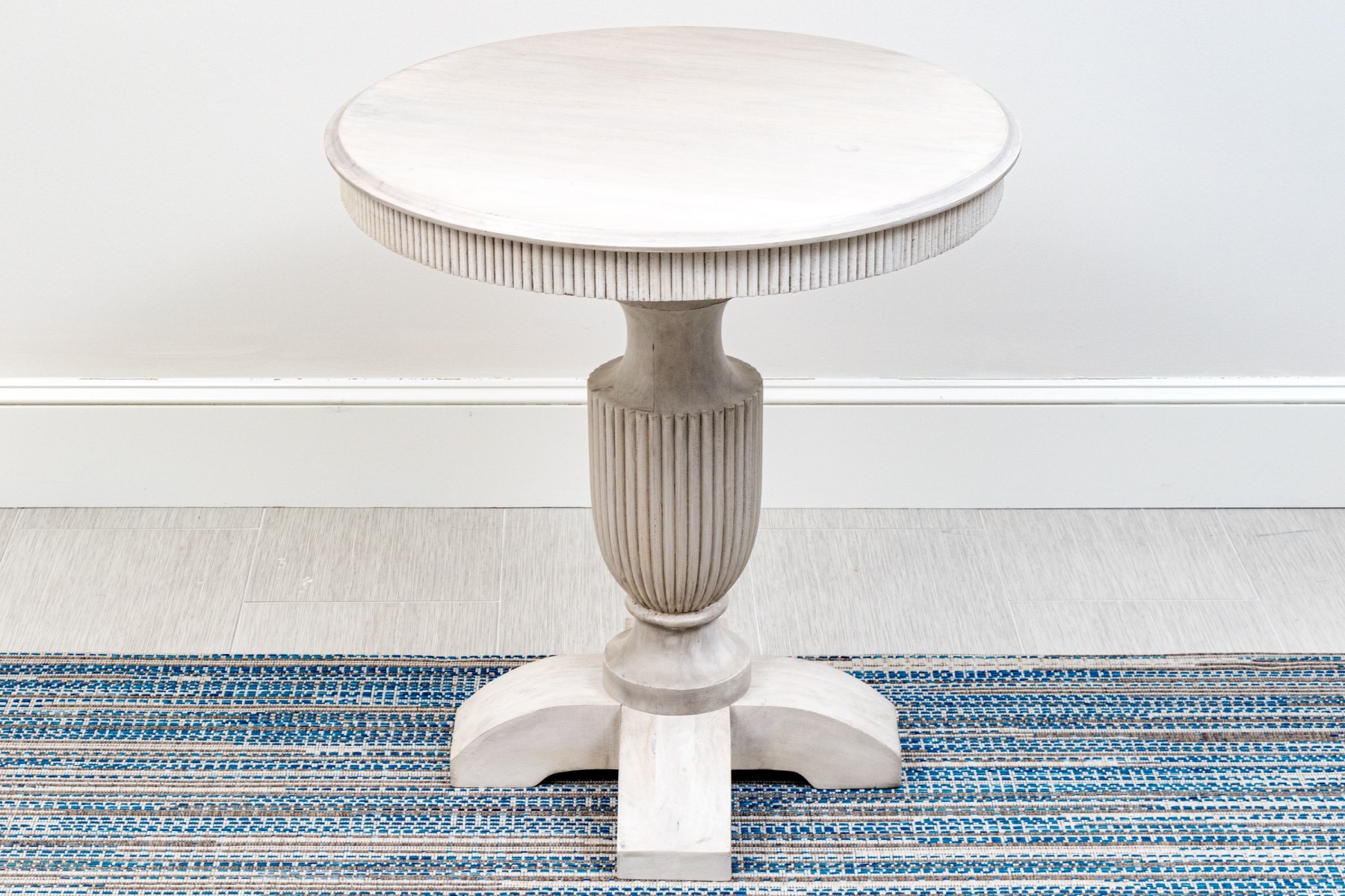 Standing on four carved feet, the pedestal table has an urn form pedestal with carved reeded outer decoration and is surmounted with the tables circular top with matching carved reeded apron. The whole pedestal table in a wonderful rustic, antiqued white finish.