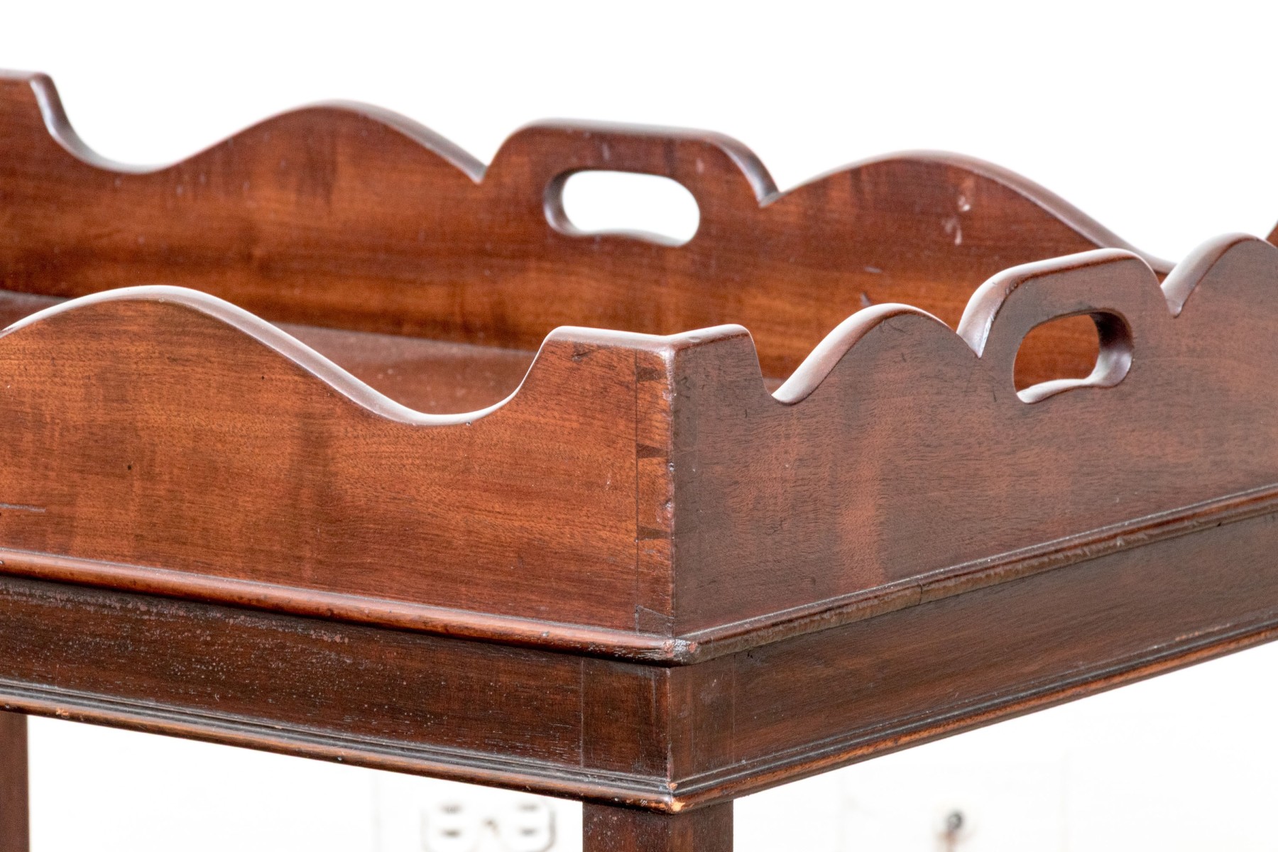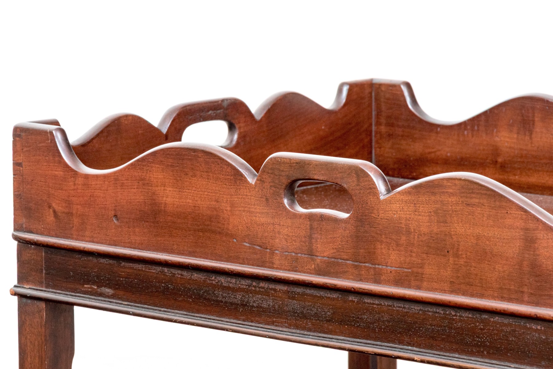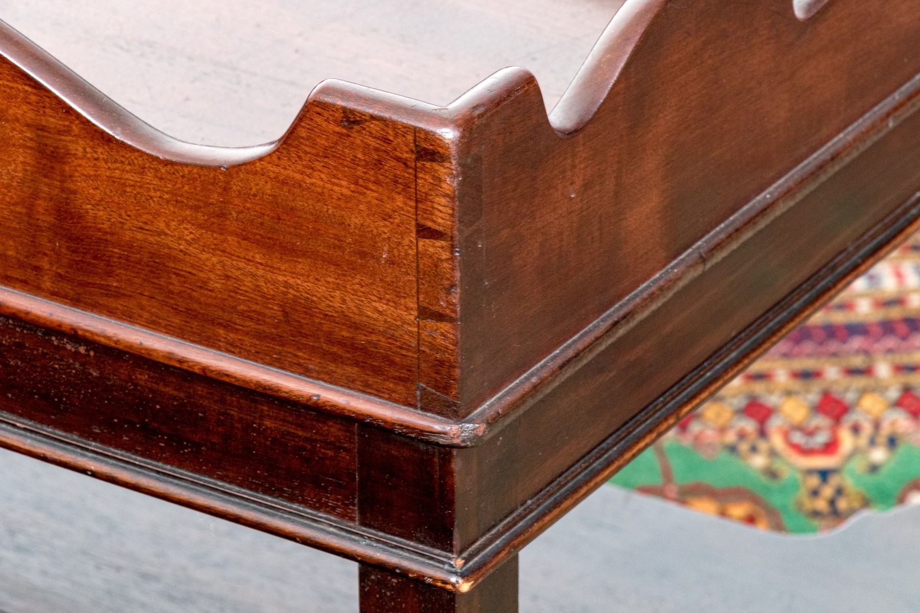 A charming accent table raised on four legs with rectangular tray top with scalloped gallery with an intrinsically carved handle to all four sides. Beautiful exposed corner dovetail joints.