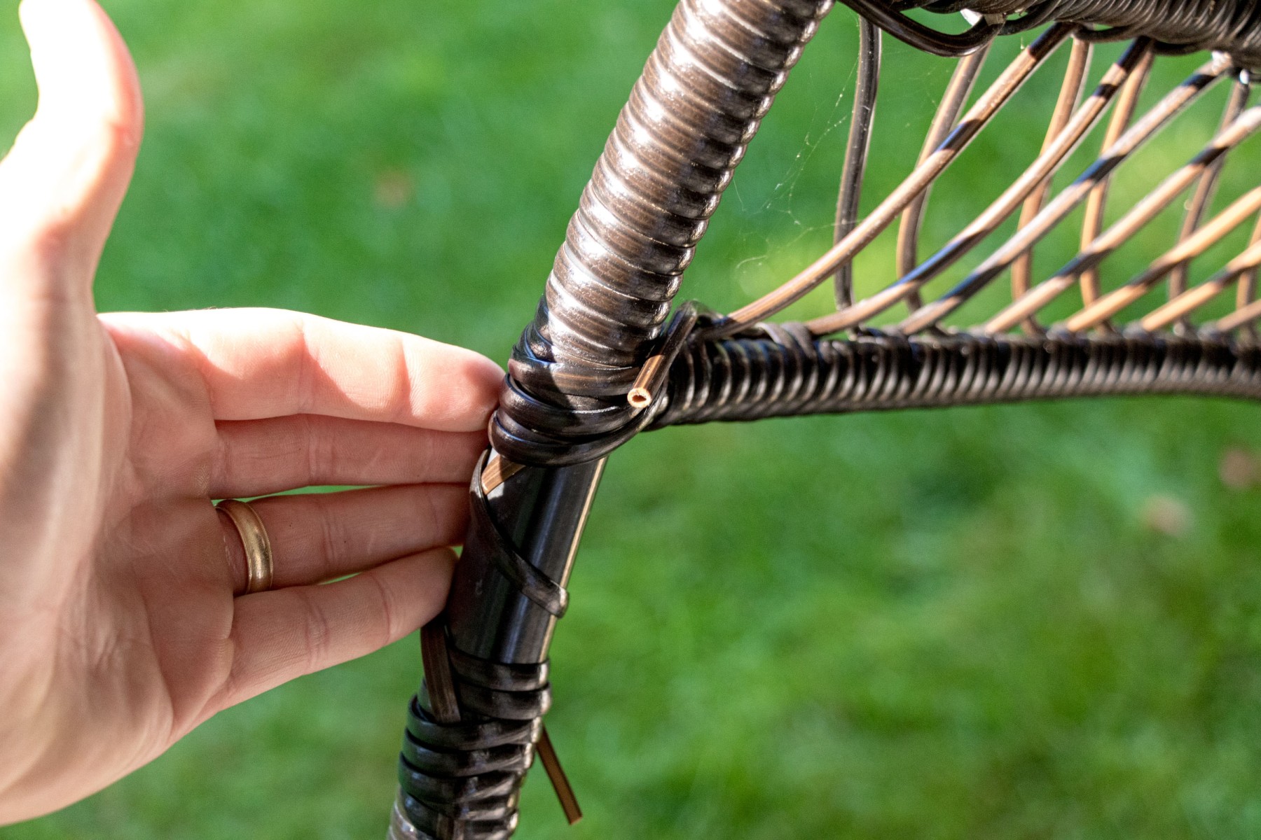 A delightful outdoor hanging egg chair in brown resin wicker, showcasing a rounded form with a woven canopy top and arms with cup holders to the sides. Made comfortable with a cream tufted cushion rounding from the back to the seat. Hangs from a chain.
