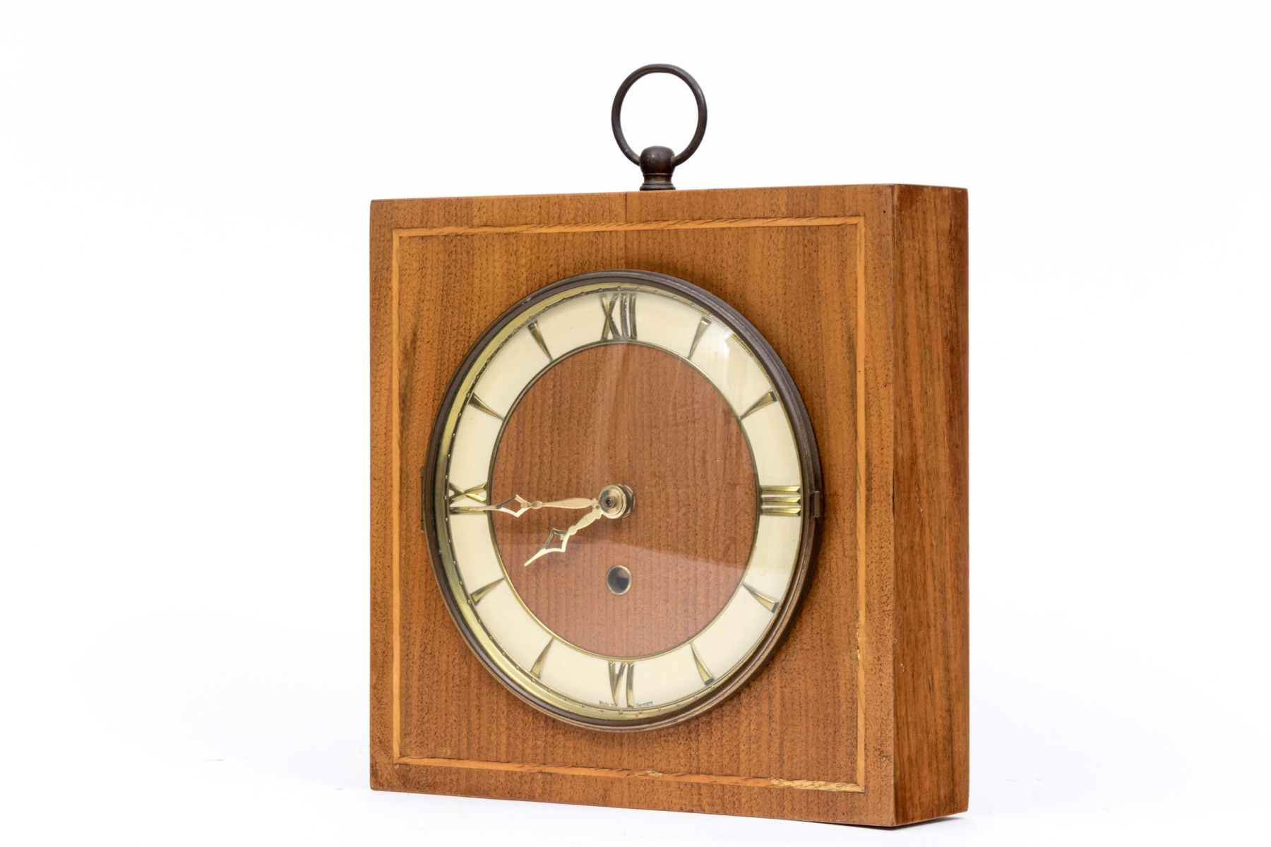 Wooden case with sting inlay. Hinged glass case with brass surround with Roman Numerals with hour and minute hand with loop atop. Screwed backing.