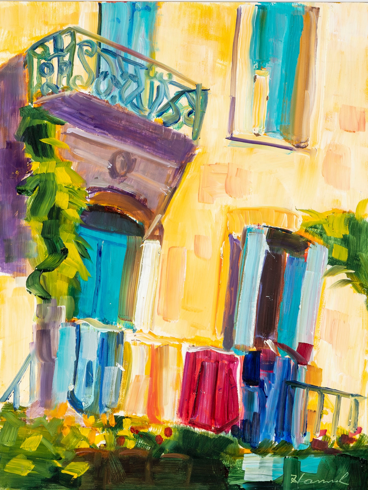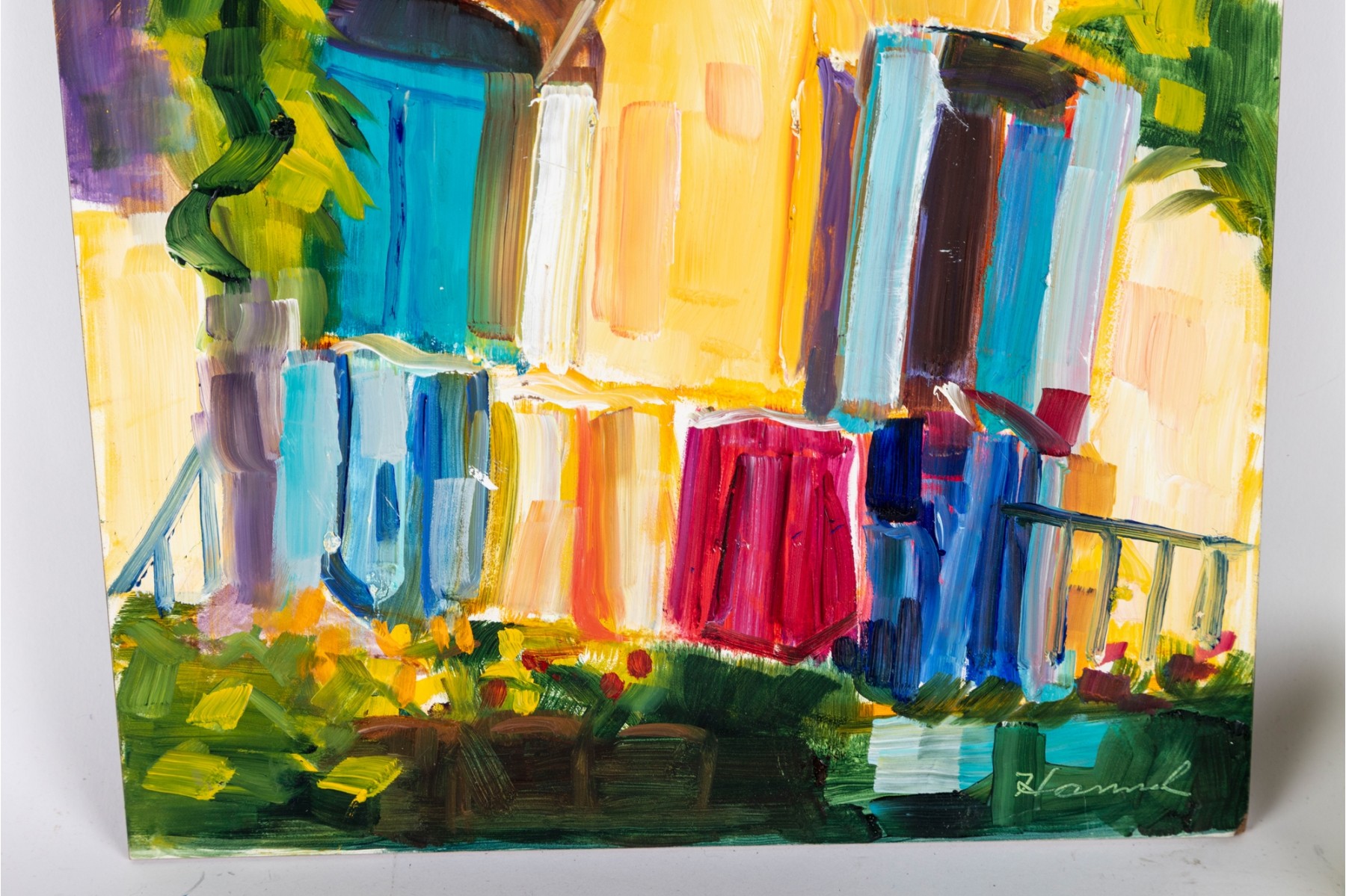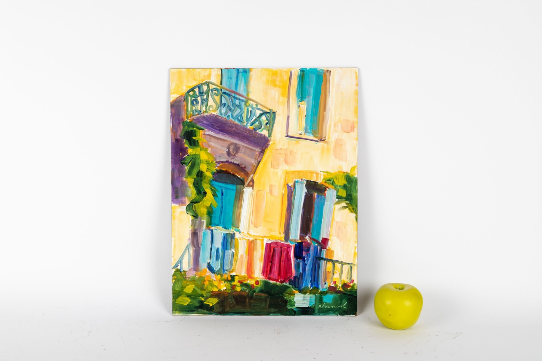 An lovely oil n art board painting by contemporary American artist Hannah Cole Buie (B. 1955), depicting a charming sunlit street scene in Brantôme, a picturesque village in southwestern France -- displaying a balcony front with hanging laundry. The artwork is presented without a frame.