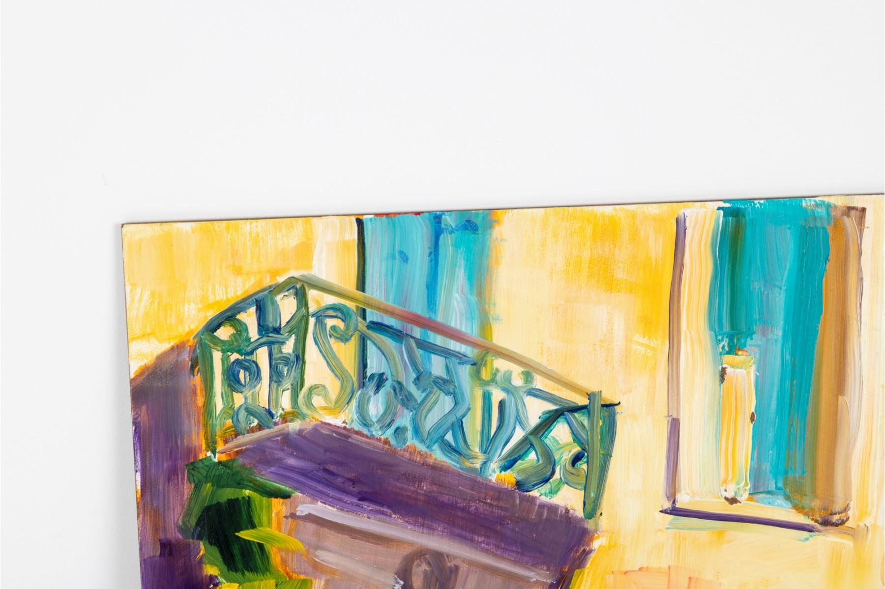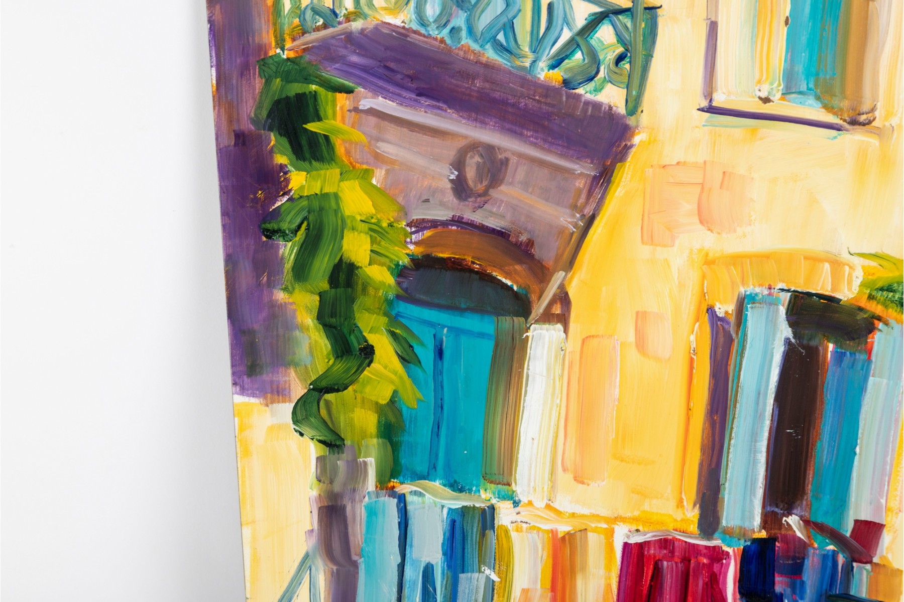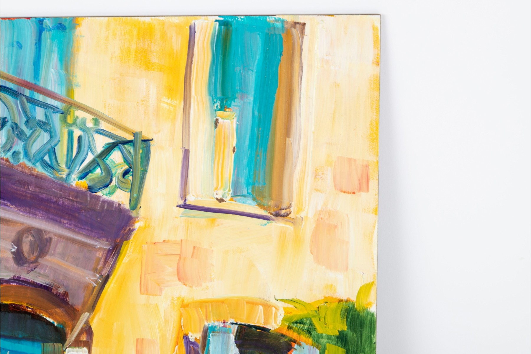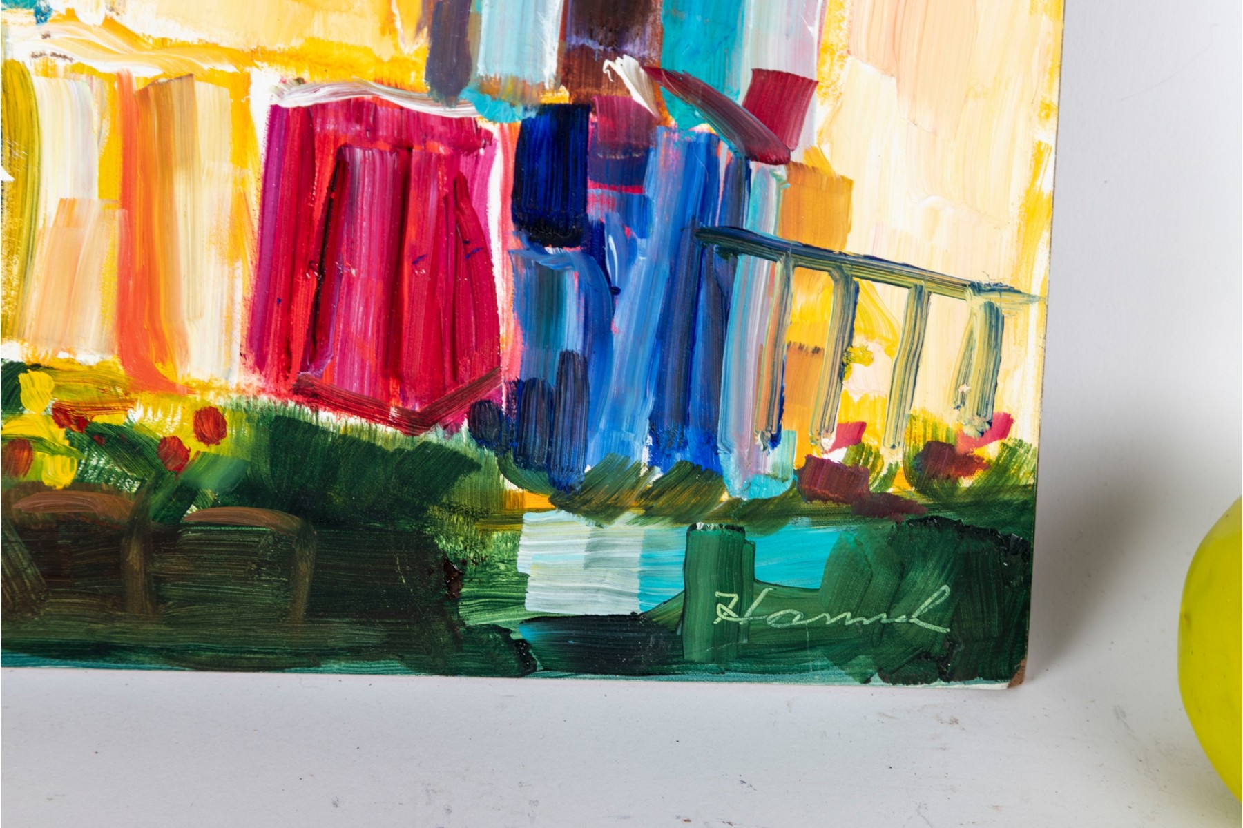 An lovely oil n art board painting by contemporary American artist Hannah Cole Buie (B. 1955), depicting a charming sunlit street scene in Brantôme, a picturesque village in southwestern France -- displaying a balcony front with hanging laundry. The artwork is presented without a frame.