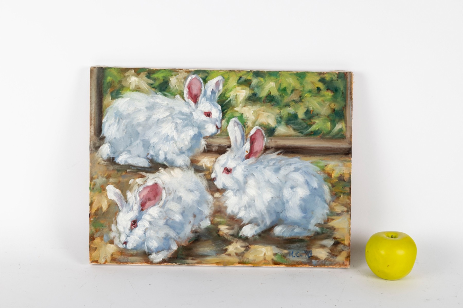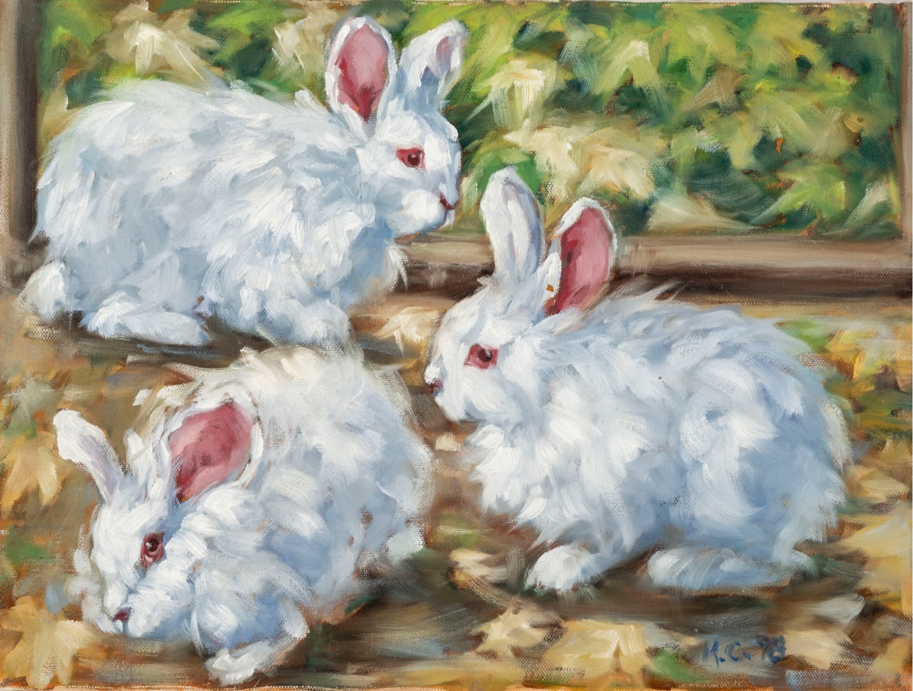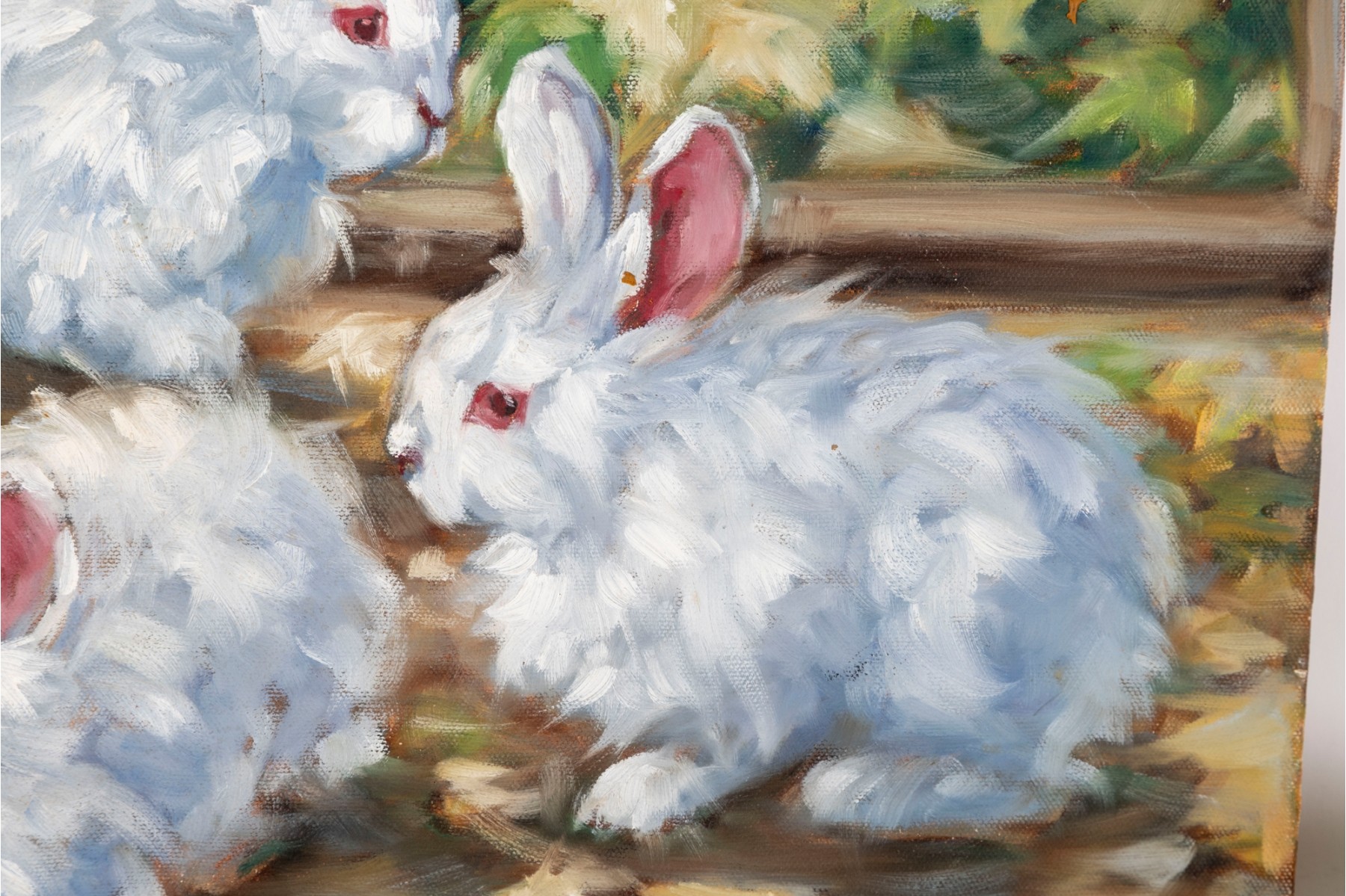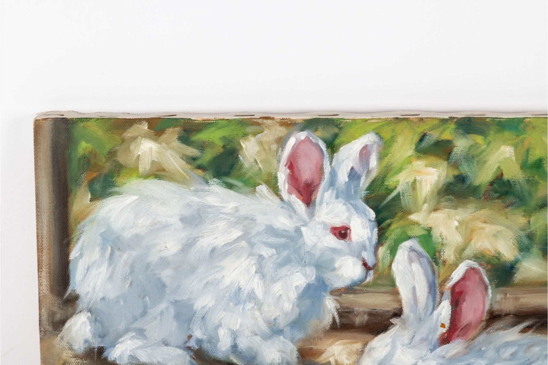 Hannah Cole Buie (American, B. 1955) oil on canvas painting aptly named "Angola Bunnies" which displays the small mammals roaming behind a lush, painterly backdrop. The painting is presented unframed.